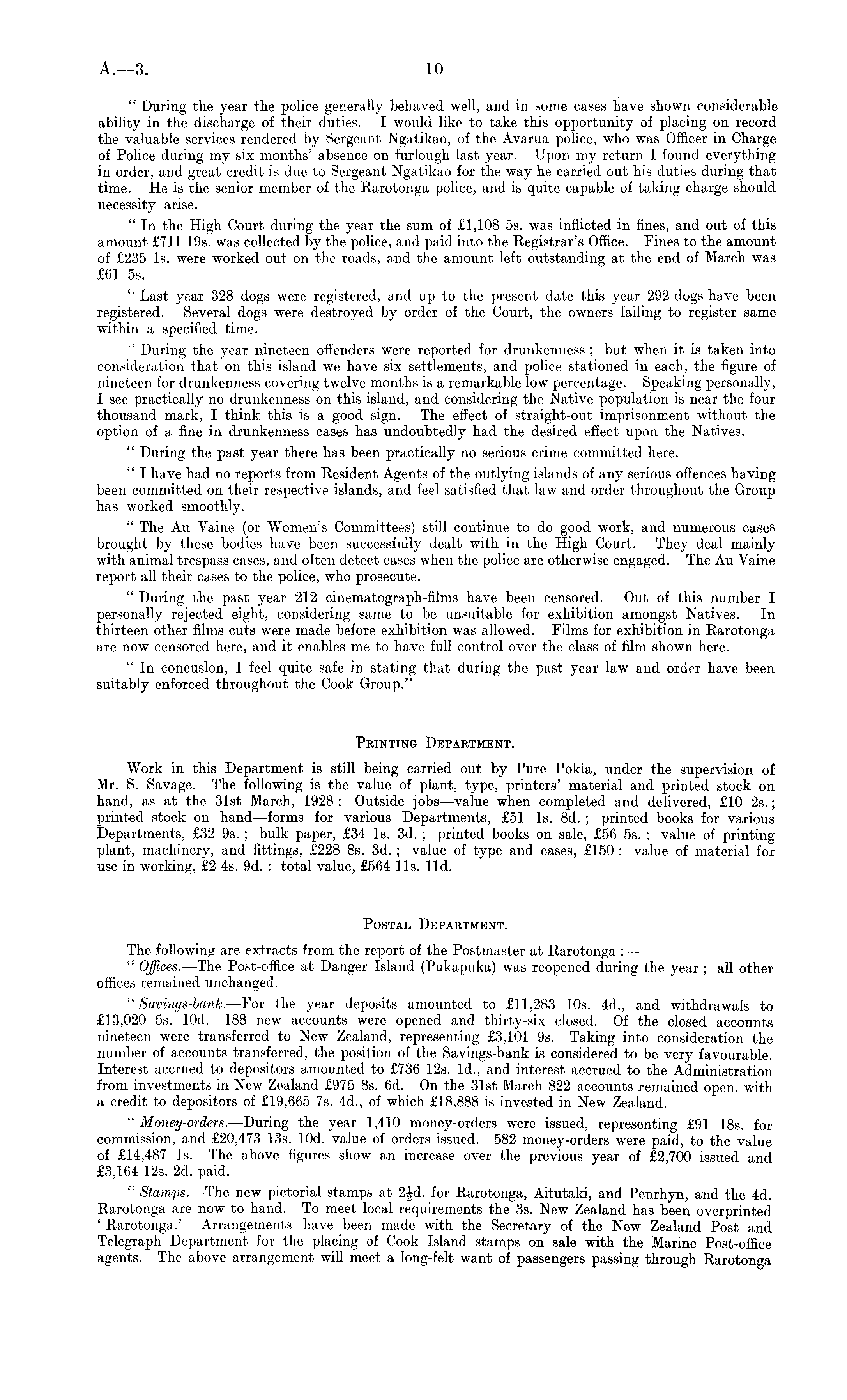 " During the year the police generally behaved well, and in some cases have shown considerable ability in the discharge of their duties. I would like to take this opportunity of placing on record the valuable services rendered by Sergeant Ngatikao, of the Avarua police, who was Officer in Charge of Police during my six months' absence on furlough last year. Upon my return I found everything in order, and great credit is due to Sergeant Ngatikao for the way he carried out his duties during that time. He is the senior member of the Rarotonga police, and is quite capable of taking charge should necessity arise. " In the High Court during the year the sum of £1,108 ss. was inflicted in fines, and out of this amount £711 19s. was collected by the police, and paid into the Registrar's Office. Fines to the amount of £235 Is. were worked out on the roads, and the amount left outstanding at the end of March was £61 ss. " Last year 328 dogs were registered, and up to the present date this year 292 dogs have been registered. Several dogs were destroyed by order of the Court, the owners failing to register same within a specified time. " During the year nineteen offenders were reported for drunkenness ; but when it is taken into consideration that on this island we have six settlements, and police stationed in each, the figure of nineteen for drunkenness covering twelve months is a remarkable low percentage. Speaking personally, I see practically no drunkenness on this island, and considering the Native population is near the four thousand mark, I think this is a good sign. The effect of straight-out imprisonment without the option of a fine in drunkenness cases has undoubtedly had the desired effect upon the Natives. " During the past year there has been practically no serious crime committed here. " I have had no reports from Resident Agents of the outlying islands of any serious offences having been committed on their respective islands, and feel satisfied that law and order throughout the Group has worked smoothly. " The Au Yaine (or Women's Committees) still continue to do good work, and numerous cases brought by these bodies have been successfully dealt with in the High Court. They deal mainly with animal trespass cases, and often detect cases when the police are otherwise engaged. The Au Yaine report all their cases to the police, who prosecute. " During the past year 212 cinematograph-films have been censored. Out of this number I personally rejected eight, considering same to be unsuitable for exhibition amongst Natives. In thirteen other films cuts were made before exhibition was allowed. Films for exhibition in Rarotonga are now censored here, and it enables me to have full control over the class of film shown here. " In concuslon, I feel quite safe in stating that during the past year law and order have been suitably enforced throughout the Cook Group." Printing Department. Work in this Department is still being carried out by Pure Pokia, under the supervision of Mr. S. Savage. The following is the value of plant, type, printers' material and printed stock on hand, as at the 31st March, 1928 : Outside jobs—value when completed and delivered, £10 25.; printed stock on hand —forms for various Departments, £51 Is. Bd. ; printed books for various Departments, £32 9s. ; bulk paper, £34 Is. 3d. ; printed books on sale, £56 ss. ; value of printing plant, machinery, and fittings, £228 Bs. 3d. ; value of type and cases, £150 ; value of material for use in working, £2 4s. 9d. : total value, £564 lis. lid. Postal Department. The following are extracts from the report of the Postmaster at Rarotonga : — " Offices. —The Post-office at Danger Island (Pukapuka) was reopened during the year ; all other offices remained unchanged. " Savings-bank. —For the year deposits amounted to £11,283 10s. 4d., and withdrawals to £13,020 ss. lOd. 188 new accounts were opened and thirty-six closed. Of the closed accounts nineteen were transferred to New Zealand, representing £3,101 9s. Taking into consideration the number of accounts transferred, the position of the Savings-bank is considered to be very favourable. Interest accrued to depositors amounted to £736 12s. Id., and interest accrued to the Administration from investments in New Zealand £975 Bs. 6d. On the 31st March 822 accounts remained open, with a credit to depositors of £19,665 7s. 4d., of which £18,888 is invested in New Zealand. " Money-orders. —During the year 1,410 money-orders were issued, representing £91 18s. for commission, and £20,473 13s. lOd. value of orders issued. 582 money-orders were paid, to the value of £14,487 Is. The above figures show an increase over the previous year of £2,700 issued and £3,164 12s. 2d. paid. " Stamps. —The new pictorial stamps at 2fd. for Rarotonga, Aitutaki, and Penrhyn, and the 4d. Rarotonga are now to hand. To meet local requirements the 3s. New Zealand has been overprinted ' Rarotonga.' Arrangements have been made with the Secretary of the New Zealand Post and Telegraph Department for the placing of Cook Island stamps on sale with the Marine Post-office agents. The above arrangement will meet a long-felt want of passengers passing through Rarotonga