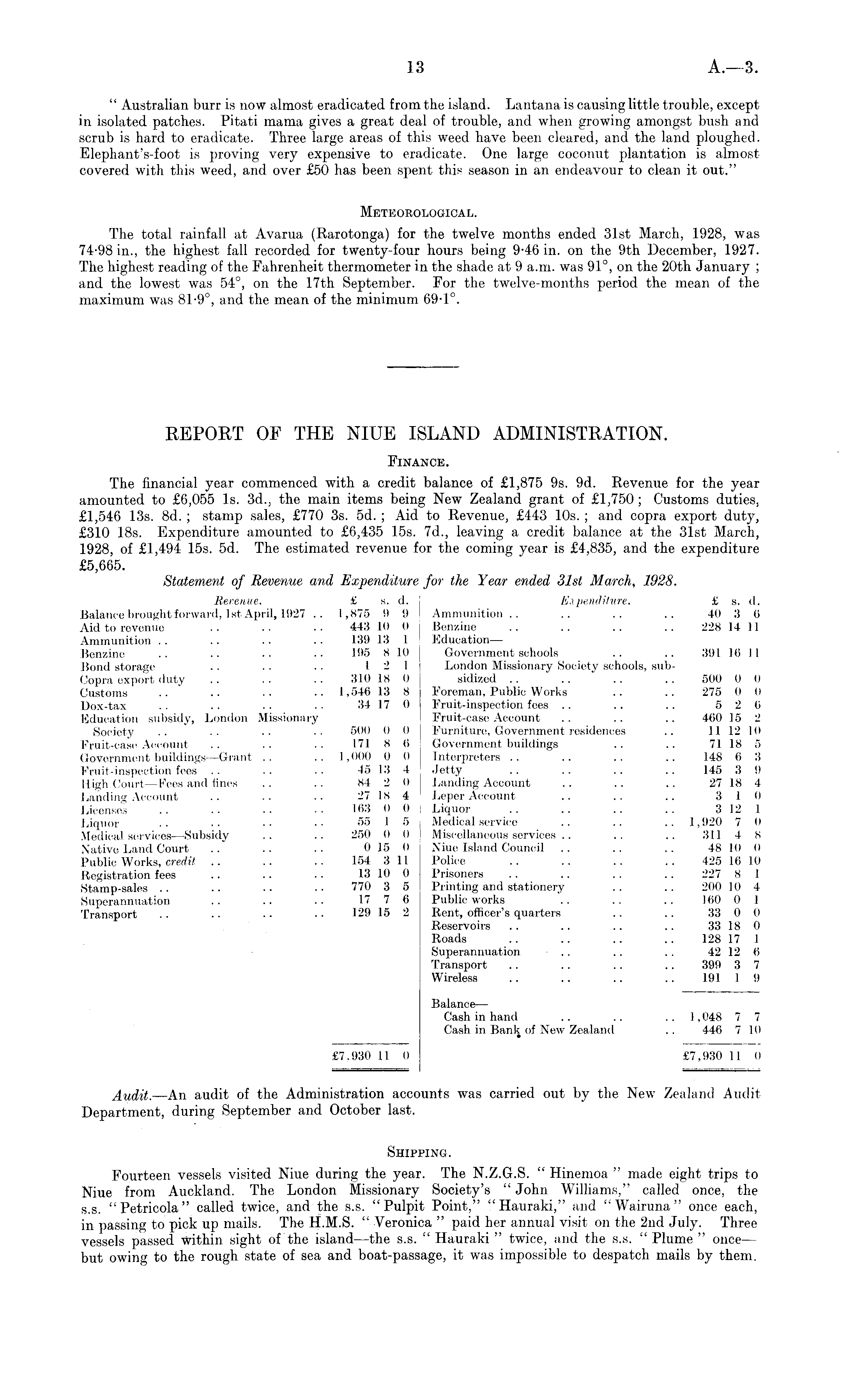 REPORT OF THE NIUE ISLAND ADMINISTRATION. Finance. The financial year commenced with a credit balance of £1,875 9s. 9d. Revenue for the year amounted to £6,055 Is. 3d., the main items being New Zealand grant of £1,750 ; Customs duties, £1,546 13s. Bd. ; stamp sales, £770 3s. 5d.; Aid to Revenue, £443 10s. ; and copra export duty, £310 18s. Expenditure amounted to £6,435 15s. 7d., leaving a credit balance at the 31st March, 1928, of £1,494 15s. sd. The estimated revenue for the coming year is £4,835, and the expenditure £5,665. Statement of Revenue and Expenditure for the Year ended 31st March, 1928. Revenue,. £ s. d. Expenditure. £ s. d. Balance brought forward, Ist April, 1927 .. 1,875 9 9 Ammunition .. .. .. .. 40 3 6 Aid to revenue . . .. . ■ 443 10 0 Benzine .. .. .. .. 228 14 11 Ammunition .. .. .. .. 139 13 1 Education — Benzine .. .. •• •• 195 8 10 Government schools .. .. 391 16 11 Bond storage .. .. . ■ 12 1 London Missionary Society schools, subCopra export duty .. .. .. 310 18 0 sidized .. .. .. .. 500 0 0 Customs .. .. .. •• 1,546 13 8 Foreman, Public Works .. .. 275 0 0 Dox-tax . . .. . . . . 34 17 0 Fruit-inspection fees .. .. .. 5 2 6 Education subsidy, London Missionary Fruit-case Account .. .. .. 460 15 2 Society .. .. • • • • 500 0 0 Furniture, Government residences .. 1112 10 Fruit-case Account .. .. .. 171 8 6 Government buildings .. .. 71 18 5 Government buildings—Grant .. .. 1,000 0 0 Interpreters .. .. .. .. 148 6 3 Fruit-inspection fees . . .. .. 45 13 4 Jetty .. .. .. .. 145 3 9 High Court —Fees and fines .. .. 84 2 0 Landing Account .. .. .. 27 18 4 Landing Account .. .. .. 27 18 4 Leper Account .. .. .. 3 10 Licenses .. .. • • ■ • 163 0 0 Liquor .. .. .. .. 312 1 Liquor .. • • • • • • 55 1 5 Medical service .. .. 1,920 7 0 Medical services—Subsidy .. .. 250 0 0 Miscellaneous services .. .. .. 311 4 8 Native Land Court .. .. . • 015 0 Niue Island Council .. .. .. 48 10 0 Public Works, credit .. ■■ ■ ■ 154 3 11 Police .. .. .. .. 425 16 10 Registration fees .. .. •. 13 10 0 Prisoners .. .. .. .. 227 8 1 Stamp-sales .. .. •. • • 770 3 5 Printing and stationery .. .. 200 10 4 Superannuation .. .. .. 17 7 6 Public works .. .. .. 160 0 1 Transport .. .. • ■ • • 129 15 2 Rent, officer's quarters .. .. 33 0 0 Reservoirs .. .. .. .. 33 18 0 Roads .. .. .. .. 128 17 1 Superannuation .. .. .. 42 12 6 Transport .. .. .. .. 399 3 7 Wireless .. .. .. .. 191 1 9 Balance— Cash in hand .. .. 1,048 7 7 Cash in Bank of New Zealand .. 446 7 10 £7,930 110 £7,930 11 0 Audit. —An audit of the Administration accounts was carried out by the New Zealand Audit Department, during September and October last. Shipping. Fourteen vessels visited Niue during the year. The N.Z.G.S. " Hinemoa " made eight trips to Niue from Auckland. The London Missionary Society's "John Williams," called once, the s.s. "Petricola" called twice, and the s.s. "Pulpit Point," "Hauraki," and "Wairuna" once each, in passing to pick up mails. The H.M.S. " Veronica " paid her annual visit on the 2nd July. Three vessels passed within sight of the island —the s.s. "Hauraki" twice, and the s.s. " Plume " once — but owing to the rough state of sea and boat-passage, it was impossible to despatch mails by them.