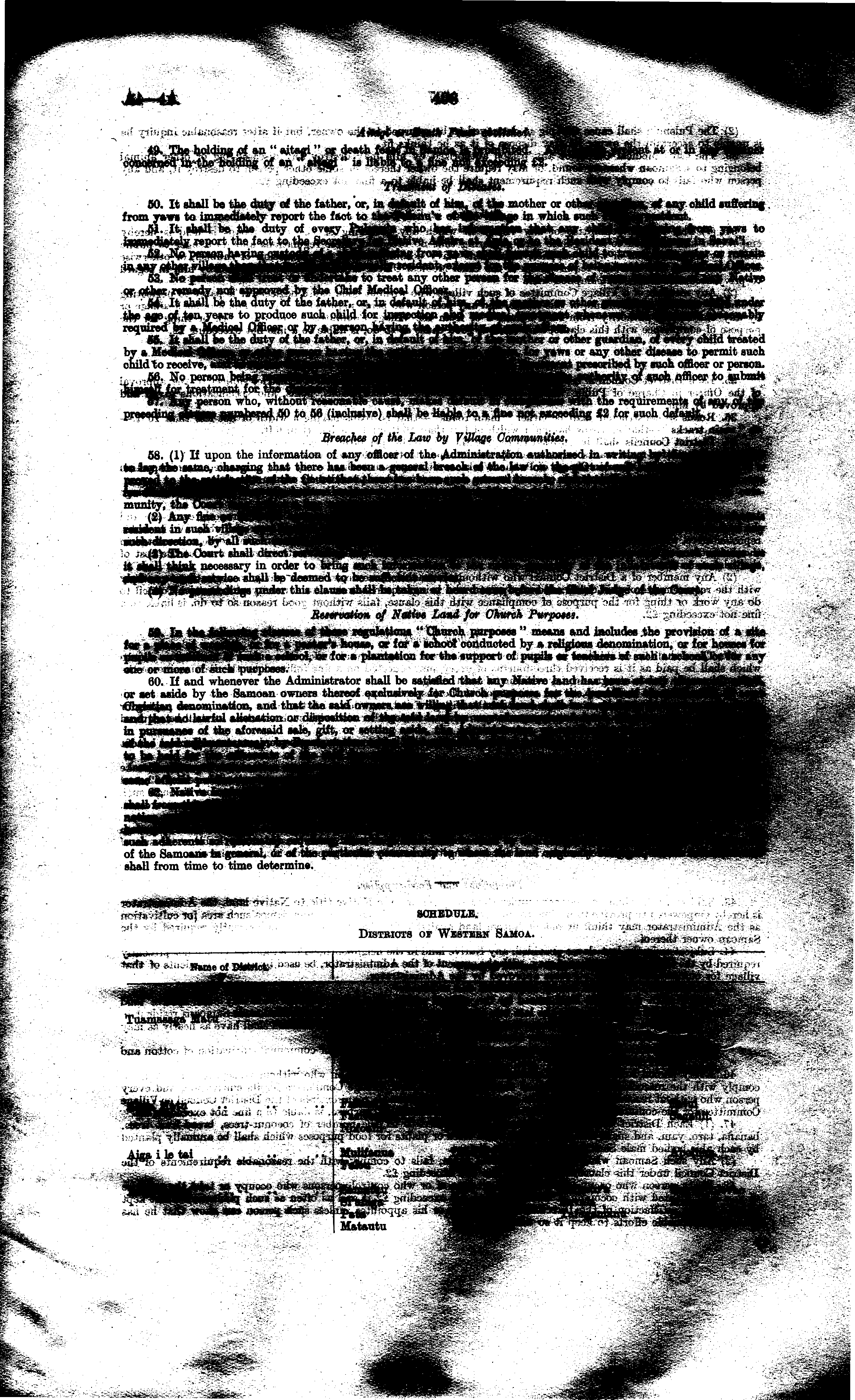 Aitagi or Death Feast abolished. 49. The holding of an " aitagi "or death feast in Samoa is prohibited. Any person present at or in any manner concerned in the holding of an " aitagi " is liable to a fine not exceeding £2. Treatment of Diseases. 50. It shall be the duty of the father, or, in default of him, of the mother or other guardian, of any child suffering from yaws to immediately report the fact to the Pulenu'u of the village in which such child is resident. 51. It shall be the duty of every Pulenu'u who has information that any child is suffering from yaws to immediately report the fact to the Secretary for Native Affairs at Apia or to the Resident Commissioner in Savai'i. 52. No person having custody of a child suffering from yaws shall permit such child to travel or to enter or remain in any other village than that in which it is usually resident, except for the purpose of being treated by a Medical Officer. 53. No person shall treat or undertake to treat any other person for the disease of yaws by means of any Native or other remedy not approved by the Chief Medical Officer. 54. It shall be the duty of the father, or, in default of him, of the mother or other guardian, of every child under the age of ten years to produce such child for inspection and medical treatment whenever and wherever reasonably required by a Medical Officer or by a person having the authority of such officer. 55. It shall be the duty of the father, or, in default of him, of the mother or other guardian, of every child treated by a Medical Officer, or other person having the authority of such officer, for yaws or any other disease to permit such child to receive, and to secure that such child undergoes the full course of treatment prescribed by such officer or person. 56. No person being required by a Medical Officer or other person having the authority of such officer to submit himself for treatment for the disease of yaws shall refuse or neglect so to do. 57. Any person who, without reasonable cause, makes default in compliance with the requirements of any of the preceding clauses numbered 50 to 56 (inclusive) shall be liable to a fine not exceeding £2 for such default. Breaches of the Law by Village Communities. 58. (1) If upon the information of any officer of the Administration authorized in writing by the Administrator to lay the same, charging that there has been a general breach of the law on the part of any village community, it is proved to the satisfaction of the Court that there has been such general breach, and that there is no reasonable excuse for such breach, and that the law so broken was or reasonably might have been generally known among such community, the Court may inflict a fine not exceeding £25 in respect of such breach. (2) Any fine so inflicted or any unpaid balance thereof shall be deemed to be payable by such of the matais resident in such village and in such proportion as the Court shall from time to time direct, or, in the absence of any such direction, by all such matais in equal proportions. (3) The Court shall direct service of any information under this clause upon such person and in such manner as it shall think necessary in order to bring such information to the notice generally of the inhabitants of such village, and any such service shall be deemed to be sufficient service. (4) No proceedings under this clause shall be taken or heard save before the Chief Judge of the Court. Reservation of Native Land for Church Purposes. 59. In the following clauses of these regulations " Church purposes " means and includes the provision of a site for a place of worship, or for a pastor's house, or for a school conducted by a religious denomination, or for houses for pupils or teachers of such a school, or for a plantation for the support of pupils or teachers of such a school, or for any one or more of such purposes. 60. If and whenever the Administrator shall be satisfied that any Native land has been at any time sold, gifted, or set aside by the Samoan owners thereof exclusively for Church purposes for the benefit of the adherents of some Christian denomination, and that the said owners are willing that such land shall be exclusively so used in perpetuity, and that no lawful alienation or disposition of the said land by way of conveyance, lease, or otherwise has been made in pursuance of the aforesaid sale, gift, or setting aside, the Administrator, on application in writing made on behalf of the 3aid adherents, may, by Proclamation under his hand, declare that land to be reserved for Church purposes, and to be held for the adherents of the said denomination. 61. Every Proclamation made under the preceding clause shall be published in the Western Samoa Gazette and in some official publication circulating among Samoans. 62. Native land which has been declared by a Proclamation under clause 60 to be reserved for Church purposes shall from the date of such Proclamation be held by the Crown for the use exclusively of the adherents of the denomination named in such Proclamation for Church purposes for so long as in the opinion of the Administrator there shall be any of such adherents reasonably requiring its use for Church purposes ; and in the event of there ceasing to be any such adherents so reasonably requiring, then such land shall be held by the Crown for such other use for the benefit of the Samoans in general, or of the particular community to whom the land originally belonged, as the Administrator shall from time to time determine. SCHEDULE. Districts of Western Samoa. Name of District. Names of Villages comprised in Districts. Upolu. Tuamasaga Matu .. .. Laulii Vaiala Lepea Malie Letogo Matautu Vailoa Afega Vailele Apia Vaiusu Tuana'i Fagalii Tanugamanono Saina Leauva'a Matafagatele Alamagoto Toamua Saleimoa. Magiagi Vaimoso Faleula Aana Matu .. .. • • Faleasi'u Leulumoega Faleatiu Satui Fasitoouta Fasitootai Satapuala Sagafili. Nofoalii Vailuutai Aiga ile tai .. .. 