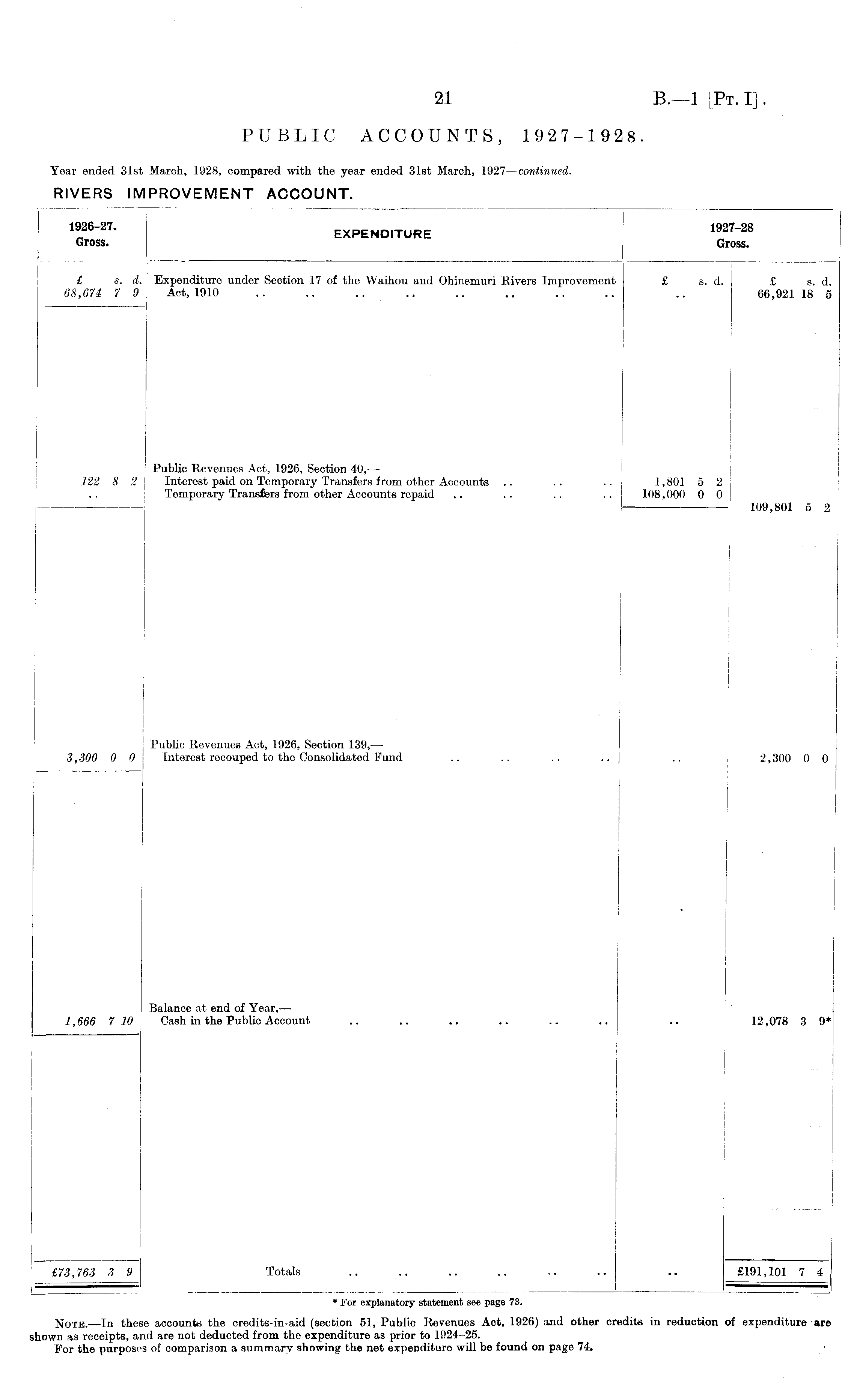 1926-27. I EXPENDITURE 1927 ~ 28 Gross. Gross. £ s. d. Expenditure under Section 17 of the Waihou and Ohinemuri Rivers Improvement £ s. d. £ s. d. 68,674 7 9 Act, 1910 .. .. .. .. .. .. .. .. .. 66,921 18 5 ' I Public Revenues Act, 1926, Section 40, —■ 122 8 2 I Interest paid on Temporary Transfers from other Accounts .. .. .. 1,801 5 2 Temporary Transfers from other Accounts repaid .. .. .. .. 108,000 0 0 j 109,801 5 2 ' * l ' Public Revenues Act, 1926, Section 139, — 3,300 0 0 Interest recouped to the Consolidated Fund .. .. . . .. | .. 2,300 0 0 ' Balance at end of Year, — 1,666 7 10 Cash in the Public Account .. .. .. .. .. .. .. 12,078 3 9*' ! ! . £73,763 3 9 Totals .. .. .. .. .. .. .. £191,101 7 4 * For explanatory statement see page 73. Note. —In these accounts the credits-in-aid (section 51, Public Revenues Act, 1926) and other credits in reduction of expenditure are shown as receipts, and are not deducted from the expenditure as prior to 1924-25. For the purposos of comparison a summary showing the net expenditure will be found on page 74.
