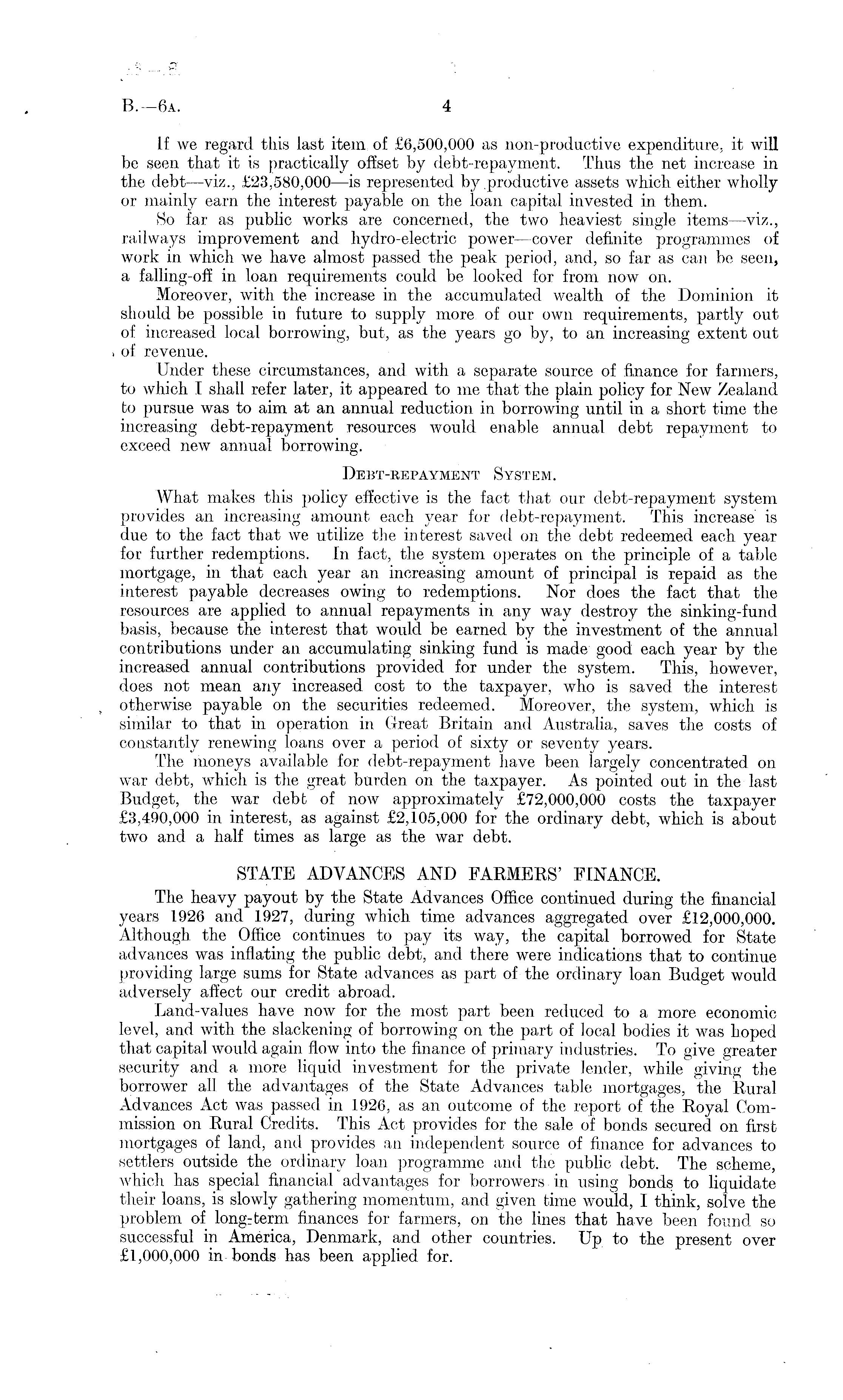 if we regard this last item of £6,500,000 as non-productive expenditure, it will be seen that it is practically offset by debt-repayment. Thus the net increase in the debt—viz., £23,580,000 —is represented by productive assets which either wholly or mainly earn the interest payable on the loan capital invested in them. So far as public works are concerned, the two heaviest single items —viz., railways improvement and hydro-electric power —cover definite programmes of work in which we have almost passed the peak period, and, so far as can be seen, a falling-oft in loan requirements could be looked for from now on. Moreover, with the increase in the accumulated wealth of the Dominion it should be possible in future to supply more of our own requirements, partly out of increased local borrowing, but, as the years go by, to an increasing extent out of revenue. Under these circumstances, and with a separate source of finance for farmers, to which 1 shall refer later, it appeared to me that the plain policy for New Zealand to pursue was to aim at an annual reduction in borrowing until in a short time the increasing debt-repayment resources would enable annual debt repayment to exceed new annual borrowing. Debt-repayment System. What makes this policy effective is the fact that our debt-repayment system provides an increasing amount each year for debt-repayment. This increase is due to the fact that we utilize the interest saved on the debt redeemed each year for further redemptions. In fact, the system operates on the principle of a table mortgage, in that each year an increasing amount of principal is repaid as the interest payable decreases owing to redemptions. Nor does the fact that the resources are applied to annual repayments in any way destroy the sinking-fund basis, because the interest that would be earned by the investment of the annual contributions under an accumulating sinking fund is made good each year by the increased annual contributions provided for under the system. This, however, does not mean any increased cost to the taxpayer, who is saved the interest otherwise payable on the securities redeemed. Moreover, the system, which is similar to that in operation in Great Britain and Australia, saves the costs of constantly renewing loans over a period of sixty or seventy years. The moneys available for debt-repayment have been largely concentrated on war debt, which is the great burden on the taxpayer. As pointed out in the last Budget, the war debt of now approximately £72,000,000 costs the taxpayer £3,490,000 in interest, as against £2,105,000 for the ordinary debt, which is about two and a half times as large as the war debt. STATE ADVANCES AND FARMERS' FINANCE. The heavy payout by the State Advances Office continued during the financial years 1926 and 1927, during which time advances aggregated over £12,000,000. Although the Office continues to pay its way, the capital borrowed for State advances was inflating the public debt, and there were indications that to continue providing large sums for State advances as part of the ordinary loan Budget would adversely affect our credit abroad. Land-values have now for the most part been reduced to a more economic level, and with the slackening of borrowing on the part of local bodies it was hoped that capital would again flow into the finance of primary industries. To give greater security and a more liquid investment for the private lender, while giving the borrower all the advantages of the State Advances table mortgages, the Rural Advances Act was passed in 1926, as an outcome of the report of the Royal Commission on Rural Credits. This Act provides for the sale of bonds secured on first mortgages of land, and provides an independent source of finance for advances to settlers outside the ordinary loan programme and the public debt. The scheme, which has special financial advantages for borrowers. in using bonds to liquidate their loans, is slowly gathering momentum, and given time would, I think, solve the problem of longrterm finances for farmers, on the lines that have been found so successful in America, Denmark, and other countries. Up to the present over £1,000,000 in bonds has been applied for.