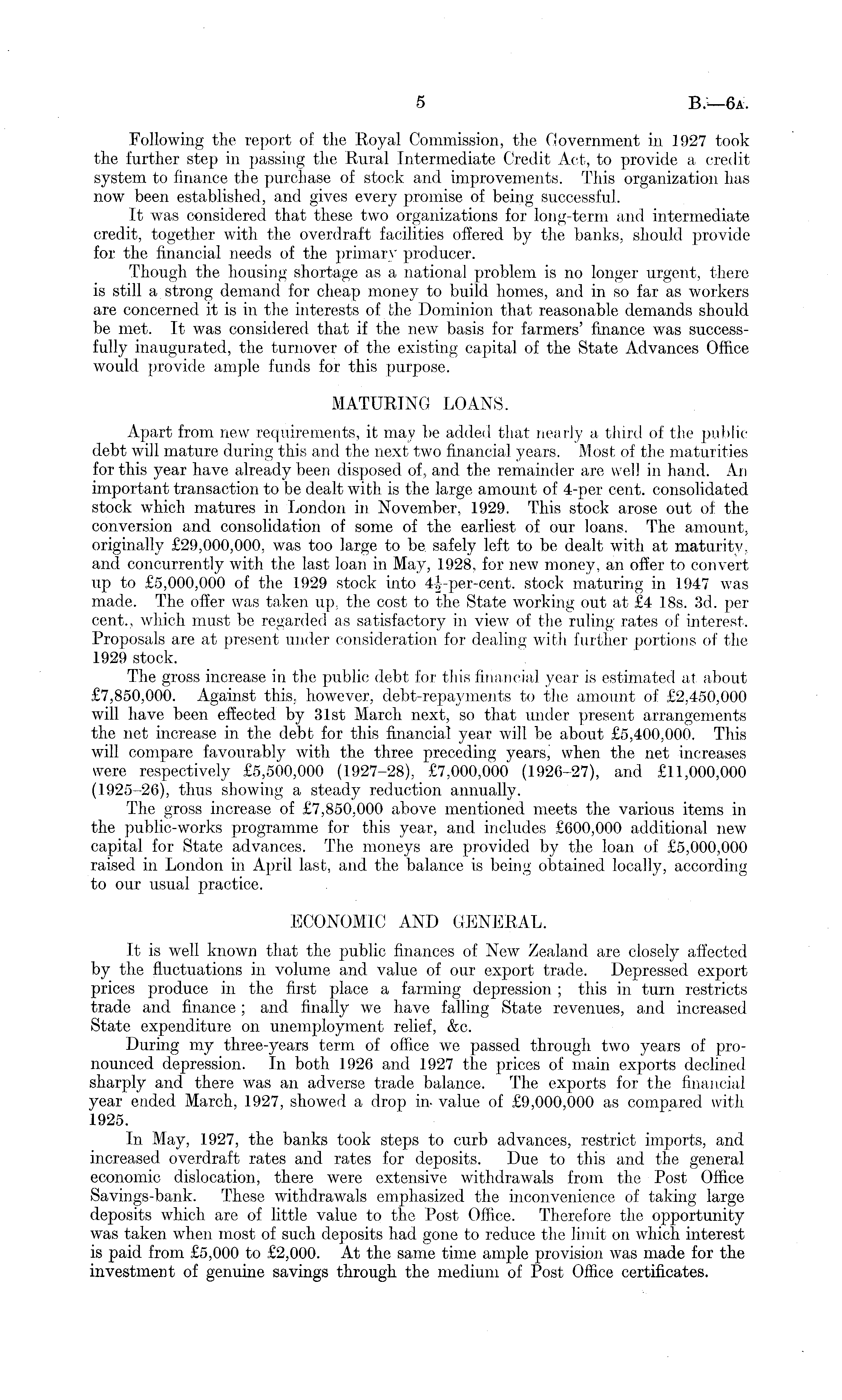 Following the report of the Royal Commission, the Government in 1927 took the further step in passing the Rural Intermediate Credit Act, to provide a credit system to finance the purchase of stock and improvements. This organization has now been established, and gives every promise of being successful. It was considered that these two organizations for long-term and intermediate credit, together with the overdraft facilities offered by the banks, should provide for the financial needs of the primary producer. Though the housing shortage as a national problem is no longer urgent, there is still a strong demand for cheap money to build homes, and in so far as workers are concerned it is in the interests of the Dominion that reasonable demands should be met. It was considered that if the new basis for farmers' finance was successfully inaugurated, the turnover of the existing capital of the State Advances Office would provide ample funds for this purpose. MATURING LOANS. Apart from new requirements, it may be added that nearly a third of the public debt will mature during this and the next two financial years. Most of the maturities for this year have already been disposed of, and the remainder are well in hand. An important transaction to be dealt with is the large amount of 4-per cent, consolidated stock which matures in London in November, 1929. This stock arose out of the conversion and consolidation of some of the earliest of our loans. The amount, originally £29,000,000. was too large to be safely left to be dealt with at maturity, and concurrently with the last loan in May, 1928, for new money, an offer to convert up to £5,000,000 of the 1929 stock into 4|-per-cent. stock maturing in 1947 was made. The offer was taken up, the cost to the State working out at £4 18s. 3d. per cent., which must be regarded as satisfactory in view of the ruling rates of interest. Proposals are at present under consideration for dealing with further portions of the 1929 stock. The gross increase in the public debt for this financial year is estimated at about £7,850,000. Against this, however, debt-repayments to the amount of £2,450,000 will have been effected by 31st March next, so that under present arrangements the net increase in the debt for this financial year will be about £5,400,000. This will compare favourably with the three preceding years, when the net increases were respectively £5,500,000 (1927-28), £7,000,000 (1926-27), and £11,000,000 (1925-26), thus showing a steady reduction annually. The gross increase of £7,850,000 above mentioned meets the various items in the public-works programme for this year, and includes £600,000 additional new capital for State advances. The moneys are provided by the loan of £5,000,000 raised in London in April last, and the balance is being obtained locally, according to our usual practice. ECONOMIC AND GENERAL. It is well known that the public finances of New Zealand are closely affected by the fluctuations in volume and value of our export trade. Depressed export prices produce in the first place a farming depression ; this in turn restricts trade and finance; and finally we have falling State revenues, and increased State expenditure on unemployment relief, &c. During my three-years term of office we passed through two years of pronounced depression. In both 1926 and 1927 the prices of main exports declined sharply and there was an adverse trade balance. The exports for the financial year ended March, 1927, showed a drop in- value of £9,000,000 as compared with 1925. In May, 1927, the banks took steps to curb advances, restrict imports, and increased overdraft rates and rates for deposits. Due to this and the general economic dislocation, there were extensive withdrawals from the Post Office Savings-bank. These withdrawals emphasized the inconvenience of taking large deposits which are of little value to the Post Office. Therefore the opportunity was taken when most of such deposits had gone to reduce the limit on which interest is paid from £5,000 to £2,000. At the same time ample provision was made for the investment of genuine savings through the medium of Post Office certificates.