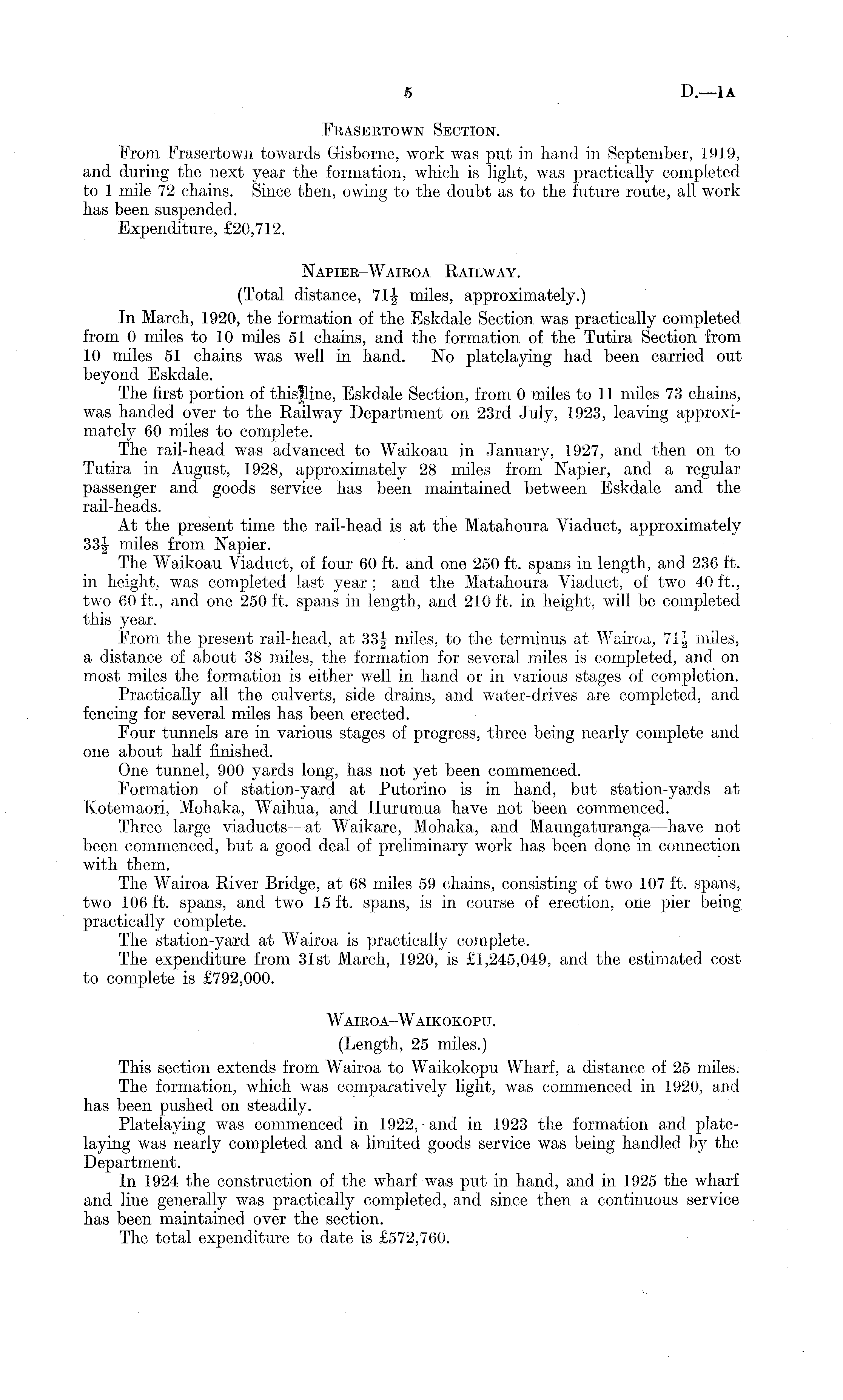Frasertown Section. From Frasertown towards Gisborne, work was put in hand in September, 1919, and during the next year the formation, which is light, was practically completed to 1 mile 72 chains. Since then, owing to the doubt as to the future route, all work has been suspended. Expenditure, £20,712. Napier-Wairoa Railway. (Total distance, 71|- miles, approximately.) In March, 1920, the formation of the Eskdale Section was practically completed from 0 miles to 10 miles 51 chains, and the formation of the Tutira Section from 10 miles 51 chains was well in hand. No platelaying had been carried out beyond Eskdale. The first portion of thislline, Eskdale Section, from 0 miles to 11 miles 73 chains, was handed over to the Railway Department on 23rd July, 1923, leaving approximately 60 miles to complete. The rail-head was advanced to Waikoau in January, 1927, and then on to Tutira in August, 1928, approximately 28 miles from Napier, and a regular passenger and goods service has been maintained between Eskdale and the rail-heads. At the present time the rail-head is at the Matahoura Viaduct, approximately 33| miles from Napier. The Waikoau Viaduct, of four 60 ft. and one 250 ft. spans in length, and 236 ft. in height, was completed last year ; and the Matahoura Viaduct, of two 40 ft., two 60 ft., and one 250 ft. spans in length, and 210 ft. in height, will be completed this year. From the present rail-head, at 33|, miles, to the terminus at Wairoa, 71| miles, a distance of about 38 miles, the formation for several miles is completed, and on most miles the formation is either well in hand or in various stages of completion. Practically all the culverts, side drains, and water-drives are completed, and fencing for several miles has been erected. Four tunnels are in various stages of progress, three being nearly complete and one about half finished. One tunnel, 900 yards long, has not yet been commenced. Formation of station-yard at Putorino is in hand, but station-yards at Kotemaori, Mohaka, Waihua, and Hurumua have not been commenced. Three large viaducts —at Waikare, Mohaka, and Maungaturanga —have not been commenced, but a good deal of preliminary work has been done in connection with them. The Wairoa River Bridge, at 68 miles 59 chains, consisting of two 107 ft. spans, two 106 ft. spans, and two 15 ft. spans, is in course of erection, one pier being practically complete. The station-yard at Wairoa is practically complete. The expenditure from 31st March, 1920, is £1,245,049, and the estimated cost to complete is £792,000. Wairoa-Waikokopu. (Length, 25 miles.) This section extends from Wairoa to Waikokopu Wharf, a distance of 25 miles. The formation, wltich was comparatively light, was commenced in 1920, and has been pushed on steadily. Platelaying was commenced in 1922,-and in 1923 the formation and platelaying was nearly completed and a limited goods service was being handled by the Department. In 1924 the construction of the wharf was put in hand, and in 1925 the wharf and line generally was practically completed, and since then a continuous service has been maintained over the section. The total expenditure to date is £572,760.