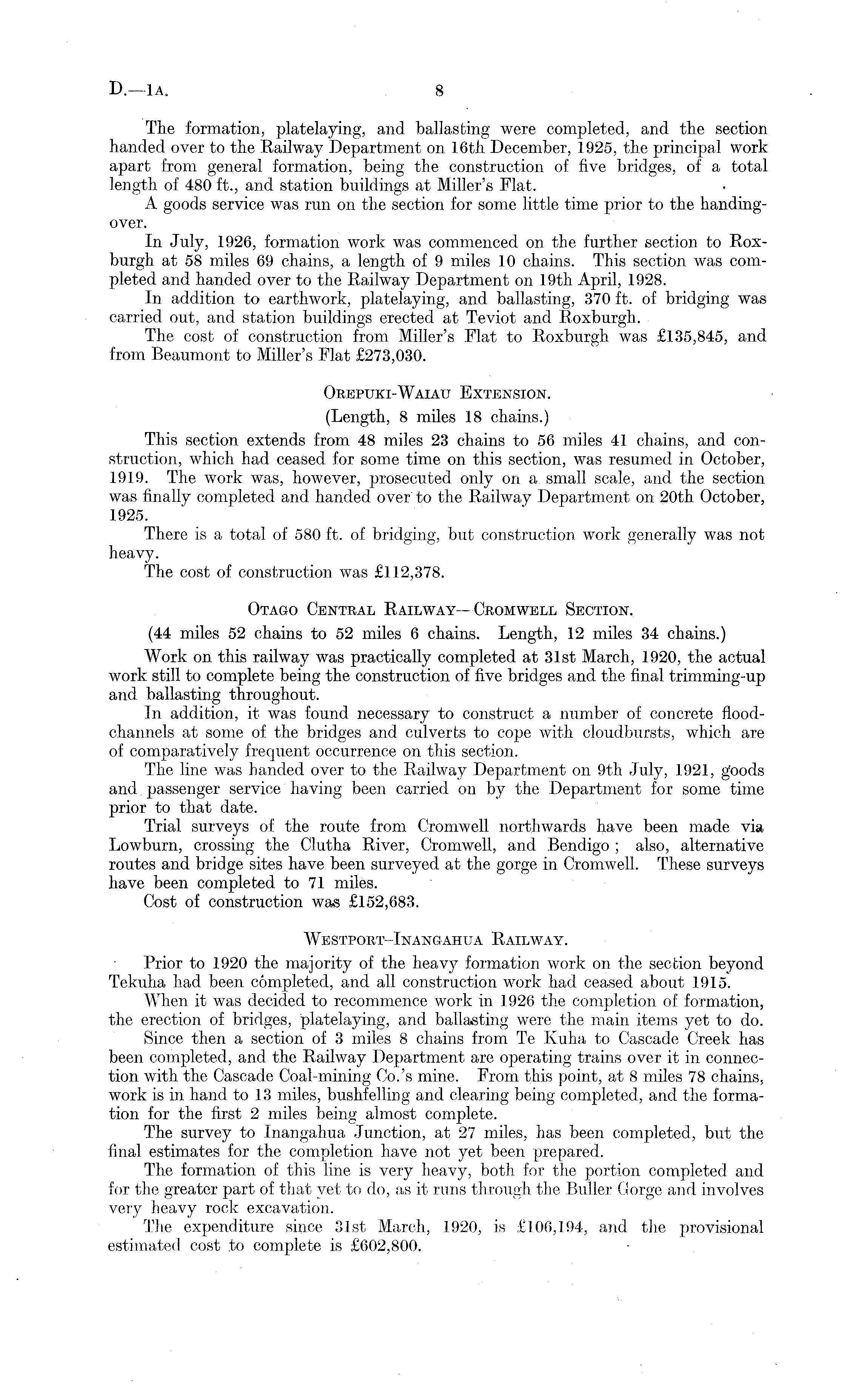 The formation, platelaying, and ballasting were completed, and the section handed over to the Railway Department on 16th December, 1925, the principal work apart from general formation, being the construction of five bridges, of a total length of 480 ft., and station buildings at Miller's Flat. A goods service was run on the section for some little time prior to the handingover. In July, 1926, formation work was commenced on the further section to Roxburgh at 58 miles 69 chains, a length of 9 miles 10 chains. This section was completed and handed over to the Railway Department on 19th April, 1928. In addition to earthwork, platelaying, and ballasting, 370 ft. of bridging was carried out, and station buildings erected at Teviot and Roxburgh. The cost of construction from Miller's Flat to Roxburgh was £135,845, and from Beaumont to Miller's Flat £273,030. Orepuki-Waiau Extension. (Length, 8 miles 18 chains.) This section extends from 48 miles 23 chains to 56 miles 41 chains, and construction, which had ceased for some time on this section, was resumed in October, 1919. The work was, however, prosecuted only on a small scale, and the section was finally completed and handed over to the Railway Department on 20th. October, 1925. There is a total of 580 ft. of bridging, but construction work generally was not heavy. The cost of construction was £112,378. Otago Central Railway—Cromwell Section. (44 miles 52 chains to 52 miles 6 chains. Length, 12 miles 34 chains.) Work on this railway was practically completed at 31st March, 1920, the actual work still to complete being the construction of five bridges and the final trimming-up and ballasting throughout. In addition, it was found necessary to construct a number of concrete floodchannels at some of the bridges and culverts to cope with cloudbursts, which are of comparatively frequent occurrence on this section. The line was handed over to the Railway Department on 9th July, 1921, goods and passenger service having been carried on by the Department for some time prior to that date. Trial surveys of the route from Cromwell northwards have been made via Lowburn, crossing the Clutha River, Cromwell, and Bendigo ; also, alternative routes and bridge sites have been surveyed at the gorge in Cromwell. These surveys have been completed to 71 miles. Cost of construction was £152,683. Westport-Inangahua Railway. Prior to 1920 the majority of the heavy formation work on the section beyond Tekuha had been completed, and all construction work had ceased about 1915. When it was decided to recommence work in 1926 the completion of formation, the erection of bridges, platelaying, and ballasting were the main items yet to do. Since then a section of 3 miles 8 chains from Te Ivuha to Cascade Creek has been completed, and the Railway Department are operating trains over it in connection with the Cascade Coal-mining Co.'s mine. From this point, at 8 miles 78 chains, work is in hand to 13 miles, bushfelling and clearing being completed, and the formation for the first 2 miles being almost complete. The survey to Inangahua Junction, at 27 miles, has been completed, but the final estimates for the completion have not yet been prepared. The formation of this line is very heavy, both for the portion completed and for the greater part of that vet to do, as it runs through the Buller Gorge and involves very heavy rock excavation. The expenditure since 31st March, 1920, is £106,194, and the provisional estimated cost to complete is £602,800.