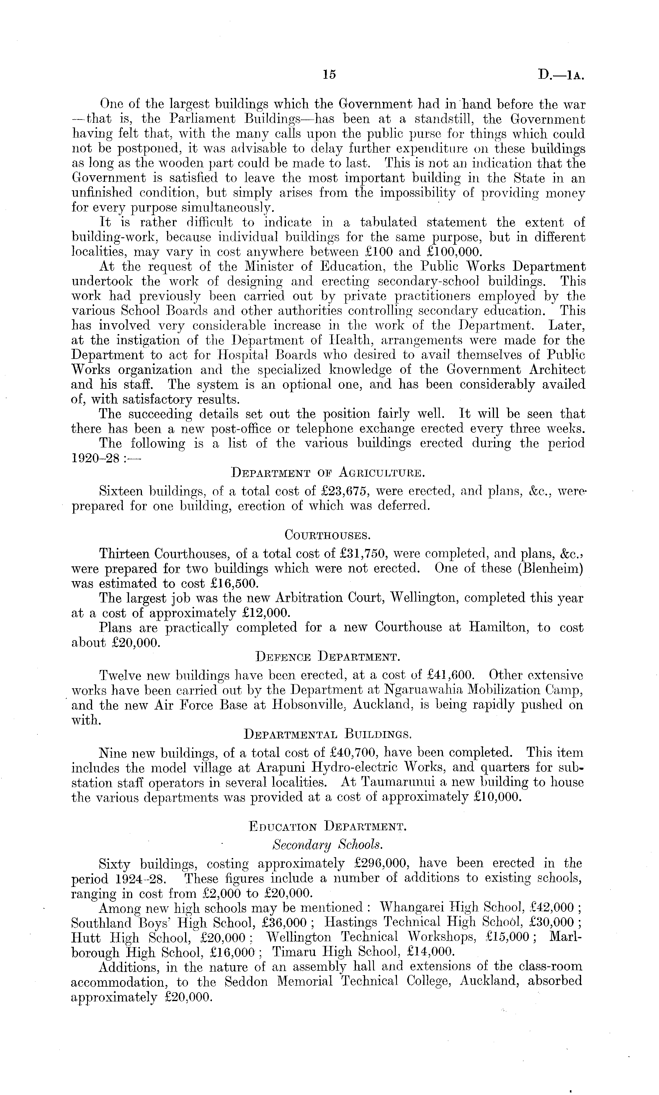 One of the largest buildings which the Government had in hand before the war —that is, the Parliament Buildings —has been at a standstill, the Government having felt that, with the many calls upon the public purse for things which could not be postponed, it was advisable to delay further expenditure 011 these buildings as long as the wooden part could be made to last. This is not an indication that the Government is satisfied to leave the most important building in the State in an unfinished condition, but simply arises from the impossibility of providing money for every purpose simultaneously. It is rather difficult to indicate in a tabulated statement the extent of building-work, because individual buildings for the same purpose, but in different localities, may vary in cost anywhere between £100 and £100,000. At the request of the Minister of Education, the Public Works Department undertook the work of designing and erecting secondary-school buildings. This work had previously been carried out by private practitioners employed by the various School Boards and other authorities controlling secondary education. This has involved very considerable increase in the work of the Department. Later, at the instigation of the Department of Health, arrangements were made for the Department to act for Hospital Boards who desired to avail themselves of Public Works organization and the specialized knowledge of the Government Architect and his staff. The system is an optional one, and has been considerably availed of, with satisfactory results. The succeeding details set out the position fairly well. It will be seen that there has been a new post-office or telephone exchange erected every three weeks. The following is a list of the various buildings erected during the period 1920-28 :— Department of Agriculture. Sixteen buildings, of a total cost of £23,675, were erected, and plans, &c., wereprepared for one building, erection of which was deferred. Courthouses. Thirteen Courthouses, of a total cost of £31,750, were completed, and plans, &c.> were prepared for two buildings which were not erected. One of these (Blenheim) was estimated to cost £16,500. The largest job was the new Arbitration Court, Wellington, completed this year at a cost of approximately £12,000. Plans are practically completed for a new Courthouse at Hamilton, to cost about £20,000. Defence Department. Twelve new buildings have been erected, at a cost of £41,600. Other extensive works have been carried out by the Department at Ngaruawahia Mobilization Camp, and the new Air Force Base at Hobsonville, Auckland, is being rapidly pushed on with. Departmental Buildings. Nine new buildings, of a total cost of £40,700, have been completed. This item includes the model village at Arapuni Hydro-electric Works, and quarters for substation staff operators in several localities. At Taumarunui a new building to house the various departments was provided at a cost of approximately £10,000. Education Department. Secondary Schools. Sixty buildings, costing approximately £296,000, have been erected in the period 1924 -28. These figures include a number of additions to existing schools, ranging in cost from £2,000 to £20,000. " Among new high schools may be mentioned : Whangarei High School, £42,000 ; Southland Boys' High School, £36,000 ; Hastings Technical High Scho6l, £30,000 ; Hutt High School, £20,000 ; Wellington Technical Workshops, £15,000; Marlborough High School, £16,000 ; Timaru High School, £14,000. Additions, in the nature of an assembly hall and extensions of the class-room accommodation, to the Seddon Memorial Technical College, Auckland, absorbed approximately £20,000.