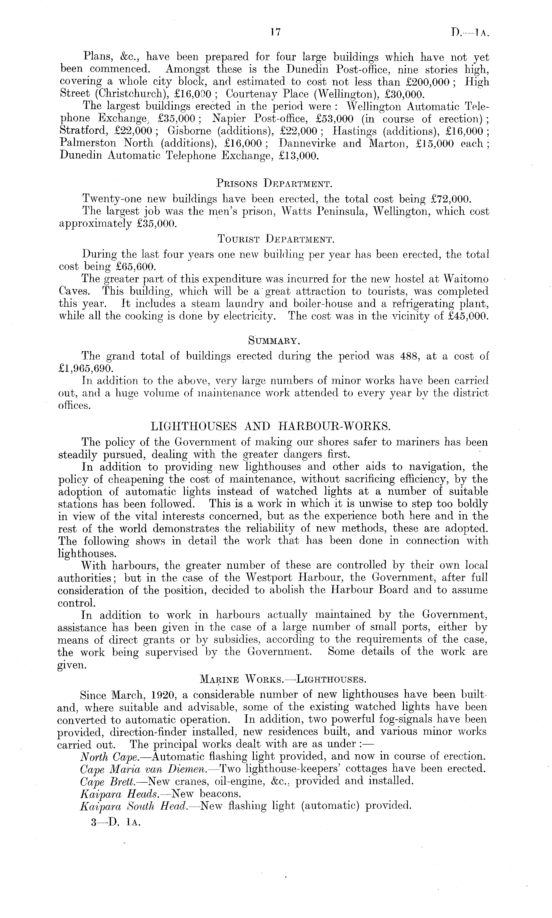 Plans, &c., have been prepared for four large buildings which have not yet been commenced. Amongst these is the Dunedin Post-office, nine stories high, covering a whole city block, and estimated to cost not less than £200,000 ; High Street (Christchurch), £l 6,000 ; Courtenay Place (Wellington), £30,000. The largest buildings erected in the period were : Wellington Automatic Telephone Exchange ; £35,000; Napier Post-office, £53,000 (in course of erection) ; Stratford, £22,000 ; Gisborne (additions), £22,000 ; Hastings (additions), £16,000 ; Palmerston North (additions), £16,000 ; Dannevirke and Marton, £15,000 each ; Dunedin Automatic Telephone Exchange, £13,000. Prisons Department. Twenty-one new buildings have been erected, the total cost being £72,000. The largest job was the men's prison, Watts Peninsula, Wellington, which cost approximately £35,000. Tourist Department. During the last four years one new building per year has been erected, the total cost being £65,600. The greater part of this expenditure was incurred for the new hostel at Waitomo Caves. This building, which will be a great attraction to tourists, was completed this year. It includes a steam laundry and boiler-house and a refrigerating plant, while all the cooking is done by electricity. The cost was in the vicinity of £45,000. Summary. The grand total of buildings erected during the period was 488, at a cost of £1,965,690. In addition to the above, very large numbers of minor works have been carried out, and a huge volume of maintenance work attended to every year by the district offices. LIGHTHOUSES AND HARBOUR-WORKS. The policy of the Government of making our shores safer to mariners has been steadily pursued, dealing with the greater dangers first. In addition to providing new lighthouses and other aids to navigation, the policy of cheapening the cost of maintenance, without sacrificing efficiency, by the adoption of automatic lights instead of watched lights at a number of suitable stations has been followed. This is a work in which it is unwise to step too boldly in view of the vital interests concerned, but as the experience both here and in the rest of the world demonstrates the reliability of new methods, these are adopted. The following shows in detail the work that has been done in connection with lighthouses. With harbours, the greater number of these are controlled by their own local authorities; but in the case of the Westport Harbour, the Government, after full consideration of the position, decided to abolish the Harbour Board and to assume control. In addition to work in harbours actually maintained by the Government, assistance has been given in the case of a large number of small ports, either by means of direct grants or by subsidies, according to the requirements of the case, the work being supervised by the Government. Some details of the work are given. Marine Works. —Lighthouses. Since March, 1920, a considerable number of new lighthouses have been builtand, where suitable and advisable, some of the existing watched lights have been converted to automatic operation. In addition, two powerful fog-signals have been provided, direction-finder installed, new residences built, and various minor works carried out. The principal works dealt with are as under : — North Automatic flashing light provided, and now in course of erection. Cape Maria van Diemen. —Two lighthouse-keepers' cottages have been erected. Cape Brett. —New cranes, oil-engine, &c.. provided and installed. Kaipara Heads. —New beacons. Kaipara South Head. —New flashing light (automatic) provided.