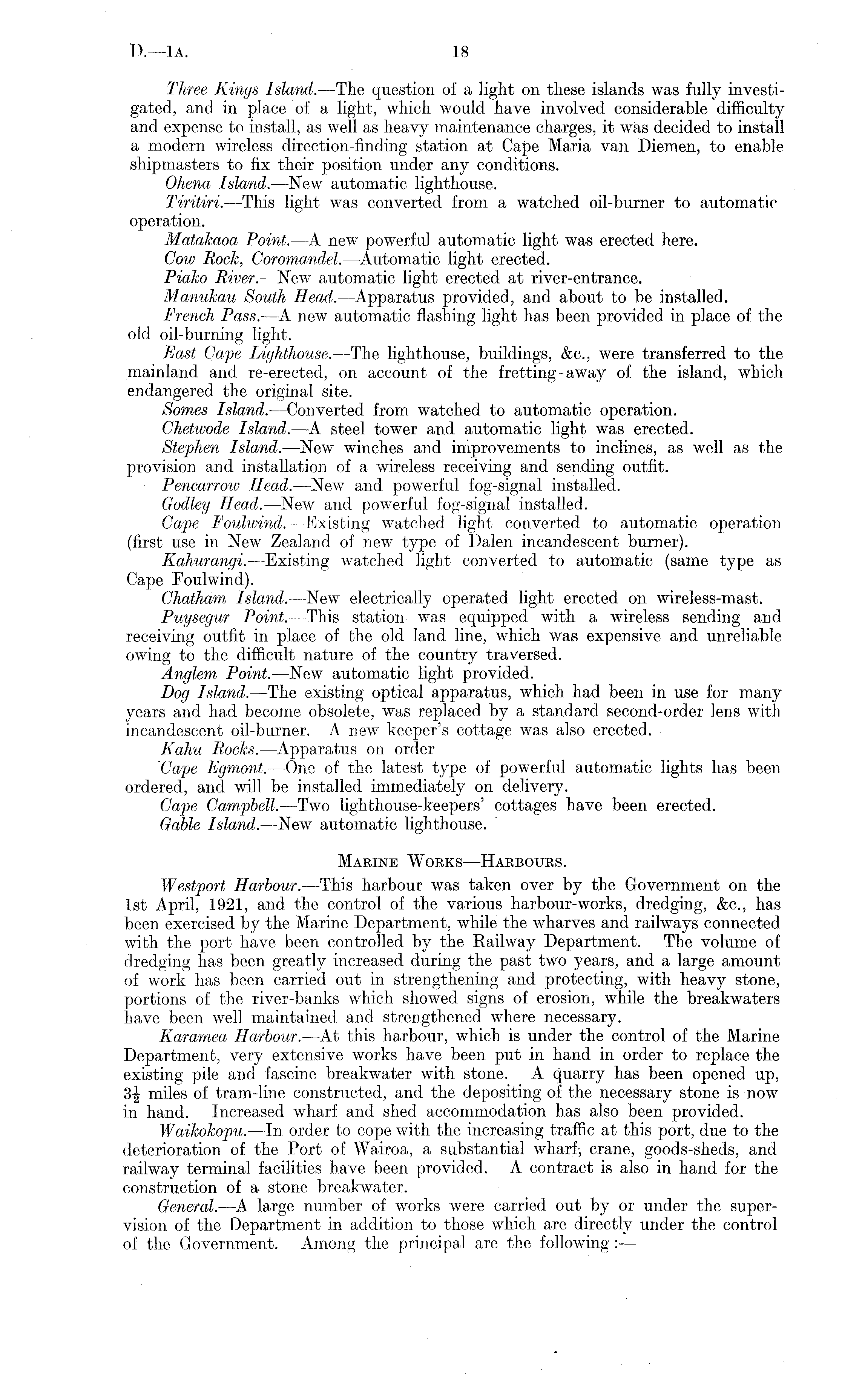 Three Kings Island. —The question of a light on these islands was fully investigated, and in place of a light, which would have involved considerable difficulty and expense to install, as well as heavy maintenance charges, it was decided to install a modern wireless direction-finding station at Cape Maria van Diemen, to enable shipmasters to fix their position under any conditions. Ohena Island. —New automatic lighthouse. Tiritiri. —This light was converted from a watched oil-burner to automatic operation. Matakaoa Point.—A. new powerful automatic light was erected here. Cow Rock, Coromandel. —Automatic light erected. Piako Paver.- New automatic light erected at river-entrance. Manukau South Head. —Apparatus provided, and about to be installed. French Pass. —A new automatic flashing light has been provided in place of the old oil-burning light. East Cape Lighthouse.—The lighthouse, buildings, &c., were transferred to the mainland and re-erected, on account of the fretting - away of the island, which endangered the original site. Somes Island. —Converted from watched to automatic operation. Chetwode Island.—A steel tower and automatic light was erected. Stephen Island. —New winches and improvements to inclines, as well as the provision and installation of a wireless receiving and sending outfit. Pencarrow Head. —New and powerful fog-signal installed. Godley Head. —New and powerful fog-signal installed. Cape Fouhvind. —Existing watched light converted to automatic operation (first use in New Zealand of new type of Dalen incandescent burner). Kahurangi.—Existing watched light converted to automatic (same type as Cape Foulwind). Chatham Island. —New electrically operated light erected on wireless-mast. Puysegur Point. —This station was equipped with a wireless sending and receiving outfit in place of the old land line, which was expensive and unreliable owing to the difficult nature of the country traversed. Anglem Point.—New automatic light provided. Dog Island. —The existing optical apparatus, which had been in use for many years and had become obsolete, was replaced by a standard second-order lens with incandescent oil-burner. A new keeper's cottage was also erected. Kahu Rocks. —Apparatus on order 'Cape Egmont. —One of the latest type of powerful automatic lights has been ordered, and will be installed immediately on delivery. Cape Campbell. —Two lighthouse-keepers' cottages have been erected. Gable Island. —New automatic lighthouse. Marine Works —Harbours. Westport Harbour. —This harbour was taken over by the Government on the Ist April, 1921, and the control of the various harbour-works, dredging, &c., has been exercised by the Marine Department, while the wharves and railways connected with the port have been controlled by the Railway Department. The volume of dredging has been greatly increased during the past two years, and a large amount of work has been carried out in strengthening and protecting, with heavy stone, portions of the river-banks which showed signs of erosion, while the breakwaters have been well maintained and strengthened where necessary. Karamea Harbour. —At this harbour, which is under the control of the Marine Department, very extensive works have been put in hand in order to replace the existing pile and fascine breakwater with stone. A quarry has been opened up, miles of tram-line constructed, and the depositing of the necessary stone is now in hand. Increased wharf and shed accommodation has also been provided. Waikokopu. —In order to cope with the increasing traffic at this port, due to the deterioration of the Port of Wairoa, a substantial wharf-, crane, goods-sheds, and railway terminal facilities have been provided. A contract is also in hand for the construction of a stone breakwater. General. —A large number of works were carried out by or under the supervision of the Department in addition to those which are directly under the control of the Government. Among the principal are the following : —
