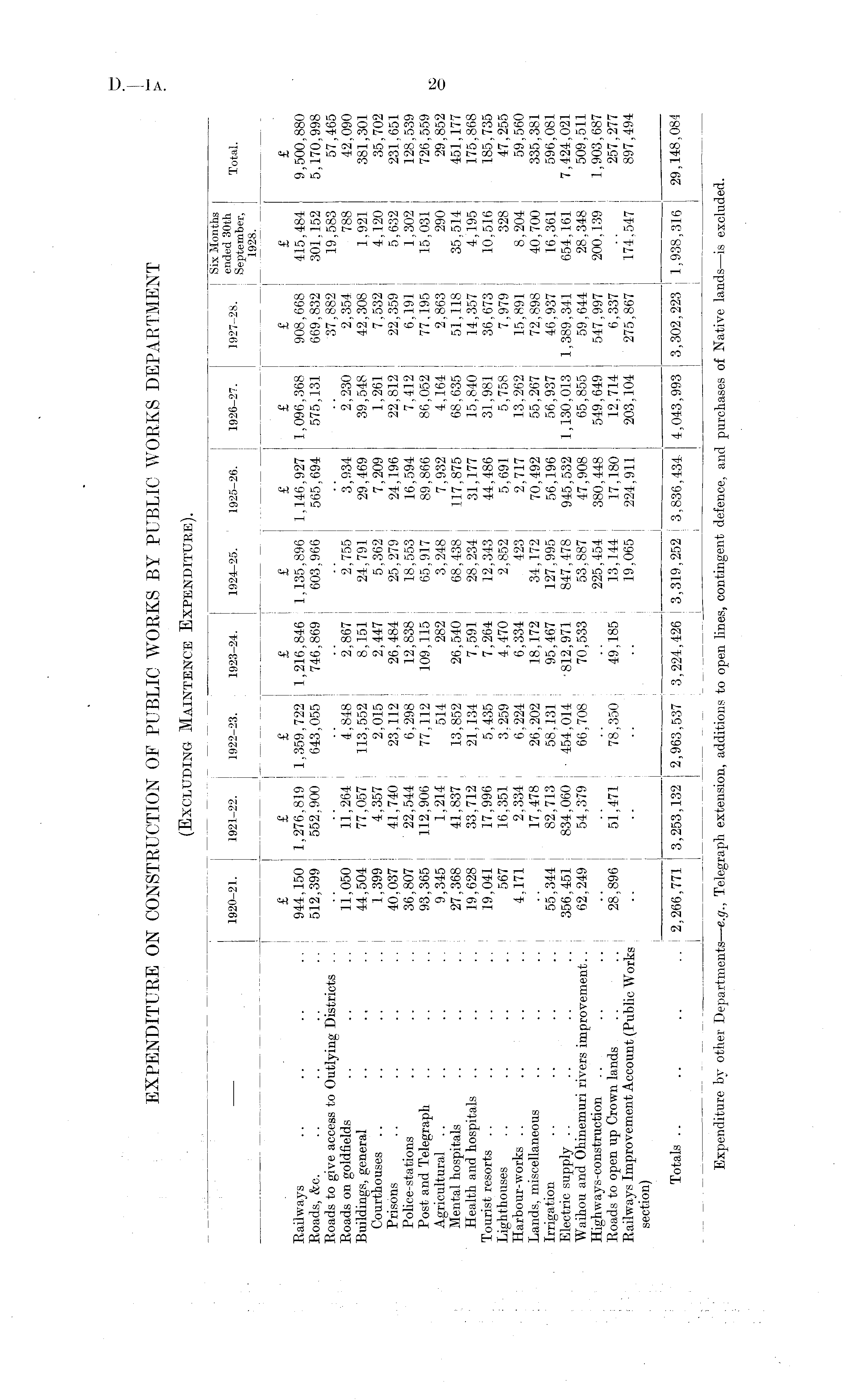 (Excluding Maintence Expenditure). j I ! | Six Months 1920-21. 1921-22. ! 1922-23. 1923-24. ' 1924U25. 1925-26. ! 1926-27. 1927-28. i TotaL ! 1 1928. ■i I ~ ~ ' ~ ~ " ' ~ " ' ~ i £ £ £ £ £ £ £ £ £ £ Railways .. .. .. .. j 944,150 1,276,819 1,359,722 1,216,846 1,135,896 1,146,927 1,096,368 908,668 415,484 9,500,880 Roads, &c. .. .. .. .. 512,399 552,900 643,055 746,869 603,966 565,694 575,131 669,832 301,152 5,170,998 Roads to give access to Outlying Districts .. .. .. .. .. .. .. .. 37,882 19,583 57,465 Roads on goldfields .. .. .. 11,050 11,264 4,848 2,867 2,755 3,934 2,230 2,354 788 42,090 Buildings, general .. .. 44,504 77,057 113,552 8,151 24,791 29,469 39,548 42,308 1,921 381,301 Courthouses .. .. .. .. 1,399 4,357 2,015 2,447 5,362 7,209 1,261 7,532 4,120 35,702 Prisons .. .. .. .. 40,037 41,740: 23,112 26,484 25,279 24,196 22,812 22,359 5,632 231.651 Police-stations .. .. .. 36,807 22,544' 6,298 12,838 18,553 16,594 7,412 6,191 1,302 128,539 Post and Telegraph .. .. .. 93,365 112,906! 77,112 109,115 65,917 89,866 86,052 77,195 15,031 726,559 Agricultural .. .. .. ., 9,345 1,214 514 282 3,248 7,932 4,164 2,863 290 29,852 Mental hospitals .. .. .. 27,368 41,837 13,852 26,540 68,438 117,875 68,635 51,118 35,514 451,177 Health and hospitals .. .. .. 19,628 33,712 21,134 7,591 28,234 31,177 15,840 14,357 4,195 175,868 Tourist resorts .. .. .. .. 19,041 17,996 5,435 7,264 12,343 44,486 31,981 36,673 10.516 185,735 Lighthouses .. .. .. .. 567 16,351 3,259 4,470 2,852 5,691 5,758 7,979 328 47,255 Harbour-works .. .. .. .. 4,171 2,334 6,224 6,334 423 2,717 13,262 15,891 8,204 59,560 Lands, miscellaneous .. .. .. .. 17,478, 26,202 18,172 34,172 70,492 55,267 72,898 40,700 335,381 Irrigation .. .. .. .. 55,344 82,713 58,131 95,467 127,995 56,196 56,937 46,937 16,361 596,081 Electric supply .. .. .. .. 356,451 834,060 • 454,014 *812,971 847,478 945,532 1,130,013 1,389,341 654,161 7,424,021 Waihou and Ohinemuri rivers improvement.. 62,249 54,379 66,708 70,533 53,887 47,908 65,855 59,644 28,348 509,511 Highways-construction .. .. .. .. .. .. .. 225,454 380,448 549,649 547,997 200,139 1,903,687 Roads to open up Crown lands .. .. 28,896 51,471 78,350 49,185 13,144 17,180 12,714 6,337 .. 257,277 Railways Improvement Account (Public Works .. .. .. .. 19,065 224,911 203,104 275,867 174,547 897,494 section) Totals.. .. .. ..12,266,771 3,253,132 2,963,537 3,224,426:3,319,252 3,836,434- 4,043,993 3,302,223 1,938,316 j 29,148,084 , J l ! - ! Expenditure by other Departments —e.g., Telegraph extension, additions to open lines, contingent defence, and purchases of Native lands —is excluded.