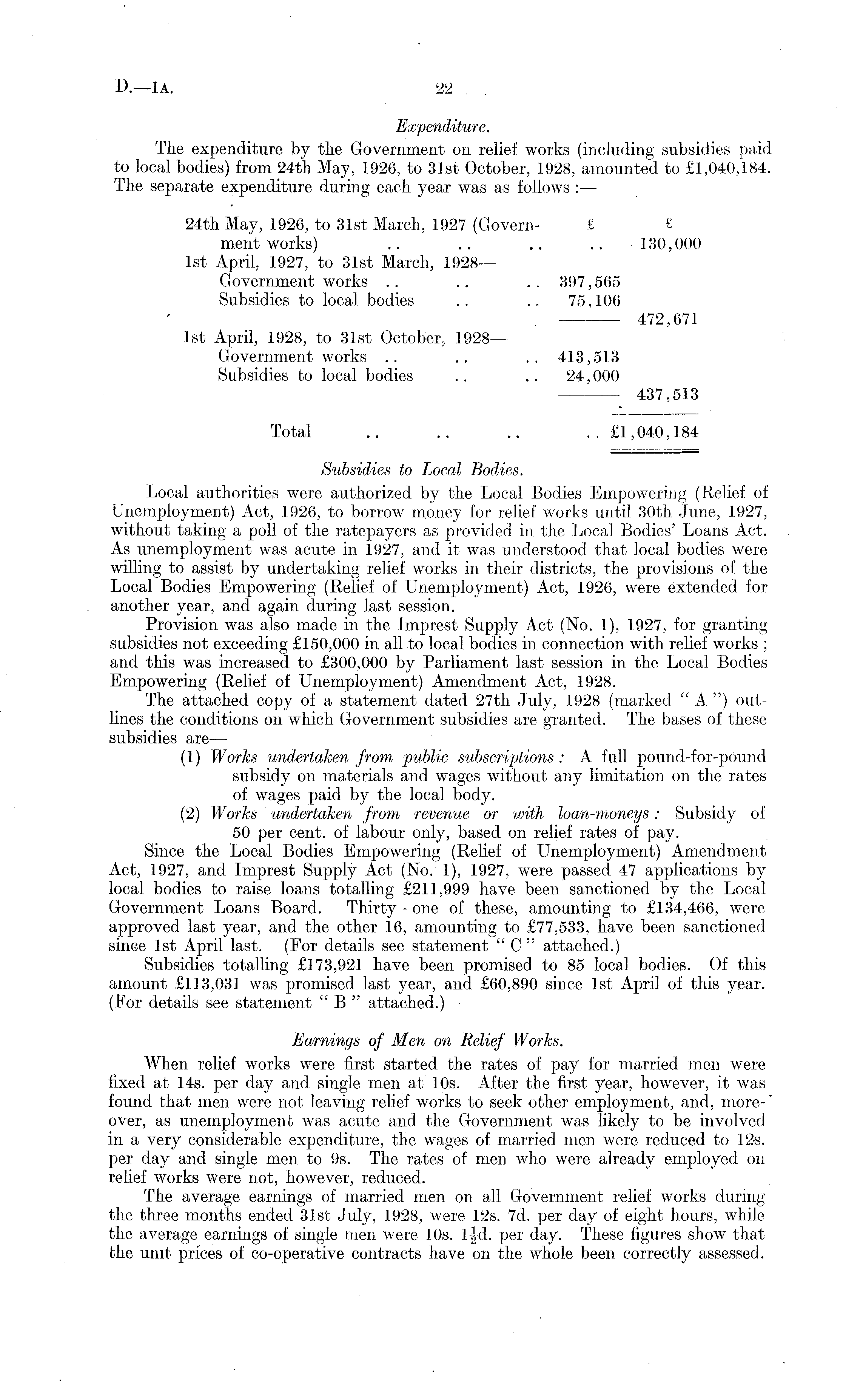 Expenditure. The expenditure by the Government on relief works (including subsidies paid to local bodies) from 24th May, 1926, to 31st October, 1928, amounted to £1,040,184. The separate expenditure during each year was as follows : — 24th May, 1926, to 31st March, 1927 (Govern- £ £ ment works) .. .. .. .. 130,000 Ist April, 1927, to 31st March, 1928 — Government works .. .. . . 397,565 Subsidies to local bodies .. .. 75,106 472,671 Ist April, 1928, to 31st October, 1928 — Government works .. .. .. 413,513 Subsidies to local bodies .. .. 24,000 437,513 Total .. .. .. £1,040,184 Subsidies to Local Bodies. Local authorities were authorized by the Local Bodies Empowering (Relief of Unemployment) Act, 1926, to borrow money for relief works until 30th June, 1927, without taking a poll of the ratepayers as provided in the Local Bodies' Loans Act. As unemployment was acute in 1927, and it was understood that local bodies were willing to assist by undertaking relief works in their districts, the provisions of the Local Bodies Empowering (Relief of Unemployment) Act, 1926, were extended for another year, and again during last session. Provision was also made in the Imprest Supply Act (No. 1), 1927, for granting subsidies not exceeding £150,000 in all to local bodies in connection with relief works ; and this was increased to £300,000 by Parliament last session in the Local Bodies Empowering (Relief of Unemployment) Amendment Act, 1928. The attached copy of a statement dated 27th July, 1928 (marked " A ") outlines the conditions on which Government subsidies are granted. The bases of these subsidies are — (1) Works undertaken from public subscriptions : A full pound-for-pound subsidy on materials and wages without any limitation on the rates of wages paid by the local body. (2) Works undertaken from revenue or with loan-moneys: Subsidy of 50 per cent, of labour only, based on relief rates of pay. Since the Local Bodies Empowering (Relief of Unemployment) Amendment Act, 1927, and Imprest Supply Act (No. 1), 1927, were passed 47 applications by local bodies to raise loans totalling £211,999 have been sanctioned by the Local Government Loans Board. Thirty - one of these, amounting to £134,466, were approved last year, and the other 16, amounting to £77,533, have been sanctioned since Ist April last. (For details see statement "C " attached.) Subsidies totalling £173,921 have been promised to 85 local bodies. Of this amount £113,031 was promised last year, and £60,890 since Ist April of this year. (For details see statement " B " attached.) Earnings of Men on Relief Works. When relief works were first started the rates of pay for married men were fixed at 14s. per day and single men at 10s. After the first year, however, it was found that men were not leaving relief works to seek other employment, and, more-" over, as unemployment was acute and the Government was likely to be involved in a very considerable expenditure, the wages of married men were reduced to 12s. per day and single men to 9s. The rates of men who were already employed on relief works were not, however, reduced. The average earnings of married men on all Government relief works during the three months ended 31st July, 1928, were 12s. 7d. per day of eight hours, while the average earnings of single men were 10s. I id. per day. These figures show that the unit prices of co-operative contracts have on the whole been correctly assessed.