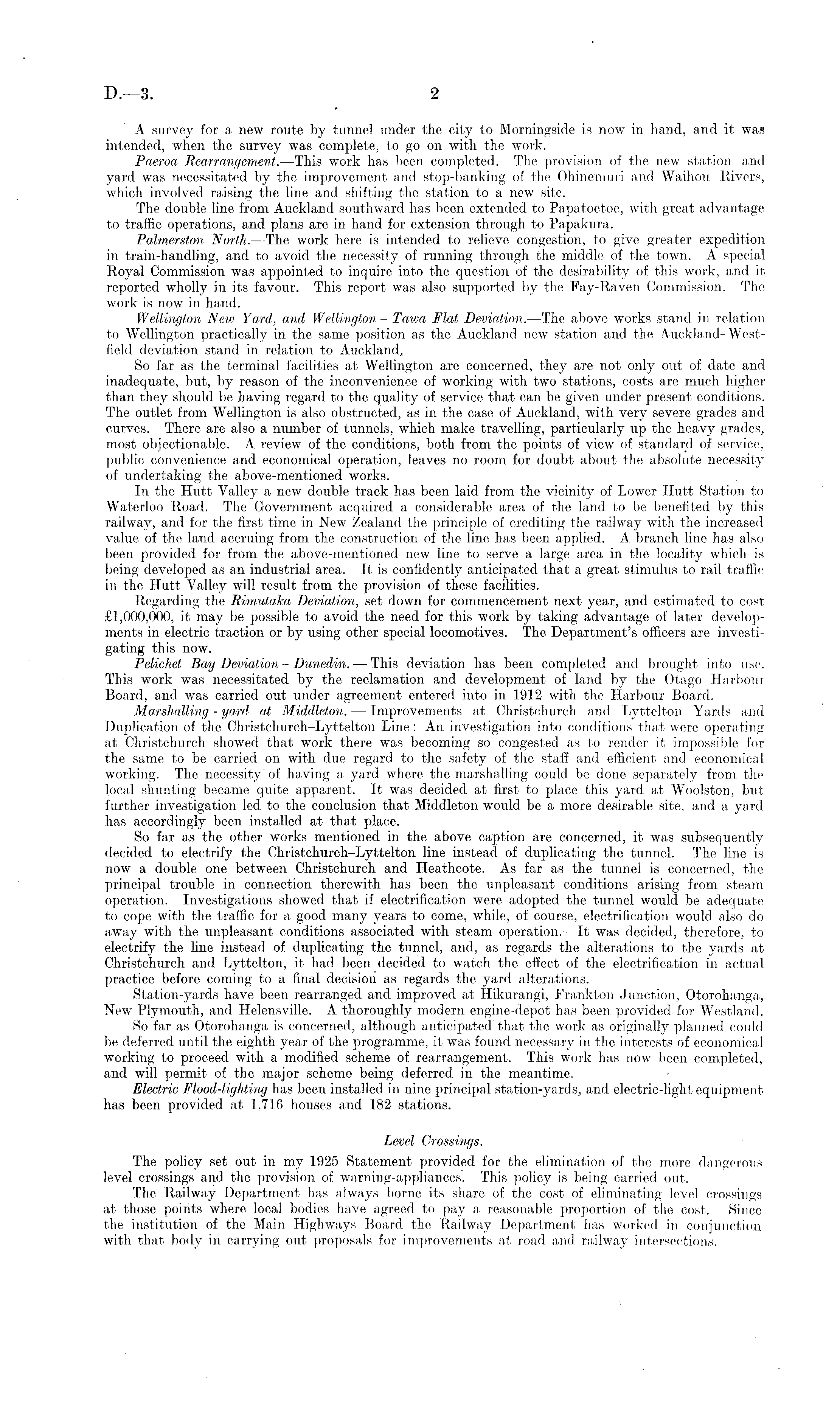 A survey for a new route by tunnel under the city to Morningside is now in hand, and it was intended, when the survey was complete, to go on with the work. Paeroa Rearrangement.—This work has been completed. The provision of the new station and yard was necessitated by the improvement and stop-banking of the Ohinemuri and Waihou Rivers, which involved raising the line and shifting the station to a new site. The double line from Auckland southward has been extended to Papatoetoe, with great advantage to traffic operations, and plans are in hand for extension through to Papakura. Palmerston North.—The work here is intended to relieve congestion, to give greater expedition in train-handling, and to avoid the necessity of running through the middle of the town. A special Royal Commission was appointed to inquire into the question of the desirability of this work, and it reported wholly in its favour. This report was also supported by the Pay-Raven Commission. The work is now in hand. Wellington New Yard, and Wellington - Tawa Flat Deviation.—The above works stand in relation to Wellington practically in the same position as the Auckland new station and the Auckland-West-field deviation stand in relation to Auckland, So far as the terminal facilities at Wellington are concerned, they are not only out of date and inadequate, but, by reason of the inconvenience of working with two stations, costs are much higher than they should be having regard to the quality of service that can be given under present conditions. The outlet from Wellington is also obstructed, as in the case of Auckland, with very severe grades and curves. There are also a number of tunnels, which make travelling, particularly up the heavy grades, most objectionable. A review of the conditions, both from the points of view of standard of service, public convenience and economical operation, leaves no room for doubt about the absolute necessity of undertaking the above-mentioned works. In the Hutt Valley a new double track has been laid from the vicinity of Lower Hutt Station to Waterloo Road. The Government acquired a considerable area of the land to be benefited by this railway, and for the first time in New Zealand the principle of crediting the railway with the increased value of the land accruing from the construction of the line has been applied. A branch line has also been provided for from the above-mentioned new line to serve a large area in the locality which is being developed as an industrial area. It is confidently anticipated that a great stimulus to rail traffic in the Hutt, Valley will result from the provision of these facilities. Regarding the Rimutaka Deviation, set down for commencement next year, and estimated to cost £1,000,000, it may be possible to avoid the need for this work by taking advantage of later developments in electric traction or by using other special locomotives. The Department's officers are investigating this now. Pelichet Bay Deviation - Dunedin. —- This deviation has been completed and brought into use. This work was necessitated by the reclamation and development of land by the Otago Harbour Board, and was carried out under agreement entered into in 1912 with the Harbour Board. Marshalling - yard at Middleton. — Improvements at Christchurch and Lyttelton Yards and Duplication of the Christchurch-Lyttelton Line: An investigation into conditions that were operating at Christchurch showed that work there was becoming so congested as to render it impossible for the same to be carried on with due regard to the safety of the staff and efficient and economical working. The necessity of having a yard where the marshalling could be done separately from the local shunting became quite apparent. It was decided at first to place this yard at Woolston, but further investigation led to the conclusion that Middleton would be a more desirable site, and a yard has accordingly been installed at that place. So far as the other works mentioned in the above caption are concerned, it was subsequently decided to electrify the Christchurch-Lyttelton line instead of duplicating the tunnel. The line is now a double one between Christchurch and Heathcote. As far as the tunnel is concerned, the principal trouble in connection therewith has been the unpleasant conditions arising from steam operation. Investigations showed that if electrification were adopted the tunnel would be adequate to cope with the traffic for a good many years to come, while, of course, electrification would also do away with the unpleasant conditions associated with steam operation. It was decided, therefore, to electrify the line instead of duplicating the tunnel, and, as regards the alterations to the yards at Christchurch and Lyttelton, it had been decided to watch the effect of the electrification in actual practice before coming to a final decision as regards the yard alterations. Station-yards have been rearranged and improved at Hikurangi, Frankton Junction, Otorohanga, New Plymouth, and Helensville. A thoroughly modern engine-depot has been provided for Westland. So far as Otorohanga is concerned, although anticipated that the work as originally planned could be deferred until the eighth year of the programme, it was found necessary in the interests of economical working to proceed with a modified scheme of rearrangement. This work has now been completed, and will permit of the major scheme being deferred in the meantime. Electric Flood-lighting has been installed in nine principal station-yards, and electric-light equipment has been provided at 1,716 houses and 182 stations. Level Crossings. The policy set out in my 1925 Statement provided for the elimination of the more dangerous level crossings and the provision of warning-appliances'. This policy is being carried out. The Railway Department has always borne its share of the cost of eliminating level crossings at those points where, local bodies have agreed to pay a rea