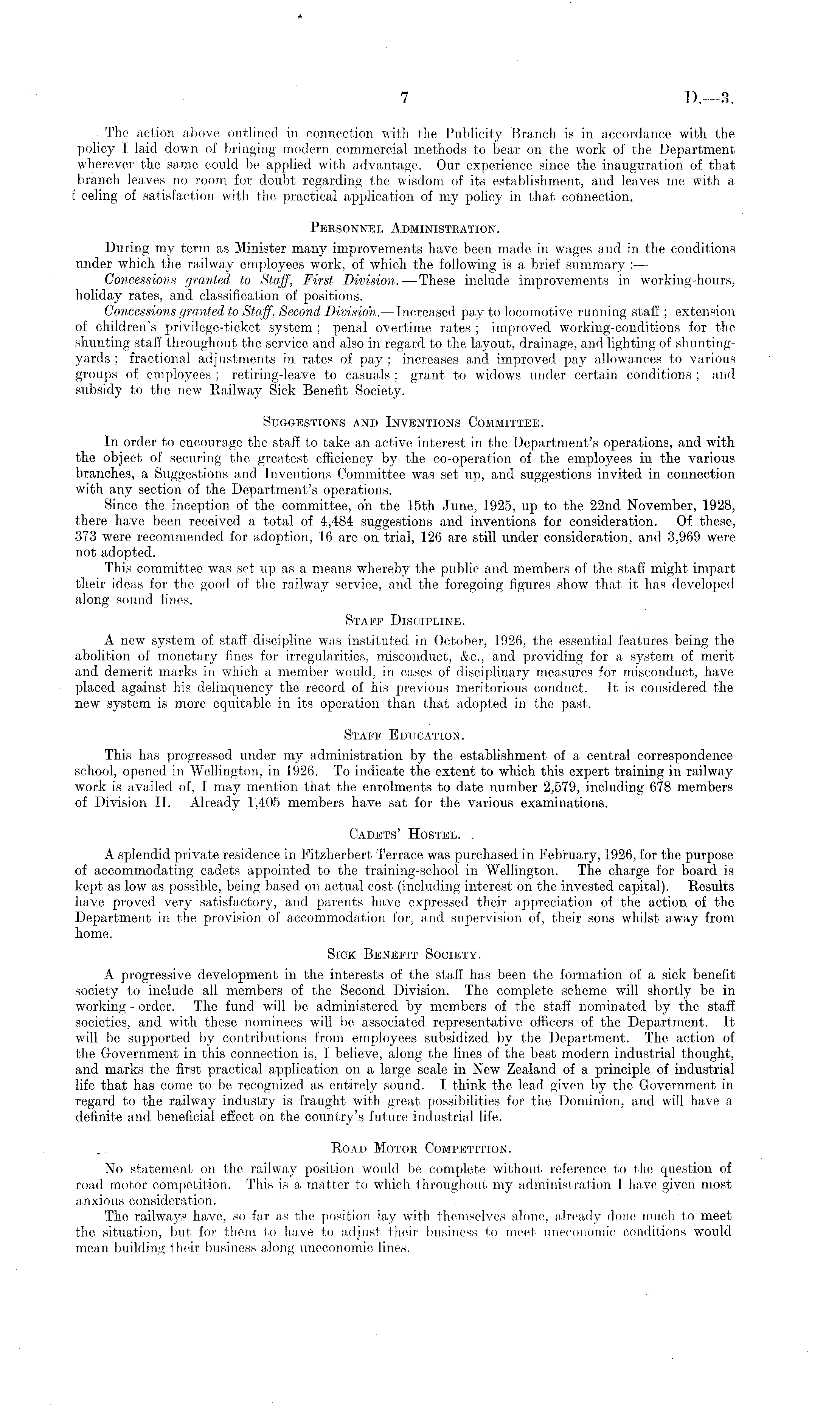 The action above outlined in connection with the Publicity Branch is in accordance with the policy I laid down of bringing modern commercial methods to bear on the work of the Department wherever the same could be applied with advantage. Our experience since the inauguration of that branch leaves no room for doubt regarding the wisdom of its establishment, and leaves me with a E eeling of satisfaction with the practical application of my policy in that connection. Personnel Administration. During my term as Minister many improvements have been made in wages and in the conditions under which the railway employees work, of which the following is a brief summary : — Concessions granted to Staff, First Division.—These include improvements in working-hours, holiday rates, and classification of positions. Concessions granted to Staff, Second Division. —Increased pay to locomotive running staff ; extension of children's privilege-ticket system ; penal overtime rates ; improved working-conditions for the shunting staff throughout the service and also in regard to the layout, drainage, and lighting of shuntingyards ; fractional adjustments in rates of pay ; increases and improved pay allowances to various groups of employees ; retiring-leave to casuals ; grant to widows under certain conditions ; and subsidy to the new Railway Sick Benefit Society. Suggestions and Inventions Committee. In order to encourage the staff to take an active interest in the Department's operations, and with the object of securing the greatest efficiency by the co-operation of the employees in the various branches, a Suggestions and Inventions Committee was set up, and suggestions invited in connection with any section of the Department's operations. Since the inception of the committee, oh the 15th June, 1925, up to the 22nd November, 1928, there have been received a total of 4,484 suggestions and inventions for consideration. Of these, 373 were recommended for adoption, 16 are on trial, 126 are still under consideration, and 3,969 were not adopted. This committee was set up as a means whereby the public and members of the staff might impart their ideas for the good of the railway service, and the foregoing figures show that it has developed along sound lines. Staff Discipline. A new system of staff discipline was instituted in October, 1926, the essential features being the abolition of monetary fines for irregularities, misconduct, &c., and providing for a system of merit and demerit marks in which a member would, in cases of disciplinary measures for misconduct, have placed against his delinquency the record of his previous meritorious conduct. It is considered the new system is more equitable in its operation than that adopted in the past. Staff Education. This has progressed under my administration by the establishment of a central correspondence school, opened in Wellington, in 1926. To indicate the extent to which this expert training in railway work is availed of, I may mention that the enrolments to date number 2,579, including 678 members of Division 11. Already 1,405 members have sat for the various examinations. Cadets' Hostel. . A splendid private residence in Fitzherbert Terrace was purchased in February, 1926, for the purpose of accommodating cadets appointed to the training-school in Wellington. The charge for board is kept as low as possible, being based on actual cost (including interest on the invested capital). Results have proved very satisfactory, and parents have expressed their appreciation of the action of the Department in the provision of accommodation for, and supervision of, their sons whilst away from home. Sick Benefit Society. A progressive development in the interests of the staff has been the formation of a sick benefit society to include all members of the Second Division. The complete scheme will shortly be in working - order. The fund will be administered by members of the staff nominated by the staff societies, and with these nominees will be associated representative officers of the Department. It will be supported by contributions from employees subsidized by the Department. The action of the Government in this connection is, I believe, along the lines of the best modern industrial thought, and marks the first practical application on a large scale in New Zealand of a principle of industrial life that has come to be recognized as entirely sound. I think the lead given by the Government in regard to the railway industry is fraught with great possibilities for the Dominion, and will have a definite and beneficial effect on the country's future industrial life. Road Motor Competition. No statement on the railway position would be complete without reference to the question of road motor competition. This is a matter to which throughout my administration I have given most anxious consideration. The railways have, so far as the position lay with themselves alone, already done much to meet the situation, but for them to have to adjust their business to meet uneconomic conditions would mean building their business along uneconomic lines.
