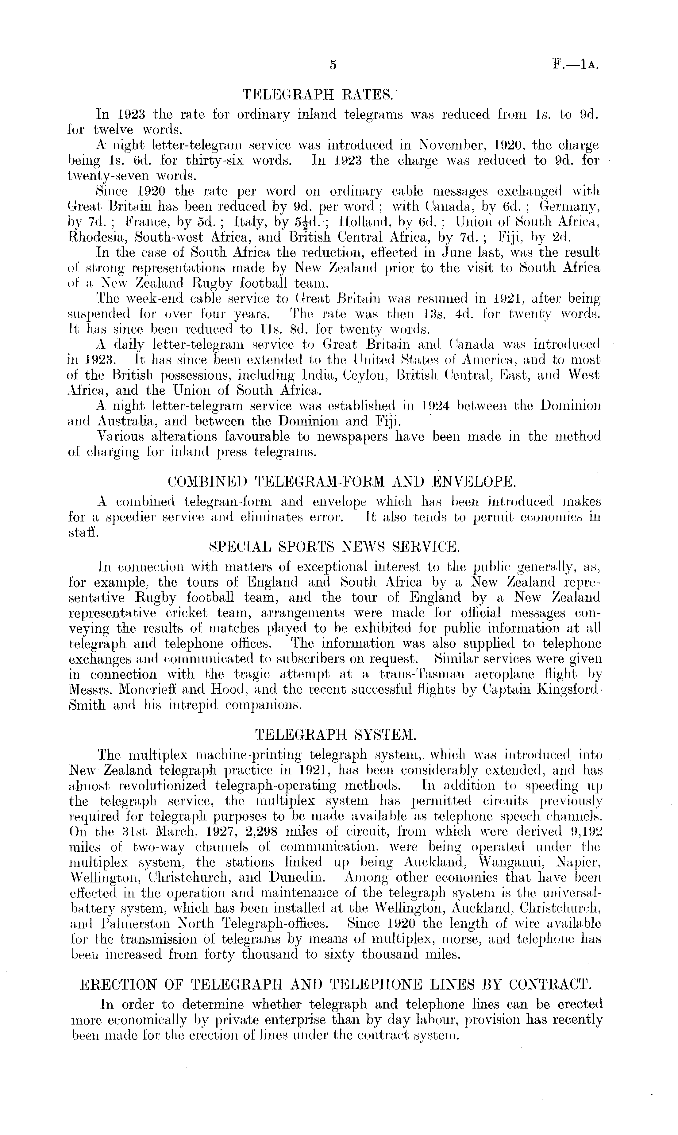 TELEGRAPH RATES. In 1923 the rate for ordinary inland telegrams was reduced from Is. to 9d. for twelve words. A night letter-telegram service was introduced in November, 1920, the charge being Js. 6d. for thirty-six words. In 1923 the charge was reduced to 9d. for twenty-seven words. Since 1920 the rate per word on ordinary cable messages exchanged with Great Britain has been reduced by 9d. per word; with Canada, by 6d. ; Germany, by 7d. ; France, by sd. ; Italy, by ; Holland, by 6d. ; Union of South Africa, Rhodesia, South-west Africa, and British Central Africa, by 7d. ; Fiji, by 2d. In the case of South Africa the reduction, effected in June last, was the result of strong representations made by New Zealand prior to the visit to South Africa of a New Zealand Rugby football team. The week-end cable service to Great Britain was resumed in 1921, after being suspended for over four years. The rate was then 13s. 4d. for twenty words. It has since been reduced to lis. Bd. for twenty words. A daily letter-telegram service to Great Britain and Canada was introduced in 1923. It has since been extended to the United States of America, and to most of the British possessions, including India, Ceylon, British Central, East, and West Africa, and the Union of South Africa. A night letter-telegram service was established in 1924 between the Dominion and Australia, and between the Dominion and Fiji. Various alterations favourable to newspapers have been made in the method of charging for inland press telegrams. COMBINED TELEGRAM-FORM AND ENVELOPE. A combined telegram-form and envelope which has been introduced makes for a speedier service and eliminates error. It also tends to permit economies in staff. SPECIAL SPORTS NEWS SERVICE. In connection with matters of exceptional interest to the public generally, as, for example, the tours of England and South Africa by a New Zealand representative Rugby football team, and the tour of England by a New Zealand representative cricket team, arrangements were made for official messages conveying the results of matches played to be exhibited for public information at all telegraph and telephone offices. The information was also supplied to telephone exchanges and communicated to subscribers on request. Similar services were given in connection with the tragic attempt at a trans-Tasman aeroplane flight by Messrs. Moncrieff and Hood, and the recent successful flights by Captain KingsfordSmith and his intrepid companions. TELEGRAPH SYSTEM. The multiplex machine-printing telegraph system,, which was introduced into New Zealand telegraph practice in 1921, has been considerably extended, and has almost revolutionized telegraph-operating methods. In addition to speeding up the telegraph service, the multiplex system has permitted circuits previously required for telegraph purposes to be made available as telephone speech channels. On the 31st March, 1927, 2,298 miles of circuit, from which were derived 9,192 miles of two-way channels of communication, were being operated under the multiplex system, the stations linked up being Auckland, Wanganui, Napier, Wellington, Christchurch, and Dunedin. Among other economies that have been effected in the operation and maintenance of the telegraph system is the uuiversalbattery system, which has been installed at the Wellington, Auckland, Christchurch, and Pahnerston North Telegraph-offices. Since 1920 the length of wire available for the transmission of telegrams by means of multiplex, morse, and telephone has been increased from forty thousand to sixty thousand miles. ERECTION OF TELEGRAPH AND TELEPHONE LINES BY CONTRACT. In order to determine whether telegraph and telephone lines can be erected more economically by private enterprise than by day labour, provision has recently been made for the erection of lines under the contract system.