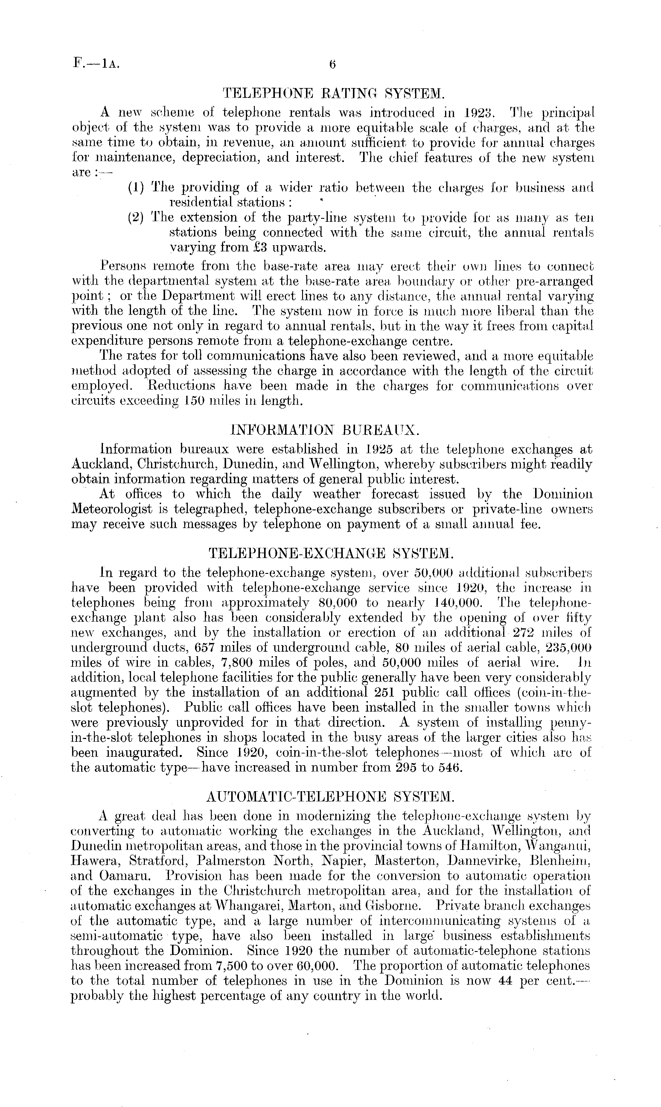 TELEPHONE RATING SYSTEM. A new scheme of telephone rentals was introduced in 1923. The principal object of the system was to provide a more equitable scale of charges, and at the same time to obtain, in revenue, an amount sufficient to provide for annual charges for maintenance, depreciation, and interest. The chief features of the new system are — (1) The providing of a wider ratio between the charges for business and residential stations : (2) The extension of the party-line system to provide for as many as ten stations being connected with the same circuit, the annual rentals varying from £3 upwards. Persons remote from the base-rate area may erect their own lines to connect with the departmental system at the base-rate area boundary or other pre-arranged point; or the Department will erect lines to any distance, the annual rental varying with the length of the line. The system now in force is much more liberal than the previous one not only in regard to annual rentals, but in the way it frees from capital expenditure persons remote from a telephone-exchange centre. The rates for toll communications have also been reviewed, and a more equitable method adopted of assessing the charge in accordance with the length of the circuit employed. Reductions have been made in the charges for communications over circuits exceeding 150 miles in length. INFORMATION BUREAUX. Information bureaux were established in 1925 at the telephone exchanges at Auckland, Christchurch, Dunedin, and Wellington, whereby subscribers might readily obtain information regarding matters of general public interest. At offices to which the daily weather forecast issued by the Dominion Meteorologist is telegraphed, telephone-exchange subscribers or private-line owners may receive such messages by telephone on payment of a small annual fee. TELEPHONE-EXCHANGE SYSTEM. In regard to the telephone-exchange system, over 50,000 additional subscribers have been provided with telephone-exchange service since 1920, the increase in telephones being from approximately 80,000 to nearly 140,000. The telephoneexchange plant also has been considerably extended by the opening of over fifty new exchanges, and by the installation or erection of an additional 272 miles of underground ducts, 657 miles of underground cable, 80 miles of aerial cable, 235,000 miles of wire in cables, 7,800 miles of poles, and 50,000 miles of aerial wire. In addition, local telephone facilities for the public generally have been very considerably augmented by the installation of an additional 251 public call offices (coin-in-the-slot telephones). Public call offices have been installed in the smaller towns which were previously unprovided for in that direction. A system of installing penny-in-the-slot telephones in shops located in the busy areas of the larger cities also has been inaugurated. Since 1920, coin-in-the-slot telephones—most of which are of the automatic type —have increased in number from 295 to 546. AUTOMATIC-TELEPHONE SYSTEM. A great deal has been done in modernizing the telephone-exchange system by converting to automatic working the exchanges in the Auckland, Wellington, and Dunedin metropolitan areas, and those in the provincial towns of Hamilton, Wanganui, Hawera, Stratford, Palmerston North, Napier, Masterton, Dannevirke, Blenheim, and Oamaru. Provision has been made for the conversion to automatic operation of the exchanges in the Christchurch metropolitan area, and for the installation of automatic exchanges at Whangarei, M.arton, and Gisborne. Private branch exchanges of the automatic type, and a large number of intercommunicating systems of a semi-automatic type, have also been installed in large' business establishments throughout the Dominion. Since 1920 the number of automatic-telephone stations has been increased from 7,500 to over 60,000. The proportion of automatic telephones to the total number of telephones in use in the Dominion is now 44 per cent. — probably the highest percentage of any country in the world.