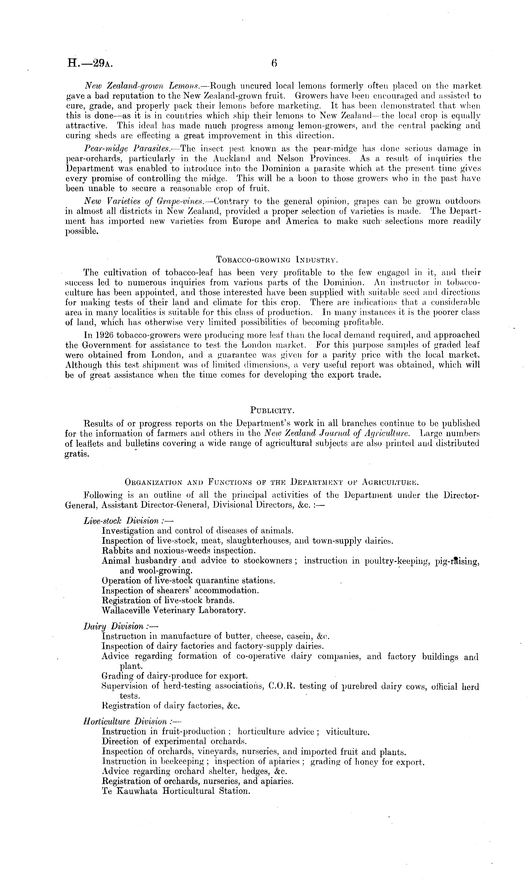 New Zealand-grown Lemons. —Rough uncured local lemons formerly often placed 011 the market gave a bad reputation to the New Zealand-grown fruit. Growers have been encouraged and assisted to cure, grade, and properly pack their lemons before marketing. It has been demonstrated that when this is done —as it is in countries which ship their lemons to New Zealand —the local crop is equally attractive. This ideal has made much progress among lemon-growers, and the central packing and curing sheds are effecting a great improvement in this direction. Pear-midge Parasites. —The insect pest known as the pear-midge has done serious damage in pear-orchards, particularly in the Auckland and Nelson Provinces. As a result of inquiries the Department was enabled to introduce into the Dominion a parasite which at the present time gives every promise of controlling the midge. This will be a boon to those growers who in the past have been unable to secure a reasonable crop of fruit. New Varieties of Grape-vines.—Contrary to the general opinion, grapes can be grown outdoors in almost all districts in New Zealand, provided a proper selection of varieties is made. The Department has imported new varieties from Europe and America to make such' selections more readily possible. Tobacco-growing Industry. The cultivation of tobacco-leaf has been very profitable to the few engaged in it, and their success led to numerous inquiries from various parts of the Dominion. An instructor in tobaccoculture has been appointed, and those interested have been supplied with suitable seed and directions for making tests of their land and climate for this crop. There are indications that a considerable area in many localities is suitable for this class of production. In many instances it is the poorer class of land, which has otherwise very limited possibilities of becoming profitable. In 1926 tobacco-growers were producing more leaf than the local demand required, and approached the Government for assistance to test the London market. For this purpose samples of graded leaf were obtained from London, and a guarantee was given for a parity price with the local market. Although this test shipment was of limited dimensions, a very useful report was obtained, which will be of great assistance when the time comes for developing the export trade. Publicity. Results of or progress reports on the Department's work in all branches continue to be published for the information of farmers and others in the New Zealand Journal of Agriculture. Large numbers of leaflets and bulletins covering a wide range of agricultural subjects are also printed and distributed gratis. Organization and Functions of the Department of Agriculture. Following is an outline of all the principal activities of the Department under the DirectorGeneral, Assistant Director-General, Divisional Directors, &c. Live-stock Division: — Investigation and control of diseases of animals. Inspection of live-stock, meat, slaughterhouses, and town-supply dairies. Rabbits and noxious-weeds inspection. Animal husbandry and advice to stockowners ; instruction in poultry-keeping, pig-rSising, and wool-growing. Operation of live-stock quarantine stations. Inspection of shearers' accommodation. Registration of live-stock brands. Wallaceville Veterinary Laboratory. Dairy Division :—- Instruction in manufacture of butter, cheese, casein, &c. Inspection of dairy factories and factory-supply dairies. Advice regarding formation of co-operative dairy companies, and factory buildings and plant. Grading of dairy-produce for export. Supervision of herd-testing associations, C.O.R. testing of purebred dairy cows, official herd tests. Registration of dairy factories, &c. Horticulture Division: — Instruction in fruit-production ; horticulture advice ; viticulture. Direction of experimental orchards. Inspection of orchards, vineyards, nurseries, and imjrorted fruit and plants. Instruction in beekeeping ; inspection of apiaries ; grading of honey for export. Advice regarding orchard shelter, hedges, &c. Registration of orchards, nurseries, and apiaries. Te Kauwhata Horticultural Station.