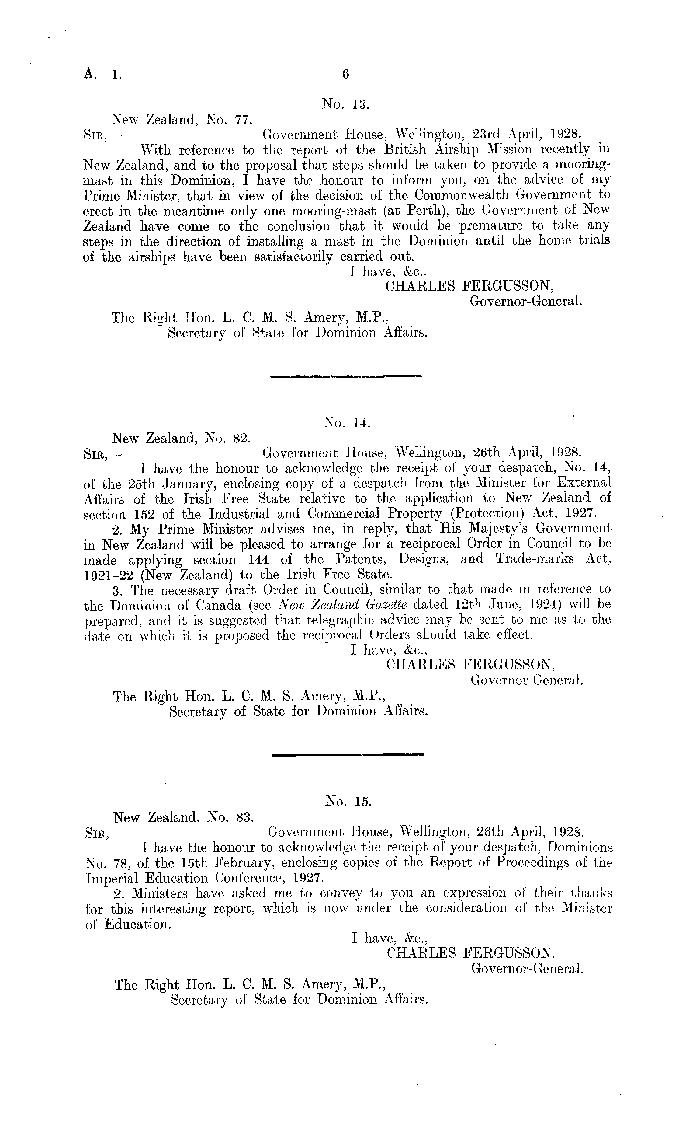 No. 13. New Zealand, No. 77. Sir,- Government House, Wellington, 23rd April, 1928. With reference to the report of the British Airship Mission recently in New Zealand, and to the proposal that steps should be taken to provide a mooringmast in this Dominion, 1 have the honour to inform you, on the advice of my Prime Minister, that in view of the decision of the Commonwealth Government to erect in the meantime only one mooring-mast (at Perth), the Government of New Zealand have come to the conclusion that it would be premature to take any steps in the direction of installing a mast in the Dominion until the home trials of the airships have been satisfactorily carried out. I have, &c., CHARLES FERGUSSON, Governor-General. The Right Hon. L. C. M. S. Amery, M.P., Secretary of State for Dominion Affairs.