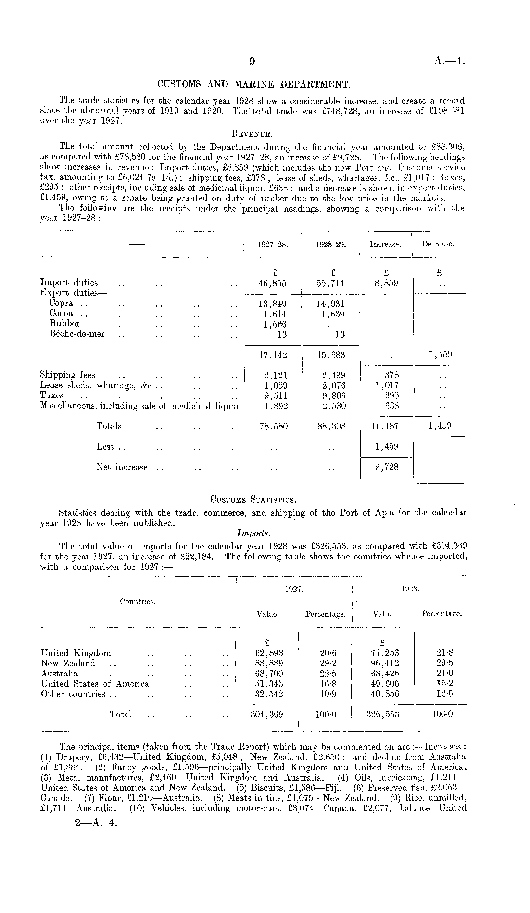 Customs Statistics. Statistics dealing with the trade, commerce, and shipping of the Port of Apia for the calendar year 1928 have been published. Imports. The total value of imports for the calendar year 1928 was £326,553, as compared with £304,369 for the year 1927, an increase of £22,184. The following table shows the countries whence imported, with a comparison for 1927 : —•