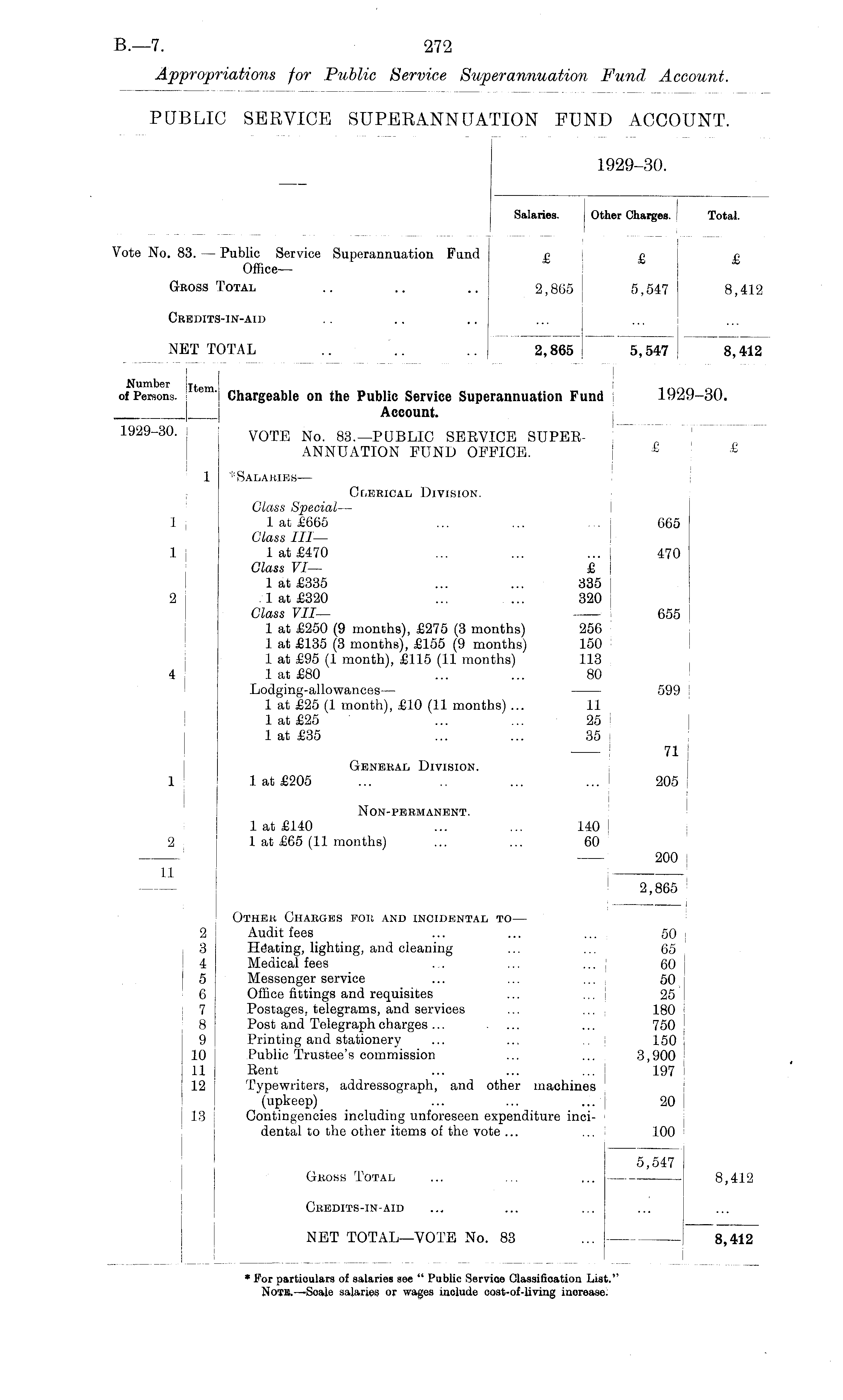 1929-30. Salaries. ! Other Charges. ' Total. J J Vote No. 83. — Public Service Superannuation Fund £ £ £ Office— Gross Total .. .. .. 2,865 5,547 8,412 Credits-in-aid NET TOTAL .. '.. ...' 2,865 5,547 8,412 ! Number jjt em i md f of Persons. ' Chargeable on the Public Service Superannuation Fund 1929-30. _|_ Account. 1929-30. | V0TE No 83.—PUBLIC SERVICE SUPERANNUATION FUND OFFICE. j £ 1 £ 1 * Salaries— j. Clerical Division. Glass Special— 1 1 at £665 ... ... ... j 665 Glass III— 1 1 at £470 ... ... ... ! 470 Class VI— £ : 1 at £335 ... ... 335 2 j 1 at £320 ... ... 320 Class VII— 655 1 at £250 (9 months), £275 (3 months) 256 1 at £135 (3 months), £155 (9 months) 150 1 at £95 (1 month), £115 (11 months) 113 4 1 at £80 ... ... 80 Lodging-allowances— —— 599 1 at £25 (1 month), £10 (11 months) ... 11 1 at £25 ... ... 25 1 at £35 ... ... 35 — 71 General Division. 1 1 at £205 ... .. ... ... 205 Non-permanent. 1 at £140 ... ... 140 2 1 at £65 (11 months) ... ... 60 — 1 200 11 — 1 2,865 j Other Charges for and incidental to — 2 Audit fees ... ... ... 50 3 Heating, lighting, and cleaning ... ... 65 4 Medical fees ... ... ... 60 5 Messenger service ... ... ... 50 6 Office fittings and requisites ... ... 1 25 7 Postages, telegrams, and services ... ... 180 8 Post and Telegraph charges... ... ... 750 9 Printing and stationery ... ... 150 10 Public Trustee's commission ... ... 3,900 11 Rent ... ... ... | 197 12 Typewriters, addressograph, and other machines (upkeep) ... ... ... i 20 13 Contingencies including unforeseen expenditure incidental to the other items of the vote ... ... 100 5,547 Gross Total ... ... ... 8,412 Credits-in-aid NET TOTAL—VOTE No. 83 ... 8,412 * For particulars of salaries see " Public Service Classification List." Note.— Soale salaries or wages include cost-of-living inorease.