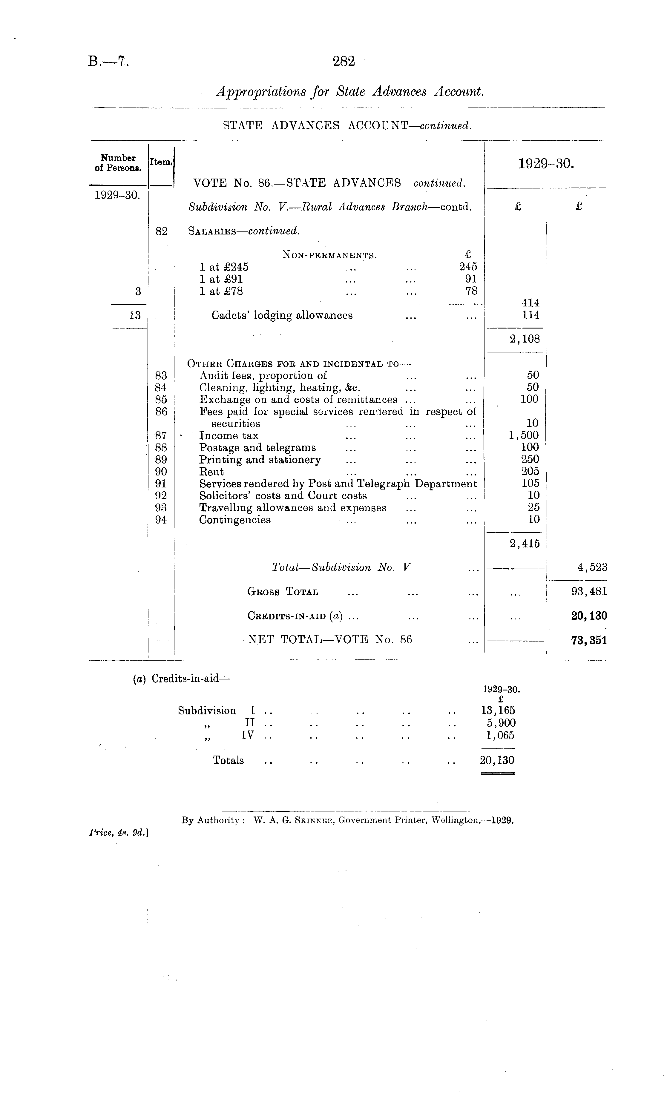 of N Pe™on.. Item, | 1929-30. VOTE No. 86.—STATE ADVANCES—continued. 1929-30. Subdivision No. V.—Rural Advances Branch —contd. £ £ 82 Salaries —continued. Non-permanents. £ 1 at £245 ... ... 245 1 at £91 ... ... 91 3 1 at £78 ... ... 78 414 13 Cadets' lodging allowances ... ... 114 2,108 Other Charges for and incidental to — 83 Audit fees, proportion of ... ... 50 84 Cleaning, lighting, heating, &c. ... ... 50 85 Exchange on and costs of remittances ... ... 100 86 Fees paid for special services rendered in respect of securities ... ... ... 10 87 ■ Income tax ... ... ... 1,500 88 Postage and telegrams ... ... ... 100 89 Printing and stationery ... ... ... 250 90 Eent ... ... ... 205 ! 91 Services rendered by Post and Telegraph Department 105 92 Solicitors' costs and Court costs ... ... 10 93 Travelling allowances arid expenses ... ... 25 94 Contingencies ... ... ... 10 2,415 Total—Subdivision No. V ... — 4,523 Gross Total ... ... ... ... 93,481 Credits-in-aid (a) ... ... ... ... 20,130 NET TOTAL—VOTE No. 86 ... j 73,351