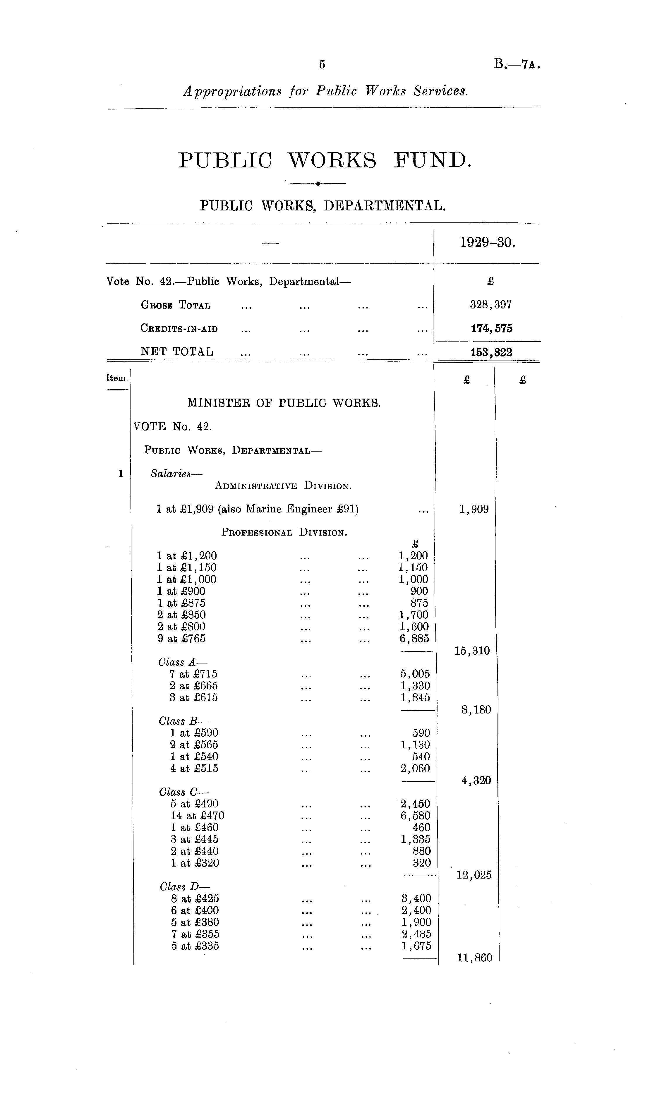 — 1929-30. Vote No. 42.—Public Works, Departmental — £ GKOSS Total ... ... ... ... 328,397 Credits-IN-AID ... ... ... ... 174,575 NET TOTAL ... .. ... ..._ 153,822 Item £ £ MINISTER OP PUBLIC WORKS. VOTE No. 42. Public Works, Departmental— 1 Salaries— Administrative Division. 1 at £1,909 (also Marine Engineer £91) ... 1,909 Professional Division. £ 1 at £1,200 ... ... 1,200 1 at £1,150 ... ... 1,150 1 at £1,000 ... ... 1,000 1 at £900 ... ... 900 1 at £875 ... ... 875 2 at £850 ... ... 1,700 2 at £800 ... ... 1,600 9 at £765 ... ... 6,885 15,310 Class A— 7 at £715 ... ... 5,005 2 at £665 ... ... 1,330 3 at £615 ... ... 1,845 • 8,180 Class B— 1 at £590 ... ... 590 2 at £565 ... ... 1,130 1 at £540 ... ... 540 4 at £515 ... ... 2,060 — 4,320 Class C— 5 at £490 ... ... 2,450 14 at £470 ... ... 6,580 1 at £460 ... ... 460 3 at £445 ... ... 1,335 2 at £440 ... ... 880 1 at £320 ... ... 320 12,025 Glass D— 8 at £425 ... ... 3,400 6 at £400 ... .... 2,400 5 at £380 ... ... 1,900 7 at £355 ... ... 2,485 5 at £335 ... ... 1,675 11,860