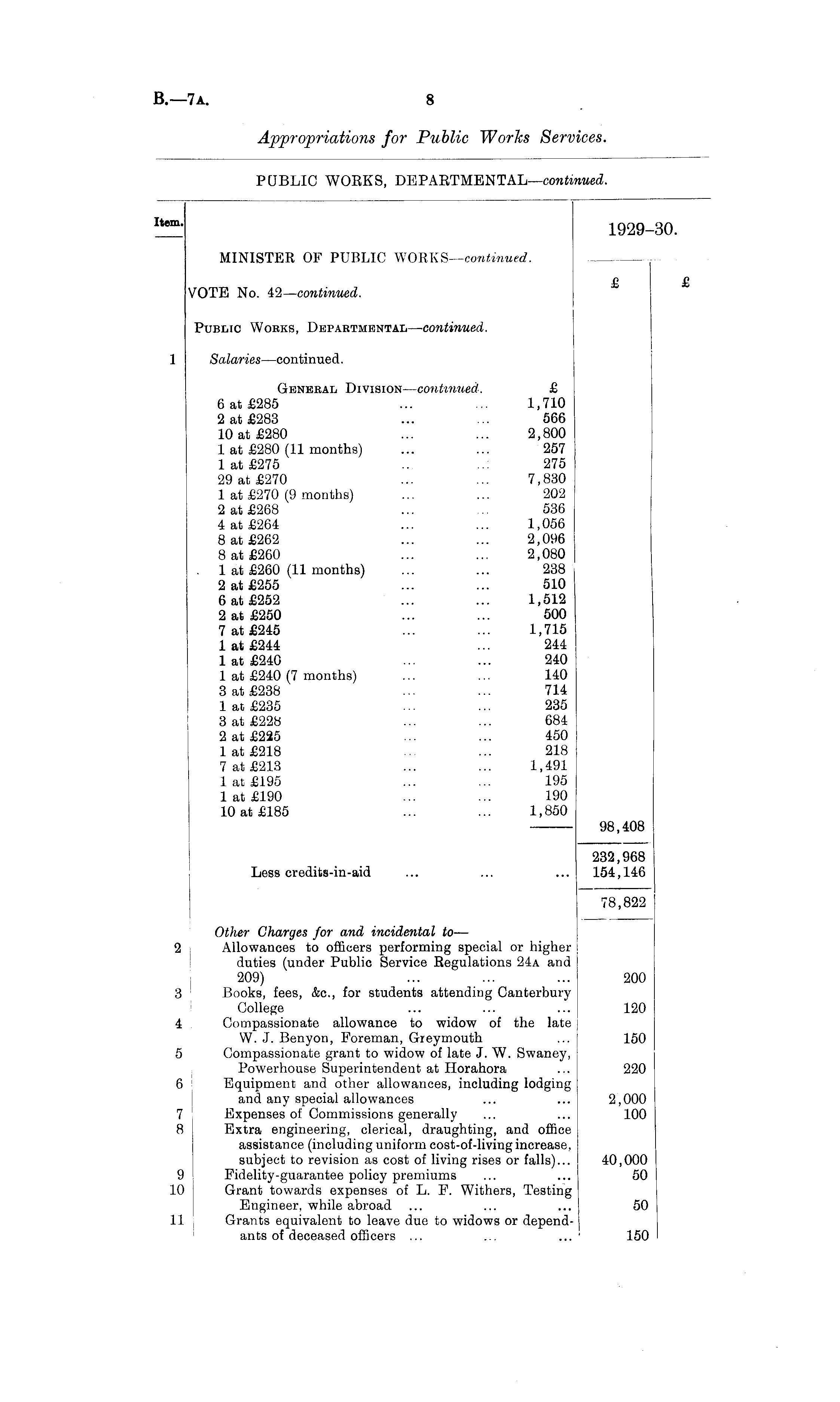 Item - 1929-30. MINISTER OF PUBLIC WORKS—continued. P £ VOTE No. 42—continued. Public Works, Departmental—continued. 1 Salaries—continued. General Division —continued. £ 6 at £285 ... ... 1,710 2 at £283 ... ... 566 10 at £280 ... ... 2,800 1 at £280 (11 months) ... ... 257 1 at £275 .. 275 29 at £270 ... ... 7,830 1 at £270 (9 months) ... ... 202 2 at £268 ... ... 536 4 at £264 ... ... 1,056 8 at £262 ... ... 2,096 8 at £260 ... ... 2,080 1 at £260 (11 months) ... ... 238 i 2 at £255 ... ... 510 6 at £252 ... ... 1,512 2 at £250 ... ... 500 7 at £245 ... ... 1,715 1 at £244 ... 244 1 at £240 ... ... 240 1 at £240 (7 months) ... ... 140 3 at £238 ... ... 714 1 at £235 ... ... 235 3 at £228 ... ... 684 2 at £225 ... ... 450 1 at £218 ... ... 218 7 at £213 ... ... 1,491 1 at £195 ... ... 195 1 at £190 ... ... 190 10 at £185 ... ... 1,850 98,408 232,968 Less credits-in-aid ... ... ... 154,146 78,822 Other Charges for and i?icidental to— 2 Allowances to officers performing special or higher duties (under Public Service Regulations 24a and 209) ... ... ... 200 3 Books, fees, &c., for students attending Canterbury College ... ... ... 120 4 Compassionate allowance to widow of the late W. J. Benyon, Foreman, Greymouth ... 150 5 Compassionate grant to widow of late J. W. Swaney, Powerhouse Superintendent at Horahora ... 220 6 Equipment and other allowances, including lodging and any special allowances ... ... 2,000 7 Expenses of Commissions generally ... ... 100 8 Extra engineering, clerical, draughting, and office assistance (including uniform cost-of-living increase, subject to revision as cost of living rises or falls)... 40,000 9 Fidelity-guarantee policy premiums ... ... 50 10 Grant towards expenses of L. F. Withers, Testing Engineer, while abroad ... ... ... 50 11 Grants equivalent to leave due to widows or dependants of deceased officers ... ... ... ' 150