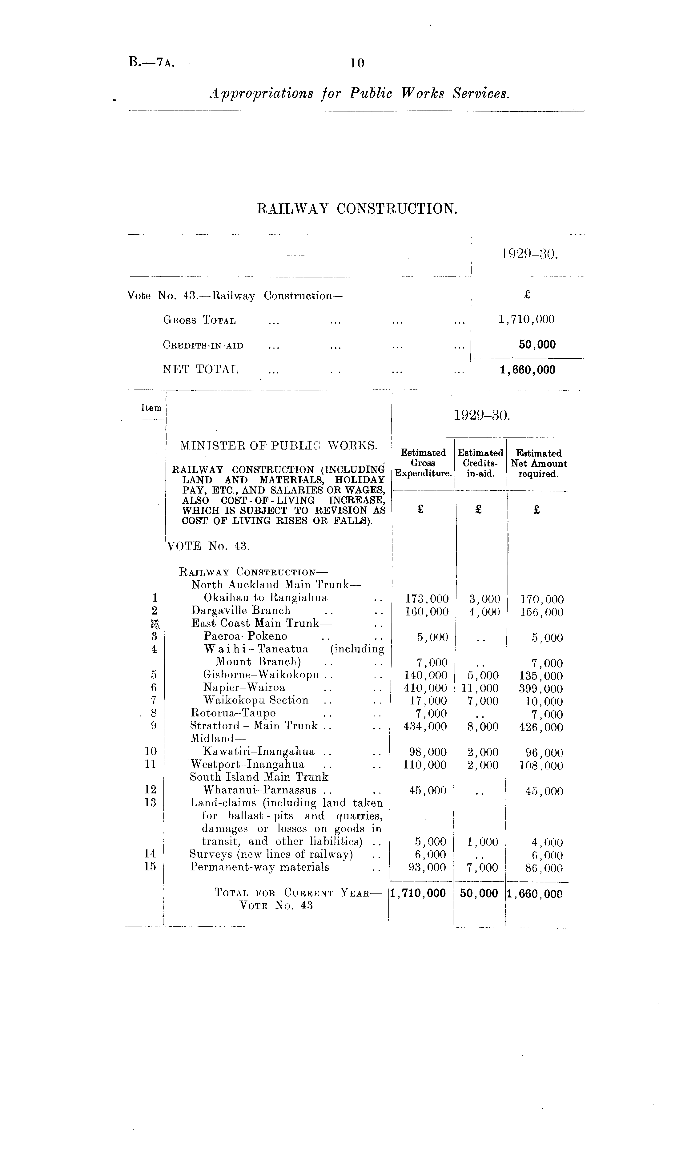 1929-30. Vote No. 43.—Railway Construction — £ GROSS Total ... ... ... ... 1,710,000 CBEDITS-IN-AID ... ... ... ... 50,000 NET TOTAL ... . . ... ... 1,660,000 ~ "T~ ~ Item 1929-30. MINISTER OF PUBLIC WORKS. 7, L .. \ JLetimated | Estimated | Estimated Gross Credits- Net Amount RAILWAY CONSTRUCTION (INCLUDING ExDenditure in aid renuired LAND AND MATERIALS, HOLIDAY P lt m ald ' re <l uired - PAY, ETC., AND SALARIES OR WAGES, — ALSO COST - OF - LIVING INCREASE, WHICH IS SUBJECT TO REVISION AS £ £ £ COST OF LIVING RISES OR FALLS). VOTE No. 43. Railway Construction — North Auckland Main Trunk— 1 Okaihau to Rangiahua .. 173,000 3,000 170,000 2 Dargaville Branch .. .. 160,000 4,000 156,000 East Coast Main Trunk — 3 Paeroa-Pokeno .. .. 5,000 .. { 5,000 4 W a i h i - Taneatua (including Mount Branch) .. .. 7,000 .. 7,000 5 Gisborne-Waikokopu .. .. 140,000 5,000 ' 135,000 6 Napier-Wairoa .. .. 410,000 11,000 399,000 7 Waikokopu Section .. .. 17,000 j 7,000 i 10,000 . 8 Rotorua-Taupo .. .. 7,000 .. ! 7,000 9 Stratford - Main Trunk .. .. 434,000 8,000 426,000 Midland — 10 Kawatiri-Inangahua .. .. 98,000 2,000 96,000 11 Westport-Inangahua .. .. 110,000 2,000 108,000 South Island Main Trunk— 12 Wharanui-Parnassus .. .. 45,000 .. 45,000 13 Land-claims (including land taken for ballast - pits and quarries, damages or losses on goods in transit, and other liabilities) .. 5,000 | 1,000 4,000 14 Surveys (new lines of railway) .. 6,000 .. 6,000 15 Permanent-way materials .. 93,000 . 7,000 86,000 Total for Current Year — 1,710,000 50,000 1,660,000 Vote No. 43