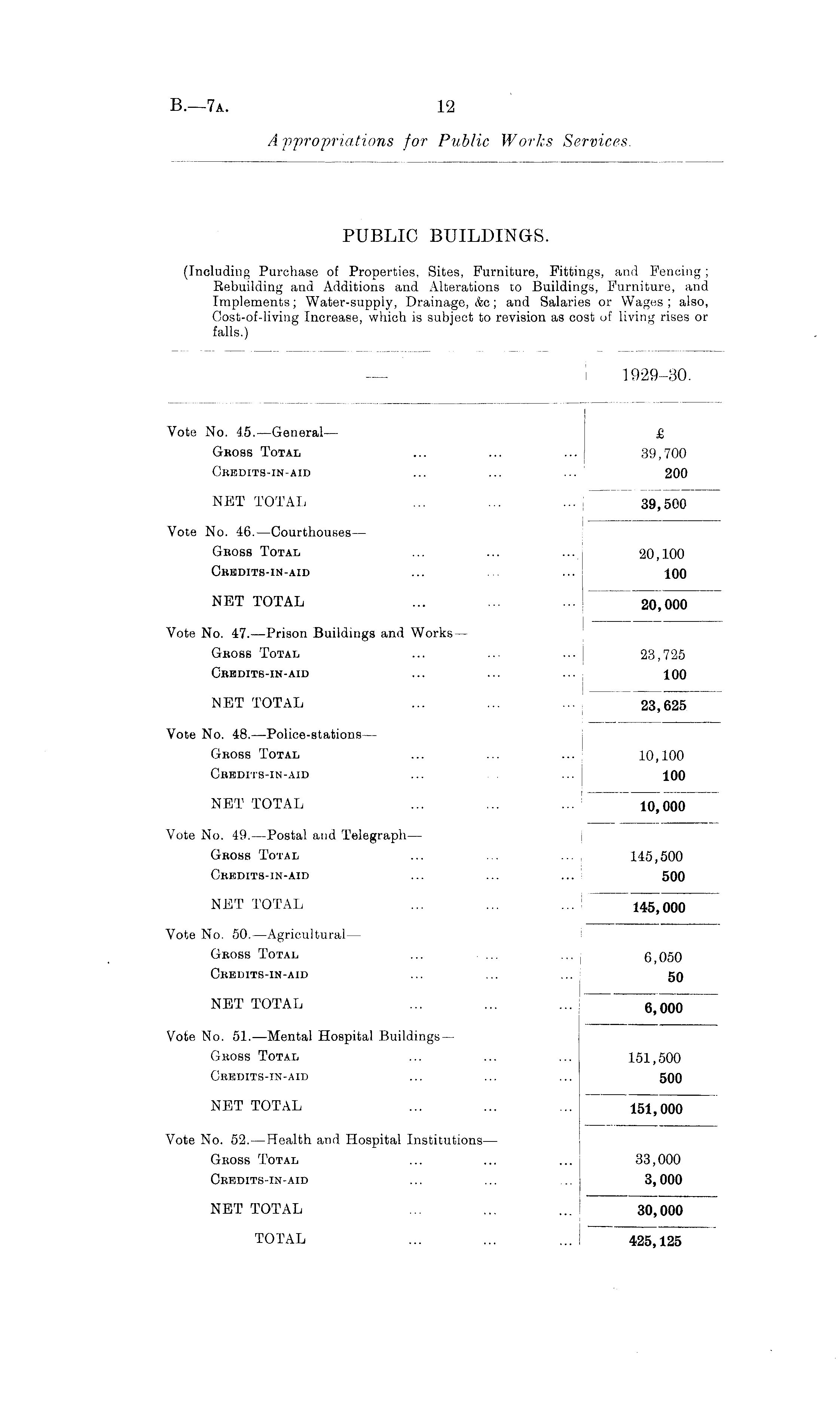 — ! 1929-30. Vote No. 45.—General— £ Gboss Total ... ... ... 39,700 Cbedits-in-aid ... ... ... 200 NET TOTAL ... ... ... 39,500 Vote No. 46.—Courthouses— Gboss Total ... ... ... '20,100 Cbedits-in-aid ... ... 100 NET TOTAL ... ... ... 20,000 Vote No. 47.—Prison Buildings and Works — Gross Total ... .. ... 23,725 Cbedits-in-aid ... ... ... 100 NET TOTAL ... ... ... 23,625 Vote No. 48.—Police-stations— Gross Total ... ... ... 10,100 Cbedits-in-aid ... ... 100 NET TOTAL ... ... ... 10,000 Vote No. 49.—Postal and Telegraph — Gboss Total ... ... ... 145,500 Credits-in-aid ... ... ... 500 NET TOTAL ... ... ... M5^000~ Vote No. 50. —Agricultural— Gboss Total ... ... j 6,050 Credits-in-aid ... ... ... 50 NET TOTAL ... ... ... 6,000 Vote No. 51. —Mental Hospital Buildings — Gross Total ... ... ... 151,500 Credits-in-aid ... ... ... 500 NET TOTAL ... ... ... 151,000 Vote No. 52.—Health and Hospital Institutions— Gross Total ... ... ... 33,000 Credits-in-aid ... ... ... 3,000 NET TOTAL ... ... ... 30,000 TOTAL ... ... ... 425,125