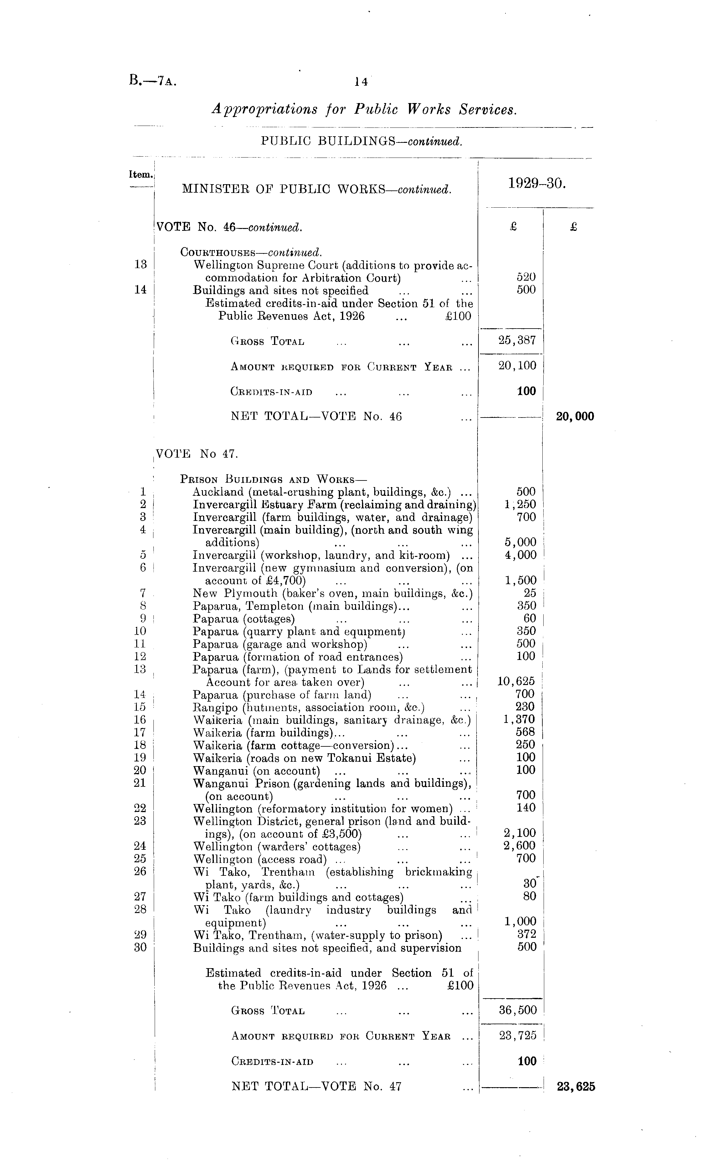 j Item. MINISTER OF PUBLIC WORKS—continued. 1929-30. VOTE No. 46—continued. £ £ Courthouses—continued. 13 Wellington Supreme Court (additions to provide accommodation for Arbitration Court) ... 520 14 Buildings and sites not specified ... ... 500 Estimated credits-in-aid under Section 51 of the Public Revenues Act, 1926 ... £100 Gross Total ... ... ... 25,387 Amount required for Current Year ... 20,100 Crbdits-in-AID ... ... ... 100 NET TOTAL—VOTE No. 46 ... 20,000 VOTE No 47. Prison Buildings and Works— 1 Auckland (metal-crushing plant, buildings, &c.) ... 500 2 Invercargill Estuary Earm (reclaiming and draining) 1,250 3 Invercargill (farm buildings, water, and drainage) 700 4 Invercargill (main building), (north and south wing additions) ... ... ... 5,000 5 Invercargill (workshop, laundry, and kit-room) ... 4,000 6 1 Invercargill (new gymnasium and conversion), (on account of £4,700) ... ... ... 1,500 7 New Plymouth (baker's oven, main buildings, &c.) 25 8 Paparua, Templeton (main buildings)... ... 350 9 ! Paparua (cottages) ... ... ... 60 10 Paparua (quarry plant and equipment] ... 350 11 Paparua (garage and workshop) ... ... 500 12 Paparua (formation of road entrances) ... 100 13 | Paparua (farm), (payment to Lands for settlement Account for area taken over) ... ... 10,625 14 , Paparua (purchase of farm land) ... ... 700 15 Rangipo (hutments, association room, &c.) ... 230 16 | Wailceria (main buildings, sanitary drainage, &c.) 1,370 17 Wailceria (farm buildings)... ... ... 568 18 Wailceria (farm cottage—conversion)... ... 250 19 Wailceria (roads on new Tokanui Estate) ... 100 20 Wanganui (on account) ... ... ... 100 21 Wanganui Prison (gardening lands and buildings), (on account) ... ... ... 700 22 1 Wellington (reformatory institution for women) ... 140 23 I Wellington District, general prison (land and buildings), (on account of £3,500) ... ... 2,100 24 | Wellington (warders'cottages) ... ... 2,600 25 Wellington (access road) ... ... ... 700 26 , Wi Tako, Trentham (establishing brickmaking plant, yards, &c.) ... ... ... 30 27 | Wi Tako (farm buildings and cottages) ... 80 28 ■ Wi Tako (laundry industry buildings and equipment) ... ... ... 1,000 29 : Wi Tako, Trentham, (water-supply to prison) ... 372 30 | Buildings and sites not specified, and supervision 500 Estimated credits-in-aid under Section 51 of the Public Revenues Act, 1926 ... £100 Gross Total ... ... ... 36,500 Amount required for Current Year ... 23,725 Credits-in-aid ... ... ... 100 NET TOTAL—VOTE No. 47 ... 23,625