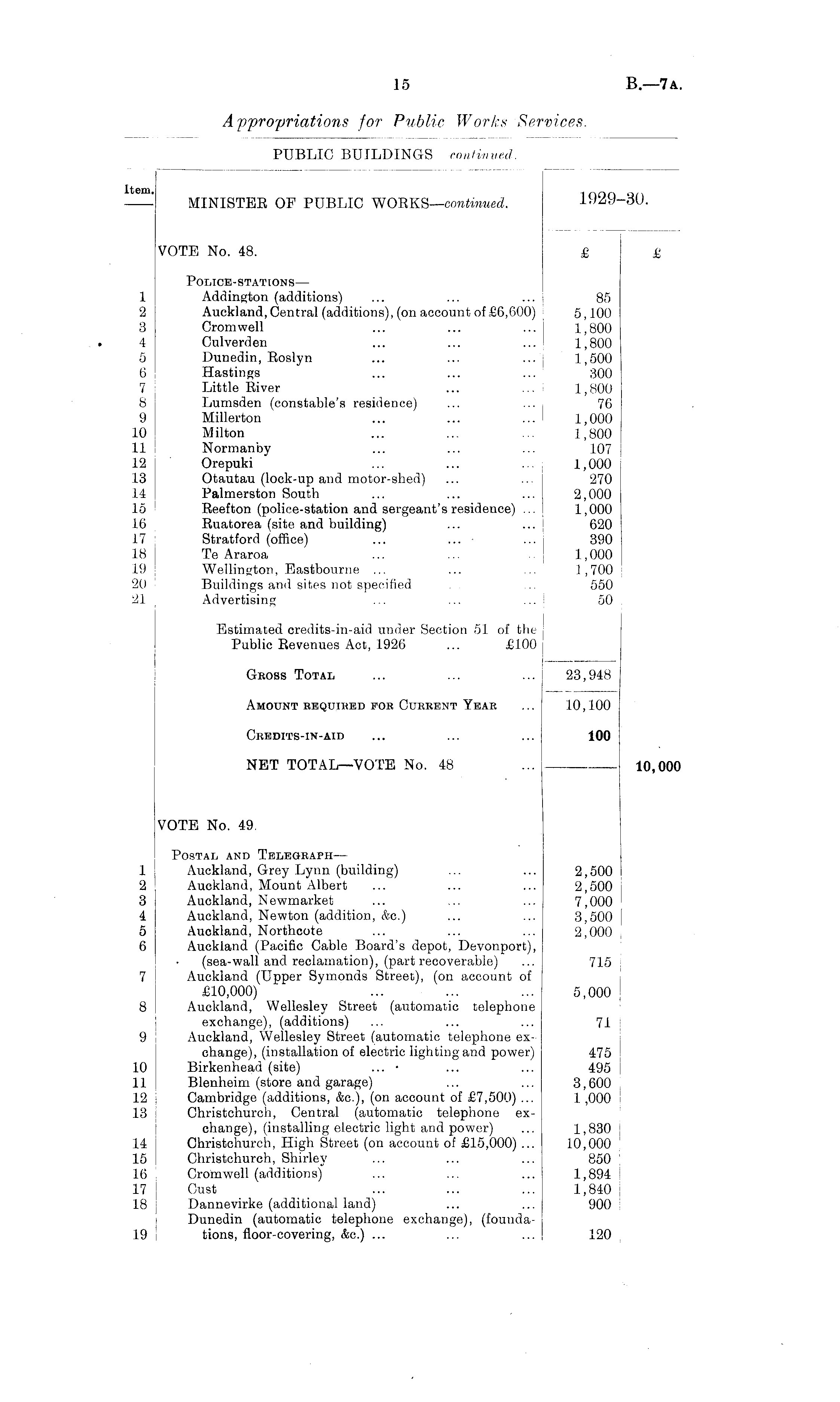 MINISTER OF PUBLIC WORKS—continued. 1929-30. VOTE No. 48. £ £ Police-stations—• 1 Addington (additions) ... ... ... 85 2 Auckland,Central (additions), (on account of £6,600) 5,100 3 Cromwell ... ... ... 1,800 4 Culverden ... ... ... 1,800 5 Dunedin, Roslyn ... ... ... 1,500 6 Hastings ... ... ... 300 7 Little River ... ... 1,800 8 Lumsden (constable's residence) ... ... 76 9 Millerton ... ... ... 1,000 10 Milton ... ... ... 1,800 11 Normanby ... ... ... 107 12 Orepuki ... ... .. 1,000 13 Otautau (lock-up and motor-shed) ... ... 270 14 Palmerston South ... ... ... 2,000 15 Reefton (police-station and sergeant's residence) ... 1,000 16 Ruatorea (site and building) ... ... 620 17 Stratford (office) ... ... ... 390 18 Te Araroa ... ... 1,000 19 Wellington, Eastbourne ... ... ... 1,700 20 Buildings and sites not specified .. 550 21 Advertising ... ... ... j 50 Estimated credits-in-aid under Section 51 of the Public Revenues Act, 1926 ... £100 Gross Total ... ... ... 23,948 Amount required for Current Year ... 10,100 Credits-in-aid ... ... ... 100 NET TOTAL—VOTE No. 48 ... 10,000 VOTE No. 49, Postal and Telegraph— j 1 Auckland, Grey Lynn (building) ... ... 2,500 1 2 Auckland, Mount Albert ... ... ... 2,500 3 Auckland, Newmarket ... ... ... 7,000 4 Auckland, Newton (addition, &c.) ... ... 3,500 [ 5 Auckland, Northcote ... ... ... 2,000 6 Auckland (Pacific Cable Board's depot, Devonport), (sea-wall and reclamation), (part recoverable) ... 715 7 Auckland (Upper Symonds Street), (on account of £10,000) ... ... ... 5,000 8 Auckland, Wellesley Street (automatic telephone exchange), (additions) ... ... ... 71 9 Auckland, Wellesley Street (automatic telephone exchange), (installation of electric lighting and power) 475 10 Birkenhead (site) ... • ... ... 495 11 Blenheim (store and garage) ... ... 3,600 12 Cambridge (additions, &c.), (on account of £7,500) ... 1,000 13 Christchurch, Central (automatic telephone exchange), (installing electric light and power) ... 1,830 14 Christchurch, High Street (on account of £15,000) ... 10,000 15 Christchurch, Shirley ... ... ... 850 16 Cromwell (additions) ... ... ... 1,894 17 Cust ... ... ... 1,840 18 Dannevirke (additional land) ... ... 900 Dunedin (automatic telephone exchange), (fouuda19 | tions, floor-covering, &c.) ... ... ... 120