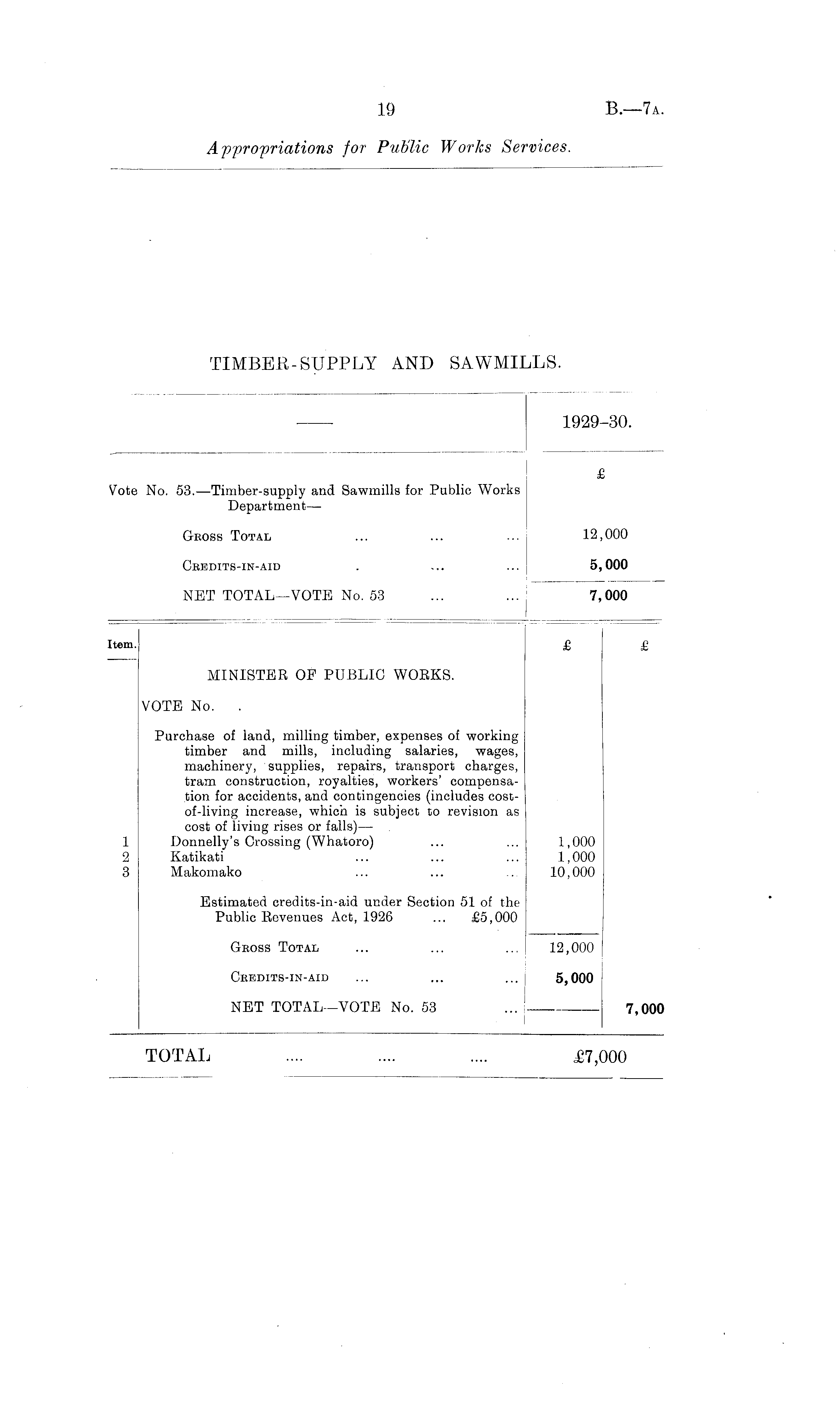 1929-30. I £ Vote No. 53.—Timber-supply and Sawmills for Public Works Department— G-BOSS Total ... ... ... 12,000 Credits-in-aid . ... ... 5,000 NET TOTAL—VOTE No. 53 ... ... 7,000 Item. £ £ MINISTER OF PUBLIC WORKS. VOTE No. . Purchase of land, milling timber, expenses of working timber and mills, including salaries, wages, machinery, supplies, repairs, transport charges, tram construction, royalties, workers' compensation for accidents, and contingencies (includes cost-of-living increase, which is subject to revision as cost of living rises or falls) — 1 Donnelly's Crossing (Whatoro) ... ... 1,000 2 Katikati ... ... ... 1,000 3 Makomako ... ... .. 10,000 Estimated credits-in-aid under Section 51 of the Public Revenues Act, 1926 ... £5,000 Gross Total ... ... ... 12,000 Credits-in-aid ... ... ... 5,000 NET TOTAL—VOTE No. 53 ... 7,000 TOTAL .... .... .... £7,000