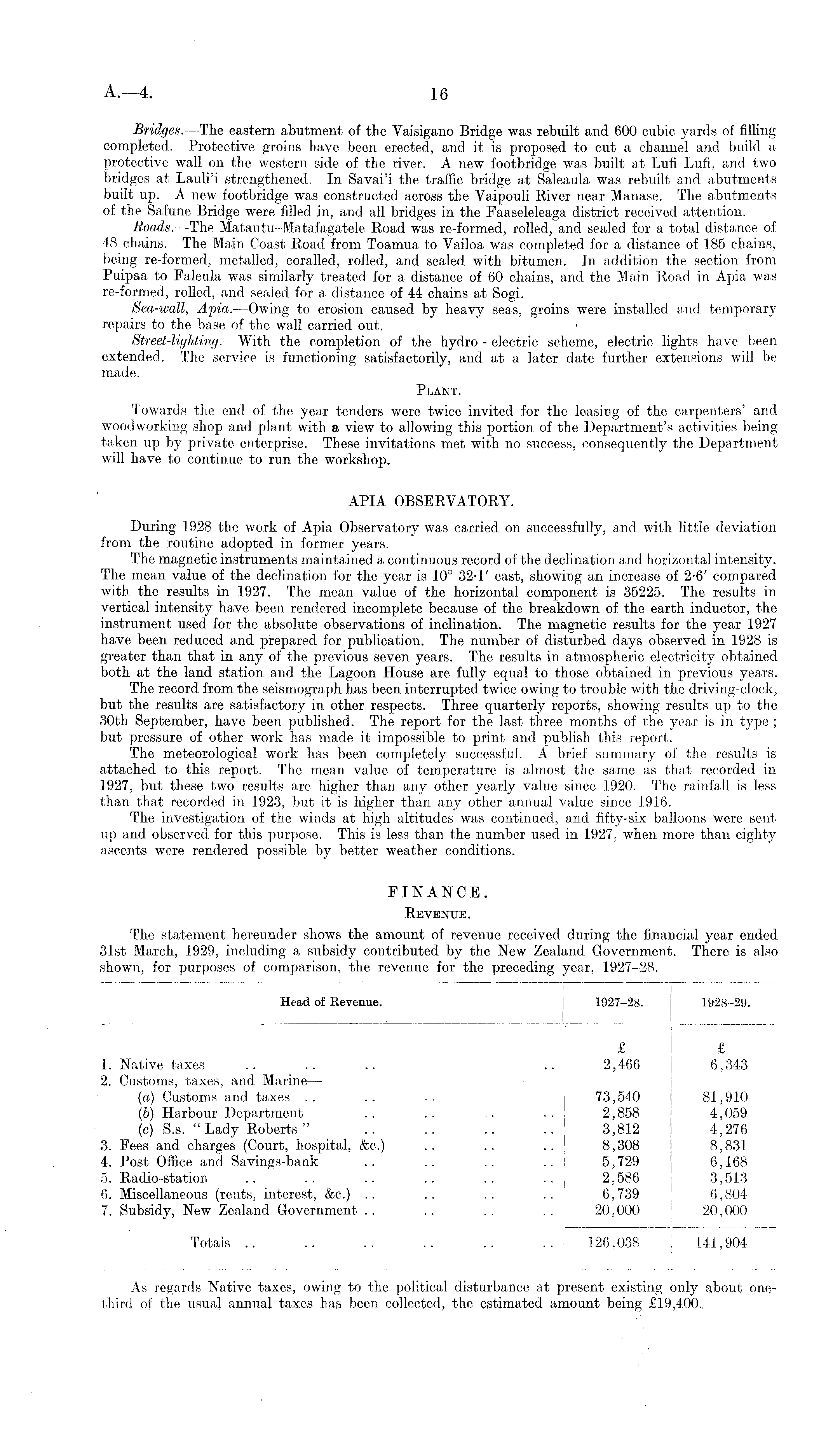 Bridges.—The eastern abutment of the Yaisigano Bridge was rebuilt and 600 cubic yards of filling completed. Protective groins have been erected, and it is proposed to cut a channel and build a protective wall on the western side of the river. A new footbridge was built at Lufi Lufi, and two bridges at Lauli'i strengthened. In Savai'i the traffic bridge at Saleaula was rebuilt and abutments built up. A new footbridge was constructed across the Vaipouli River near Manase. The abutments of the Safune Bridge were filled in, and all bridges in the Faaseleleaga district received, attention. Roads.—The Matautu-Matafagatele Road was re-formed, rolled, and sealed for a total distance of 48 chains. The Main Coast Road from Toamua to Yailoa was completed for a distance of 185 chains, being re-formed, metalled, coralled, rolled, and sealed with bitumen. In addition the section from Puipaa to Faleula was similarly treated for a distance of 60 chains, and the Main Road in Apia was re-formed, rolled, and sealed for a distance of 44 chains at Sogi. Sea-wall, Apia.—Qwing to erosion caused by heavy seas, groins were installed and temporary repairs to the base of the wall carried out. Street-lighting.—With the completion of the hydro - electric scheme, electric lights have been extended. The service is functioning satisfactorily, and at a later date further extensions will be made. Plant. Towards the end of the year tenders were twice invited for the leasing of the carpenters' and woodworking shop and plant with a view to allowing this portion of the Department's activities being taken up by private enterprise. These invitations met with no success, consequently the Department will have to continue to run the workshop. APIA OBSERVATORY. During 1928 the work of Apia Observatory was carried on successfully,. and with little deviation from the routine adopted in former years. The magnetic instruments maintained a continuous record of the declination and horizontal intensity. The mean value of the declination for the year is 10° 32-1' east, showing an increase of 2-6' compared with the results in 1927. The mean value of the horizontal component is 35225. The results in vertical intensity have been rendered incomplete because of the breakdown of the earth inductor, the instrument used for the absolute observations of inclination. The magnetic results for the year 1927 have been reduced and prepared for publication. The number of disturbed days observed in 1928 is greater than that in any of the previous seven years. The results in atmospheric electricity obtained both at the land station and the Lagoon House are fully equal to those obtained in previous years. The record from the seismograph has been interrupted twice owing to trouble with the driving-clock, but the results are satisfactory in other respects. Three quarterly reports, showing results up to the 30th September, have been published. The report for the last three months of the year is in type ; but pressure of other work has made it impossible to print and publish this report. The meteorological work has been completely successful. A brief summary of the results is attached to this report. The mean value of temperature is almost the same as that recorded in 1927, but these two results are higher than any other yearly value since 1920. The rainfall is less than that recorded in 1923, but it is higher than any other annual value since 1916. The investigation of the winds at high altitudes was continued, and fifty-six balloons were sent up and observed for this purpose. This is less than the number used in 1927, when more than eighty ascents were rendered possible by better weather conditions. FINANCE. Revenue. The statement hereunder shows the amount of revenue received during the financial year ended 31st March, 1929, including a subsidy contributed by the New Zealand Government. There is also shown, for purposes of comparison, the revenue for the preceding year, 1927-28.