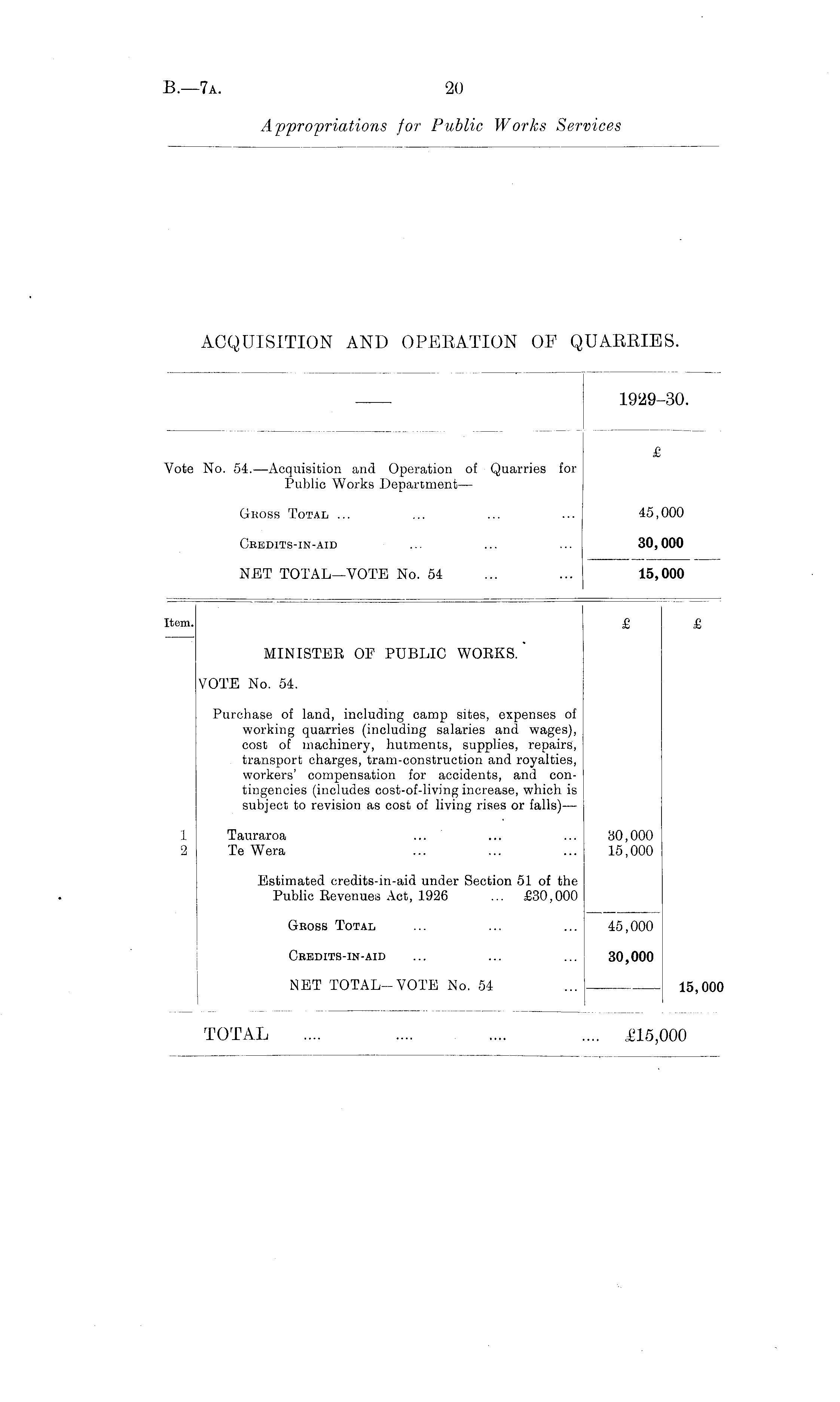 1929-30. £ Vote No. 54.—Acquisition and Operation of Quarries for Public Works Department— Gross Total ... ... ... ... 45,000 Credits-in-aid ... ... ... 30,000 NET TOTAL—VOTE No. 54 ... ... 15,000 Item. £ £ MINISTER OF PUBLIC WORKS. " VOTE No. 54. Purchase of land, including camp sites, expenses of working quarries (including salaries and wages), cost of machinery, hutments, supplies, repairs, transport charges, tram-construction and royalties, workers' compensation for accidents, and contingencies (includes cost-of-living increase, which is subject to revision as cost of living rises or falls) — 1 Tauraroa ... ... ... 30,000 2 Te Wera ... ... ... 15,000 Estimated credits-in-aid under Section 51 of the Public Revenues Act, 1926 ... £30,000 Gross Total ... ... ... 45,000 Credits-in-aid ... ... ... 30,000 NET TOTAL-VOTE No. 54 ... 15,000 I | TOTAL .... .... .... .... £15,000