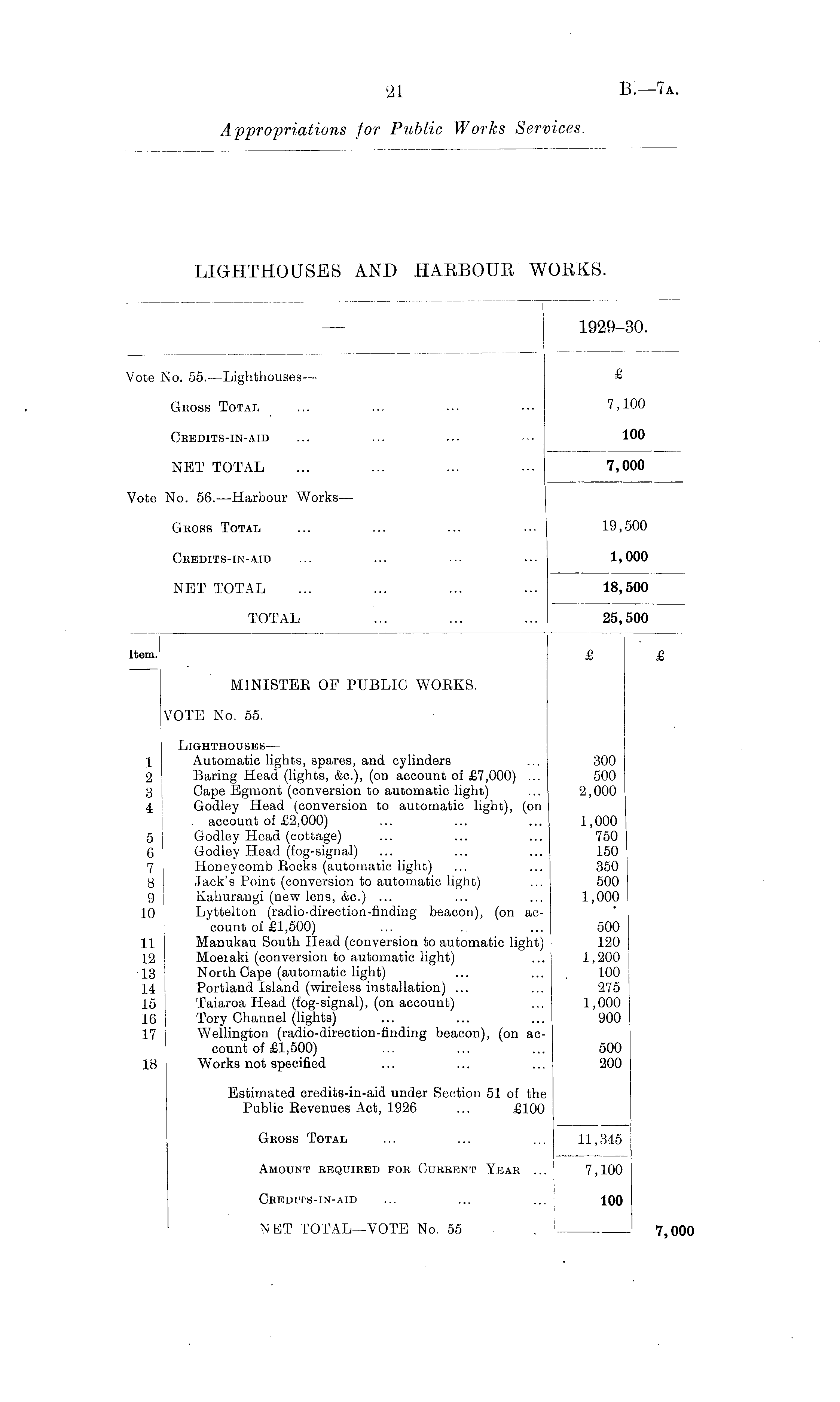 — 1929-30. Vote No. 55. —Lighthouses — £ Gboss Total ... ... ... ••• 7,100 Cbedits-in-aid ... ... ... • 100 NET TOTAL ... ... ... ... 7,000 Vote No. 56.—Harbour Works— Gross Total ... ... ... 19,500 Cbedits-in-aid ... ... ■■■ ... 1,000 NET TOTAL ... ... ... ... 18,500 TOTAL ... ... ... 25,500 Item. £ £ MINISTER OF PUBLIC WORKS. VOTE No. 55. Lighthouses— 1 | Automatic lights, spares, and cylinders ... 300 2 j Baring Head (lights, &c.), (on account of £7,000) ... 500 3 I Cape Egmont (conversion Co automatic light) ... 2,000 4 Godley Head (conversion to automatic light), (on account of £2,000) ... ... ... 1,000 5 Godley Head (cottage) ... ... ... 750 6 Godley Head (fog-signal) ... ... ... 150 7 Honeycomb Rocks (automatic light) ... ... 350 8 Jack's Point (conversion to automatic light) ... 500 9 Kahurangi (new lens, &c.) ... ... ... 1,000 10 Lyttelton (radio-direction-finding beacon), (on account of £1,500) ... ... 500 11 Manukau South Head (conversion to automatic light) 120 12 Moeiaki (conversion to automatic light) ... 1,200 13 North Cape (automatic light) ... ... . 100 14 Portland Island (wireless installation) ... ... 275 15 Taiaroa Head (fog-signal), (on account) ... 1,000 16 Tory Channel (lights) ... ... ... 900 17 Wellington (radio-direction-finding beacon), (on account of £1,500) ... ... ... 500 18 Works not specified ... ... ... 200 Estimated credits-in-aid under Section 51 of the Public Revenues Act, 1926 ... £100 Gkoss Total ... ... ... 11,345 Amount bequibed fob Cubbent Yeab ... 7,100 Cbedits-in-aid ... ... ... 100 NET TOTAL—VOTE No. 55 . — 7,000