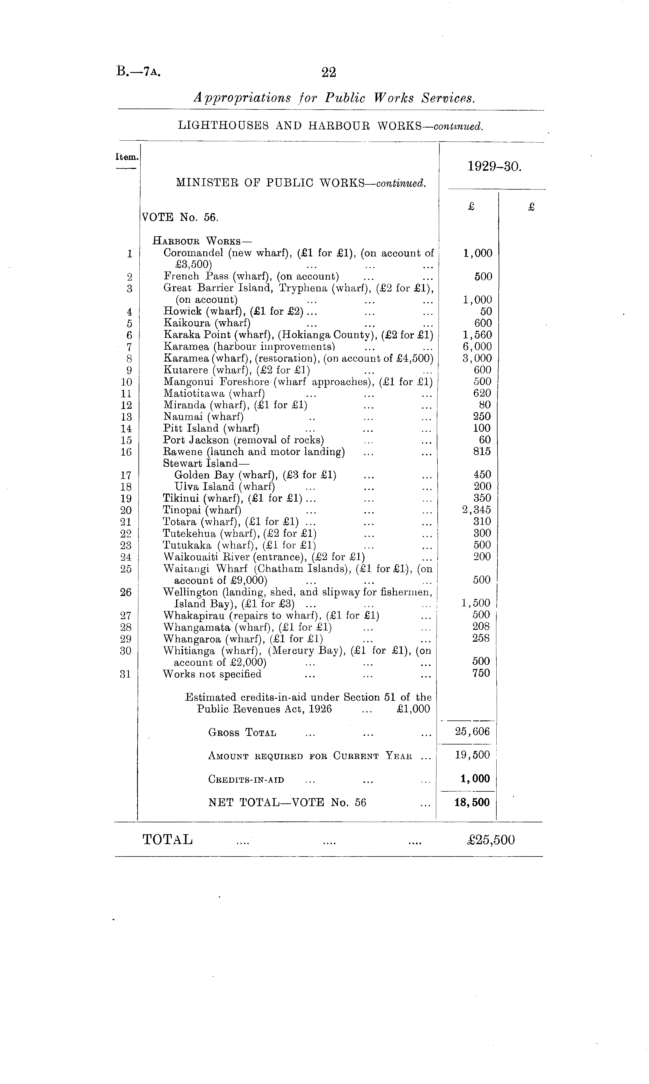 Item. 1929-30. MINISTER OF PUBLIC WORKS—continued. £ £ VOTE No. 56. Harbour Works— 1 Coromandel (new wharf), (£1 for £1), (on account of 1,000 £3,500) 2 | French Pass (wharf), (on account) ... ... 500 3 Great Barrier Island, Tryphena (wharf), (£2 for £1), (on account) ... ... ... 1,000 4 Howick (wharf), (£1 for £2)... ... ... 50 5 Kaikoura (wharf) ... ... ... 600 6 Karaka Point (wharf), (Hokianga County), (£2 for £1) 1,560 7 Karamea (harbour improvements) ... ... 6,000 8 Karamea (wharf), (restoration), (on account of £4,500) 3,000 9 Kutarere (wharf), (£2 for £]) ... ... 600 10 Mangonui Foreshore (wharf approaches), (£1 for £1) 500 11 Matiotitawa (wharf) ... ... ... 620 12 Miranda (wharf), (£1 for £1) ... ... 80 13 Naumai (wharf) .. ... ... 250 14 Pitt Island (wharf) ... ... ... 100 15 Port Jackson (removal of rocks) ... ... 60 16 Rawene (launch and motor landing) ... ... 815 Stewart Island —- 17 Golden Bay (wharf), (£3 for £1) ... ... 450 18 Ulva Island (wharf) ... ... ... 200 19 Tikinui (wharf), (£1 for £1) ... ... ... 350 20 Tinopai (wharf) ... ... ... 2,345 21 Totara (wharf), (£1 for £1) ... ... ... 310 22 Tutekehua (wharf), (£2 for £1) ... ... 300 23 Tutukaka (wharf), (£1 for £1) ... ... 500 24 Waikouaiti River (entrance), (£2 for £1) ... 200 25 Waitangi Wharf (Chatham Islands), (£1 for£l), (on account of £9,000) ... ... ... 500 26 ! Wellington (landing, shed, and slipway for fishermen, Island Bay), (£1 for £3) ... ... ... 1,500 | 27 Whakapirau (repairs to wharf), (£1 for £1) ... 500 28 Whangamata (wharf), (£1 for £1) ... ... 208 29 Whangaroa (wharf), (£1 for £1) ... ... 258 30 Whitianga (wharf), (Mercury Bay), (£1 for £1), (on account of £2,000) ... ... ... 500 31 Works not specified ... ... ... 750 Estimated credits-in-aid under Section 51 of the Public Revenues Act, 1926 ... £1,000 GROSS Total ... ... ... 25,606 Amount required for Current Year ... 19,500 Credits-in-aid ... ... .. 1,000 NET TOTAL—VOTE No. 56 ... 18,500 TOTAL .... .... .... £25,500