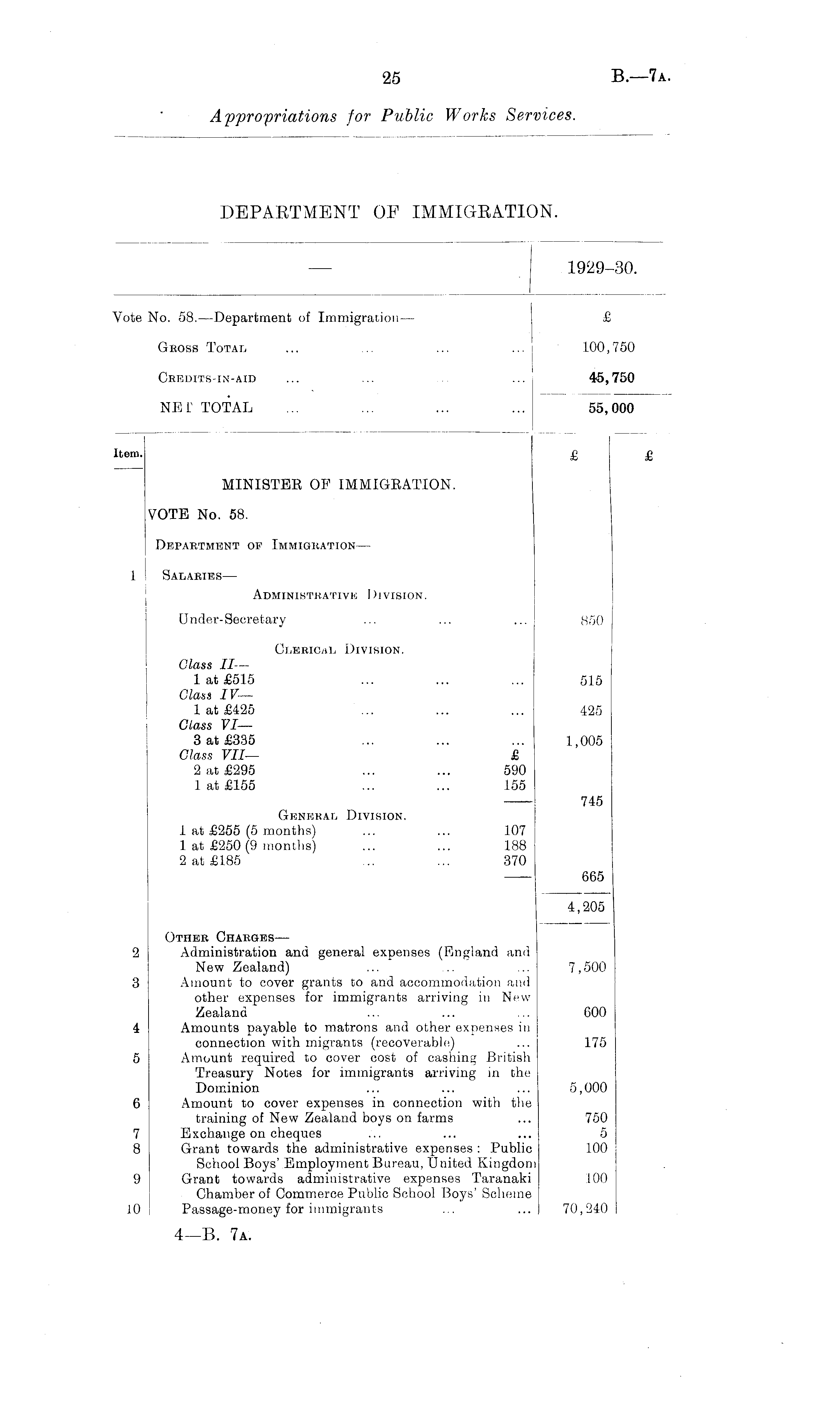 — | 1929-30. Vote No. 58.—Department of Immigration— £ GROSS Total ... ... ... ... 100,750 Credits-IN-aid ... ... ... 45,750 NET TOTAL ... ... ... ... 55,000 Item. £ £ MINISTER OF IMMIGRATION. VOTE No. 58. Department op Immigration— 1 SalariesAdministrative Division. Under-Secretary ... ... ... 850 Clerical Division. Class II— 1 at £515 ... ... ... 515 Glass IV— 1 at £425 ... ... ... 425 Class VI — 3 at £335 ... ... ... 1,005 Class VII— £ 2 at £295 ... ... 590 1 at £155 ... ... 155 745 General Division. 1 at £255 (5 months) ... ... 107 1 at £250 (9 months) ... ... 188 2 at £185 ... ... 370 665 4,205 Other Charges— 2 Administration and general expenses (England and New Zealand) ... .. ... 7,500 3 Amount to cover grants to and accommodation and other expenses for immigrants arriving in New Zealand ... ... ... 600 4 Amounts payable to matrons and other expenses in connection with migrants (recoverable) ... 175 5 Amount required to cover cost of cashing British Treasury Notes for immigrants arriving in the Dominion ... ... ... 5,000 6 Amount to cover expenses in connection with the training of New Zealand boys on farms ... 750 7 Exchange on cheques ... ... ... 5 8 Grant towards the administrative expenses : Public 100 School Boys' Employment Bureau, United Kingdom 9 Grant towards administrative expenses Taranaki 100 Chamber of Commerce Public School Boys' Scheme 10 Passage-money for immigrants ... ... 70,240
