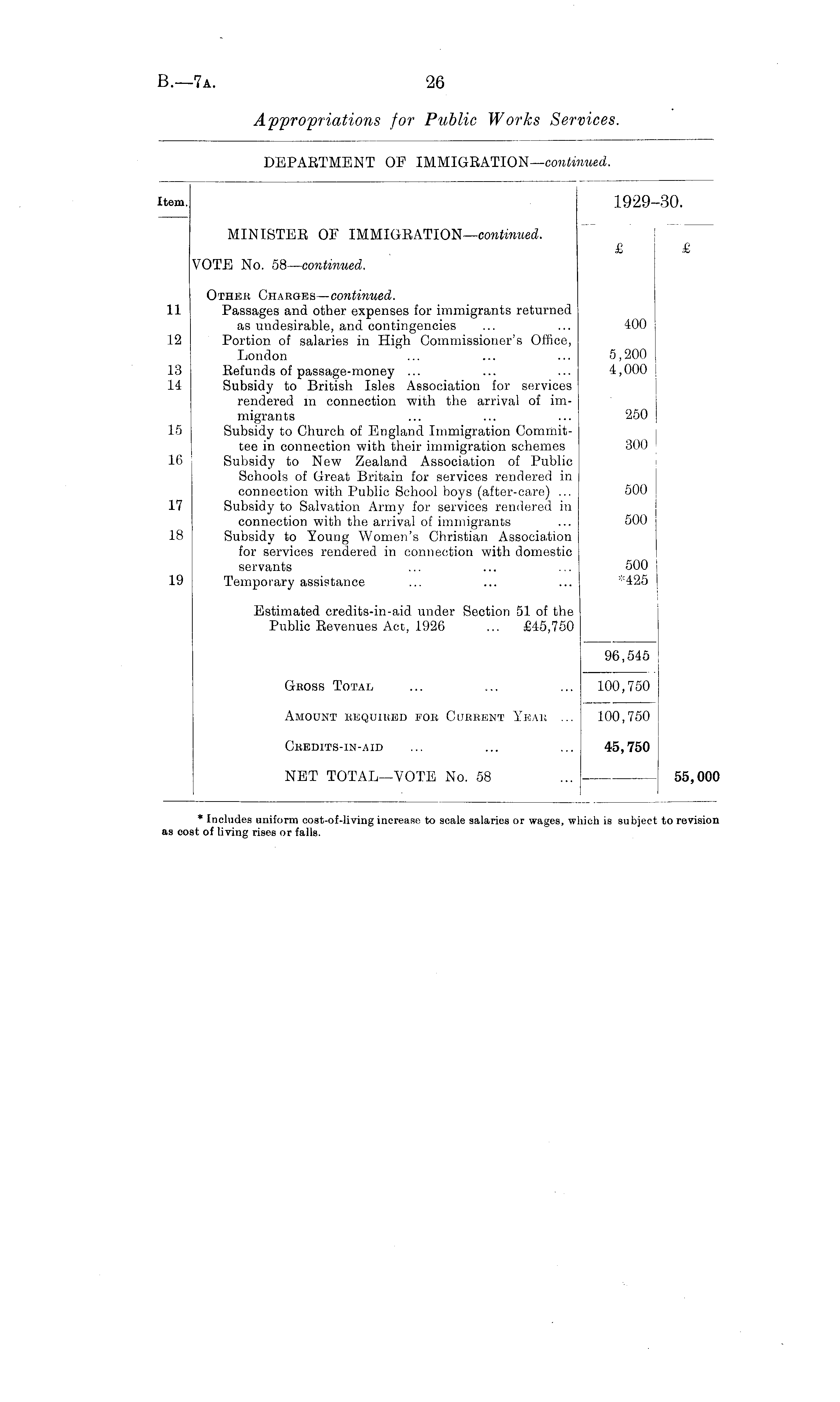 Item. 1929-30. MINISTER OF IMMIGRATION—continued. £ £ VOTE No. 58—continued. Other Chabges—continued. 11 Passages and other expenses for immigrants returned as uudesirable, and contingencies ... ... 400 12 Portion of salaries in High Commissioner's Office, London ... ... ... 5,200 13 Refunds of passage-money ... ... ... 4,000 14 Subsidy to British Isles Association for services rendered m connection with the arrival of immigrants ... ... ... 250 15 Subsidy to Church of England Immigration Committee in connection with their immigration schemes 300 16 Subsidy to New Zealand Association of Public Schools of Great Britain for services rendered in connection with Public School boys (after-care) ... 500 17 Subsidy to Salvation Army for services rendered in connection with the arrival of immigrants ... 500 18 Subsidy to Young Women's Christian Association for services rendered in connection with domestic servants ... ... ... 500 19 Temporary assistance ... ... ... *425 Estimated credits-in-aid under Section 51 of the Public Revenues Act, 1926 ... £45,750 96,545 Gboss Total ... ... ... 100,750 Amount required fob Cubbent Yeab ... 100,750 Credits-in-aid ... ... ... 45,750 NET TOTAL—VOTE No. 58 ... 55,000 * Includes uniform cost-of-living increase to scale salaries or wages, which is subject to revision as cost of living rises or falls.
