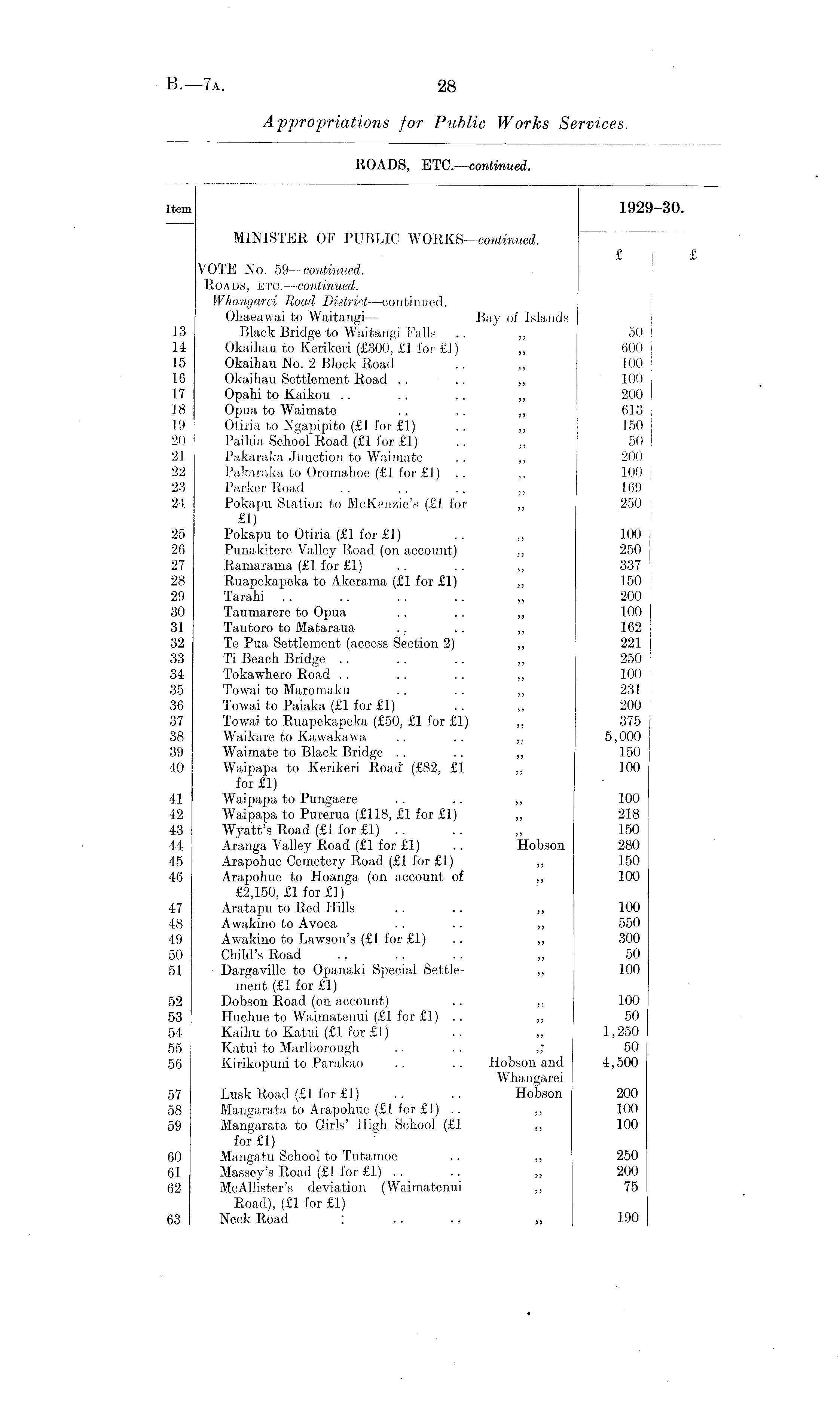 Item 1929-30. MINISTER OF PUBLIC WORKS—continued. £ £ VOTE No. 59—continued. Roads, etc. —continued. Whangarei Road District —continued. Ohaeawai to Waitangi— Bay of Islands 13 Black Bridge to Waitangi Falls .. „ 50 14 Okaihau to Kerikeri (£300, £1 for £1) ,, 600 15 Okaihau No. 2 Block Road .. ,, 100 16 Okaihau Settlement Road . . .. ,, 100 17 Opahi to Kaikou .. .. .. ,, 200 18 Opua to Waimate .. .. ,, 613 19 Otiria to Ngapipito (£1 for £1) .. ,, 150 20 Paihia School Road (£1 for £1) .. ,, 50 21 Pakaraka Junction to Waimate .. ,, 200 22 Pakaraka to Oromahoe (£1 for £1) .. ,, 100 23 Parker Road . . .. .. „ 169 24 Pokapu Station to McKenzie's (£.1 for ,, 250 £1) 25 Pokapu to Otiria (£1 for £1) .. „ 100 26 Punakitere Valley Road (on account) ,, 250 27 Ramarama (£1 for £1) .. .. „ 337 28 Ruapekapeka to Akerama (£1 for £1) ,, 150 29 Tarahi .. .. .. .. „ 200 30 Taumarere to Opua .. .. ,, 100 31 Tautoro to Mataraua .. .. „ 162 32 Te Pua Settlement (access Section 2) ,, 221 33 Ti Beach Bridge .. .. .. ,, 250 34 Tokawhero Road . . .. . . ,, 100 35 Towai to Maromaku . . . . ,, 231 36 Towai to Paiaka (£1 for £1) .. ,, 200 37 Towai to Ruapekapeka (£50, £1 for £1) ,, 375 38 Waikare to Kawakawa .. .. „ 5,000 39 Waimate to Black Bridge .. .. ,, 150 40 Waipapa to Kerikeri Road' (£82, £1 ,, 100 for £1) 41 Waipapa to Pungaere .. .. ,, 100 42 Waipapa to Purerua (£118, £1 for £1) „ 218 43 Wyatt's Road (£1 for £1) .. .. ,, 150 44 Aranga Valley Road (£1 for £1) .. Hobson 280 45 Arapohue Cemetery Road (£1 for £1) ,, 150 46 Arapohue to Hoanga (on account of ,, 100 £2,150, £1 for £1) 47 Aratapu to Red Hills .. .. ,, 100 48 Awakino to Avoca .. .. ,, 550 49 Awakino to Lawson's (£1 for £1) .. ,, 300 50 Child's Road .. .. .. ,, 50 51 Dargaville to Opanaki Special Settle- „ 100 ment (£1 for £1) 52 Dobson Road (on account) .. „ 100 53 Huehue to Waimatenui (£1 for £1) .. ,, 50 54 Kaihu to Katui (£1 for £1) .. ,, 1,250 55 Katui to Marlborough .. .. „• 50 56 Kirikopuni to Parakao .. .. Hobson and 4,500 Whangarei 57 Lusk Road (£1 for £1) .. .. Hobson 200 58 Mangarata to Arapohue (£1 for £1) .. ,, 100 59 Mangarata to Girls' High School (£1 ,, 100 for £1) 60 Mangatu School to Tntamoe .. ,, 250 61 Massey's Road (£1 for £1) .. .. ,, 200 62 McAllister's deviation (Waimatenui „ 75 Road), (£1 for £1) 63 Neck Road : .. .. „ 190