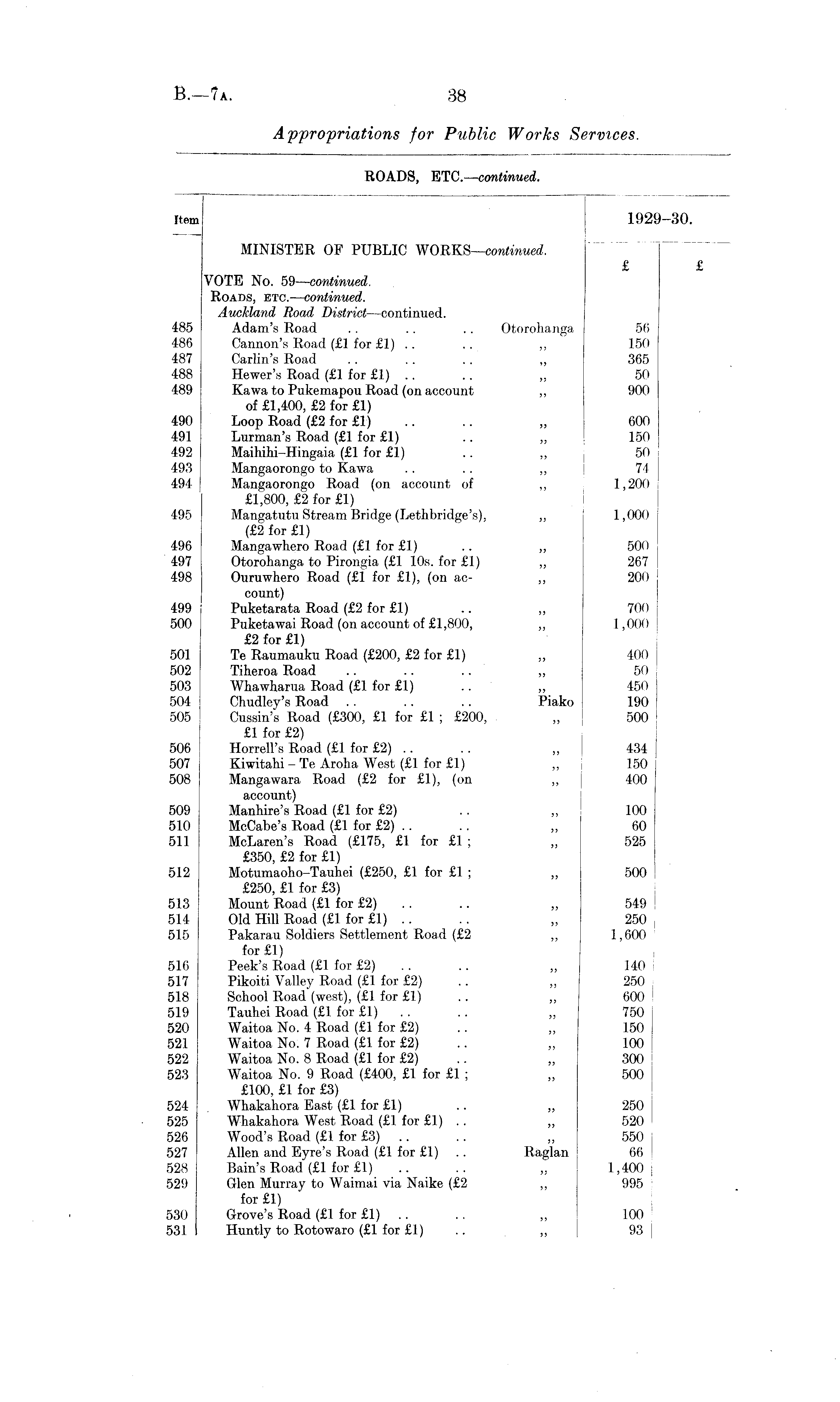 rtem 1929—30. MINISTER OF PUBLIC WORKS —continued. £ £ VOTE No. 59—continued. Roads, etc. —continued. Auckland Road District—continued. 485 Adam's Road .. .. .. Otorohanga 56 486 Cannon's Road (£1 for £1) .. .. „ 150 487 Carlin's Road .. .. . . ,, 365 488 Hewer's Road (£1 for £1) .. .. ,, 50 489 Kawa to Pukemapou Road (on account „ 900 of £1,400, £2 for £1) 490 Loop Road (£2 for £1) .. .. „ 600 491 Lurman's Road (£1 for £1) .. „ 150 492 Maihihi-Hingaia (£1 for £1) .. ,, 50 493 Mangaorongo to Kawa .. .. ,, 74 494 Mangaorongo Road (on account of „ 1,200 £1,800, £2 for £1) 495 Mangatutu Stream Bridge (Lethbridge's), „ 1,000 (£2 for £1) 496 Manga whero Road (£1 for £1) .. ,, 500 497 Otorohanga to Pirongia (£1 10s. for £1) ,, 267 498 Ouruwhero Road (£1 for £1), (on ac- ,, 200 count) 499 Puketarata Road (£2 for £1) .. „ 700 500 Puketawai Road (on account of £1,800, ,, 1,000 £2 for £1) 501 Te Raumauku Road (£200, £2 for £1) „ 400 502 Tiheroa Road .. .. .. ,, 50 503 Whawharua Road (£1 for £1) .. „ 450 504 Chudley's Road . . .. .. Piako 190 505 Cussin's Road (£300, £1 for £1 ; £200, „ 500 £1 for £2) 506 Horrell's Road (£1 for £2) .. .. ,, 434 507 Iviwitahi - Te Aroha West (£1 for £1) ,, 150 508 Mangawara Road (£2 for £1), (on ,, 400 account) 509 Man hire's Road (£1 for £2) . . ,, 100 510 McCabe's Road (£1 for £2) .. .. „ 60 511 McLaren's Road (£175, £1 for £1 ; ,, 525 £350, £2 for £1) 512 Motumaoho-Tauhei (£250, £1 for £1 ; ,, 500 £250, £1 for £3) 513 Mount Road (£1 for £2) .. .. ,, 549 514 Old Hill Road (£1 for £1) .. .. „ 250 515 Pakarau Soldiers Settlement Road (£2 ,, 1,600 for £1) 516 Peek's Road (£1 for £2) .. .. ,, 140 517 Pikoiti Valley Road (£1 for £2) .. ,, 250 i 518 School Road (west), (£1 for £1) .. ,, 600 519 Tauhei Road (£1 for £1) .. .. ,, 750 520 Waitoa No. 4 Road (£1 for £2) .. ,, 150 521 Waitoa No. 7 Road (£1 for £2) .. ,, 100 522 Waitoa No. 8 Road (£1 for £2) .. ,, 300 523 Waitoa No. 9 Road (£400, £1 for £1 ; ,, 500 £100, £1 for £3) 524 Whakahora East (£1 for £1) .. ,, 250 525 Whakahora West Road (£1 for £1) . . ,, 520 526 Wood's Road (£1 for £3) .. .. ,, 550 527 Allen and Eyre's Road (£1 for £1) .. Raglan 66 528 Bain's Road (£1 for £1) .. .. ,, 1,400 529 Glen Murray to Waimai via Naike (£2 ,, 995 for £1) 530 Grove's Road (£1 for £1) .. „ 100 531 Huntly to Rotowaro (£1 for £1) .. ,, 93
