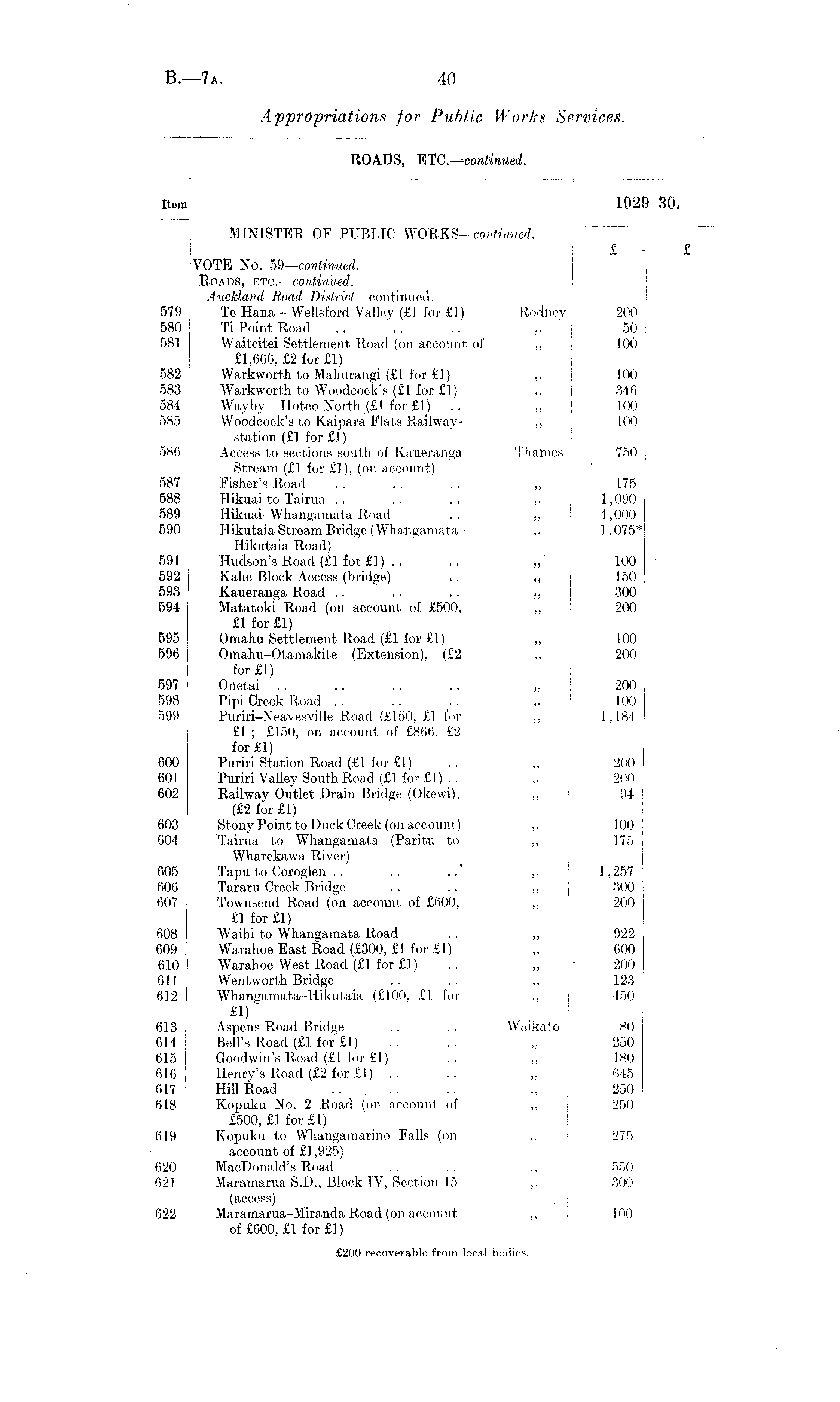 I r~ Item 1929-30. MINISTER OF PUBLIC WORKS— continued. £ £ VOTE No. 59—continued. \ | Roads, etc. —continued. Auckland Road District—continued. 579 Te Hana - Wellsford Valley (£1 for £1) Rodney 200 580 Ti Point Road . . . . . . " 50 581 Waiteitei Settlement Road (on account of ,, 100 £1,666, £2 for £1) 582 Warkworth to Mahurangi (£1 for £1) ,, 100 583 Warkworth to Woodcock's (£1 for £1) „ | 346 584 Way by - Hoteo North (£1 for £1) .. ,, 100 585 Woodcock's to Kaipara Flats Railway- ,, 100 station (£1 for £1) 586 Access to sections south of Kaueranga Thames j 750 j Stream (£1 for £1), (on account) 587 Fisher's Road .. . . . . ,, 175 588 Hikuai to Tairua .. .. .. ,, 1,090 589 Hikuai-Whangamata Road .. „ 4,000 590 Hikutaia Stream Bridge (Whangamata- ,, 1,075* Hikutaia Road) 591 Hudson's Road (£1 for £1) ., .. 100 592 Kahe Block Access (bridge) ., ,, 150 593 Kaueranga Road . . . . . . ,, 300 594 Matatoki Road (on account of £500, ,, 200 £1 for £1) 595 Omahu Settlement Road (£l for £l) ,, 100 596 Omahu-Otamakite (Extension), (£2 ,, 200 for £1) 597 Onetai .. .. .. .. " 20® 598 Pipi Creek Road .. .. .. ,, 100 599 Puriri-Neavesville Road (£150, £1 for ,, 1,184 £1 ; £150, on account of £866, £2 for £1) 600 Puriri Station Road (£1 for £1) .. ,, 200 601 Puriri Valley South Road (£1 for £1) .. ,, 200 602 Railway Outlet Drain Bridge (Okewi), ,, 94 (£2 for £1) 603 Stony Point to Duck Creek (on account) ,, 100 604 'Tairua to Whangamata (Paritu to ,, 175 i Wharekawa River) 605 Tapu to Coroglen .. .. .. ,, 1,257 606 Tararu Creek Bridge .. .. ,, 300 607 Townsend Road (on account of £600, ,, 200 £1 for £1) 608 Waihi to Whangamata Road . . ,, 922 609 Warahoe East Road (£300, £1 for £1) ,, 600 610 Warahoe West Road (£1 for £1) .. ,, 200 611 Wentworth Bridge .. . . „ 123 612 Whangamata-Hikutaia (£100, £1 for „ 450 £1) 613 Aspens Road Bridge .. .. Waikato 80 614 Bell's Road (£1 for £1) .. .. ,, 250 615 Goodwin's Road (£1 for £1) .. ,, 180 616 Henry's Road (£2 for £1) .. .. ,, 645 617 Hill Road ..... .. ,, 250 618 Kopuku No. 2 Road (on account of ,, 250 £500, £1 for £1) 619 Kopuku to Whangamarino Falls (on ,, 275 account of £1,925) 620 MacDonald's Road . . . . ,, 550 621 Maramarua S.D., Block IV, Section 15 .,, 300 (access) 622 Maramarua-Miranda Road (on account ,, 100 of £600, £1 for £1) £200 recoverable from local bodies.