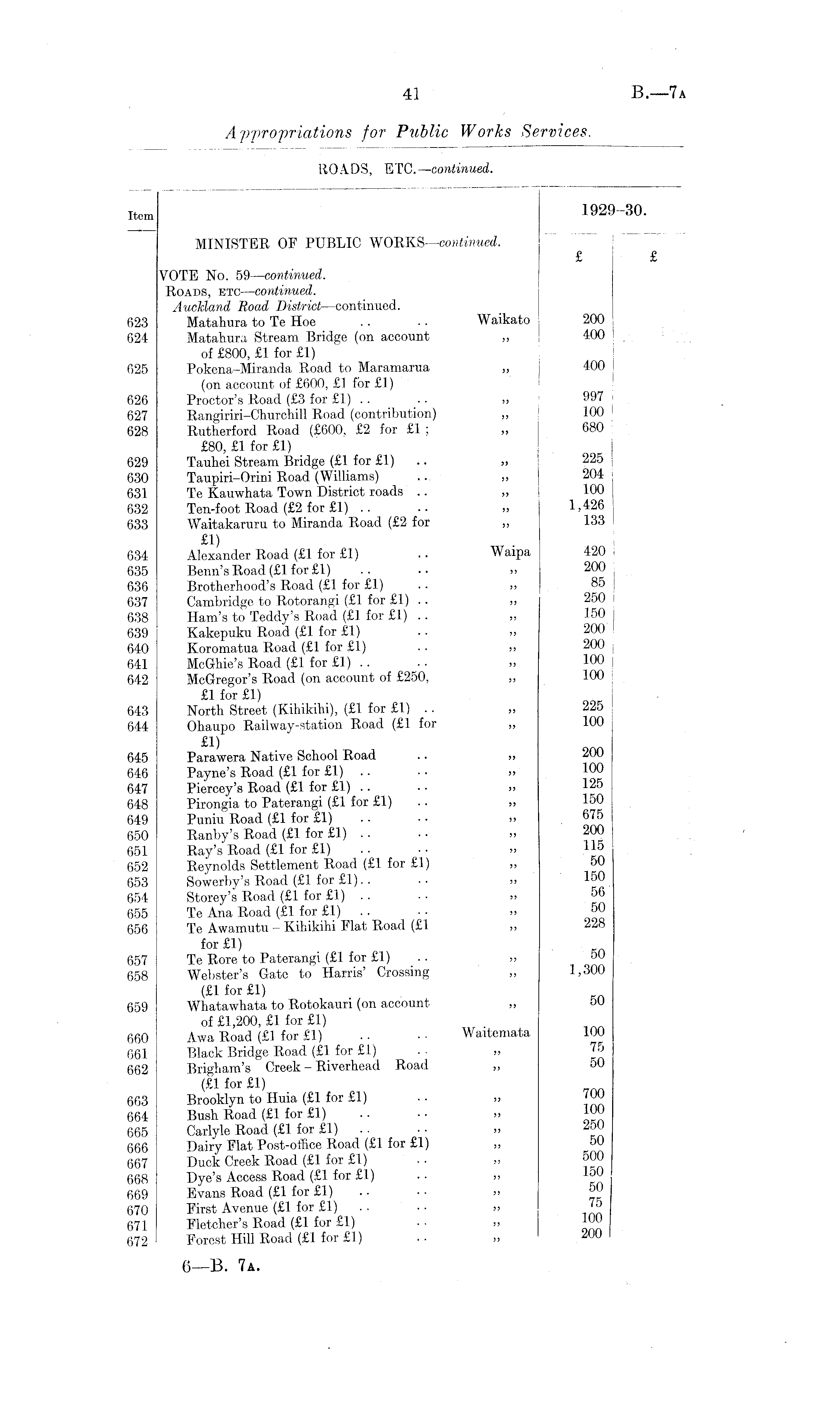 Item 1929-30. MINISTER OF PUBLIC WORKS—continued. £ £ VOTE No. 59—continued. Roads, etc —continued. Auckland Road District —continued. 623 Matahnra to Te Hoe .. . . Waikato 200 624 Matahura Stream Bridge (on account „ : 400 ! of £800, £1 for £1) 625 Pokena-Miranda Road to Maramarua „ J 400 J (on account of £600, £1 for £1) 626 Proctor's Road (£3 for £1) . . .. » 997 627 Rangiriri-Churchill Road (contribution) „ 100 628 Rutherford Road (£600, £2 for £1 ; „ 680 £80, £lfor£l) | 629 Tauliei Stream Bridge (£1 for £1) „ 225 630 Taupiri-Orini Road (Williams) .. "I 631 Te Kauwhata Town District roads .. „ I 100 632 Ten-foot Road (£2 for £1) .. .. >> 1,426 633 Waitakaruru to Miranda Road (£2 for „ 133 £1) 634 Alexander Road (£1 for £1) .. Waipa 420 635 Benn's Road (£1 for £1) .. •• >> 200 636 Brotherhood's Road (£1 for £1) .. » 85 637 Cambridge to Rotorangi (£1 for £1) .. „ 250 638 Ham's to Teddy's Road (£1 for £1) .. „ 150 | 639 Kakepuku Road (£1 for £1) .. ,> 200 640 Koromatua Road (£1 for £1) .. „ 200 j 641 McGhie's Road (£1 for £1) .. . ■ „ 100 642 McGregor's Road (on account of £250, „ 100 £1 for £1) 643 North Street (Kihikihi), (£1 for £1) .. „ 225 644 Ohaupo Railway-station Road (£1 for ,, 100 £1) 645 Parawera Native School Road . • >> 646 Payne's Road (£1 for £1) .. • • >> 100 647 Piercey's Road (£1 for £1) .. . • » 125 648 Pirongia to Paterangi (£1 for £1) .. „ 150 649 Puniu Road (£1 for £1) .. • • » 675 650 Ranby's Road (£1 for £1) . . • • ,, 200 651 Ray's Road (£1 for £1) . • ■ • >> 115 652 Reynolds Settlement Road (£1 for £1) ,, 50 653 Sowerby's Road (£1 for £1).. • • >> 150 654 Storey's Road (£1 for £1) .. • • >> 56 655 Te Ana Road (£1 for £1) .. • • »> 50 656 Te Awamutu - Kihikihi Flat Road (£1 ,, 228 for £1) 657 Te Rore to Paterangi (£1 for £1) „ 0U 658 Webster's Gate to Harris' Crossing „ 1,300 (£1 for £1) 659 Whatawhata to Rotokauri (on account „ DU of £1,200, £1 for £1) 660 Awa Road (£1 for £1) . . Waitemata 100 661 Black Bridge Road (£1 for £1) . . „ 662 Brigham's Creek - Riverhead Road „ 50 ( £1 for £1) 663 Brooklyn to Huia (£1 for £1) • • „ JO J 664 Bush Road (£1 for £1) .. • • » 100 665 Carlyle Road (£1 for £1) . ■ „ 250 666 Dairy Flat Post-office Road (£1 for £1) „ 50 667 Duck Creek Road (£1 for £1) . • „ 500 668 Dye's Access Road (£1 for £1) . • „ 1^0 669 Evans Road (£1 for £1) .. •• >> 5_ 670 First Avenue (£1 for £1) .. „ 671 Fletcher's Road (£1 for £1) . ■ ,, 10( 672 Forest Hill Road (£1 for £1) . • .. 6—B. 7a.