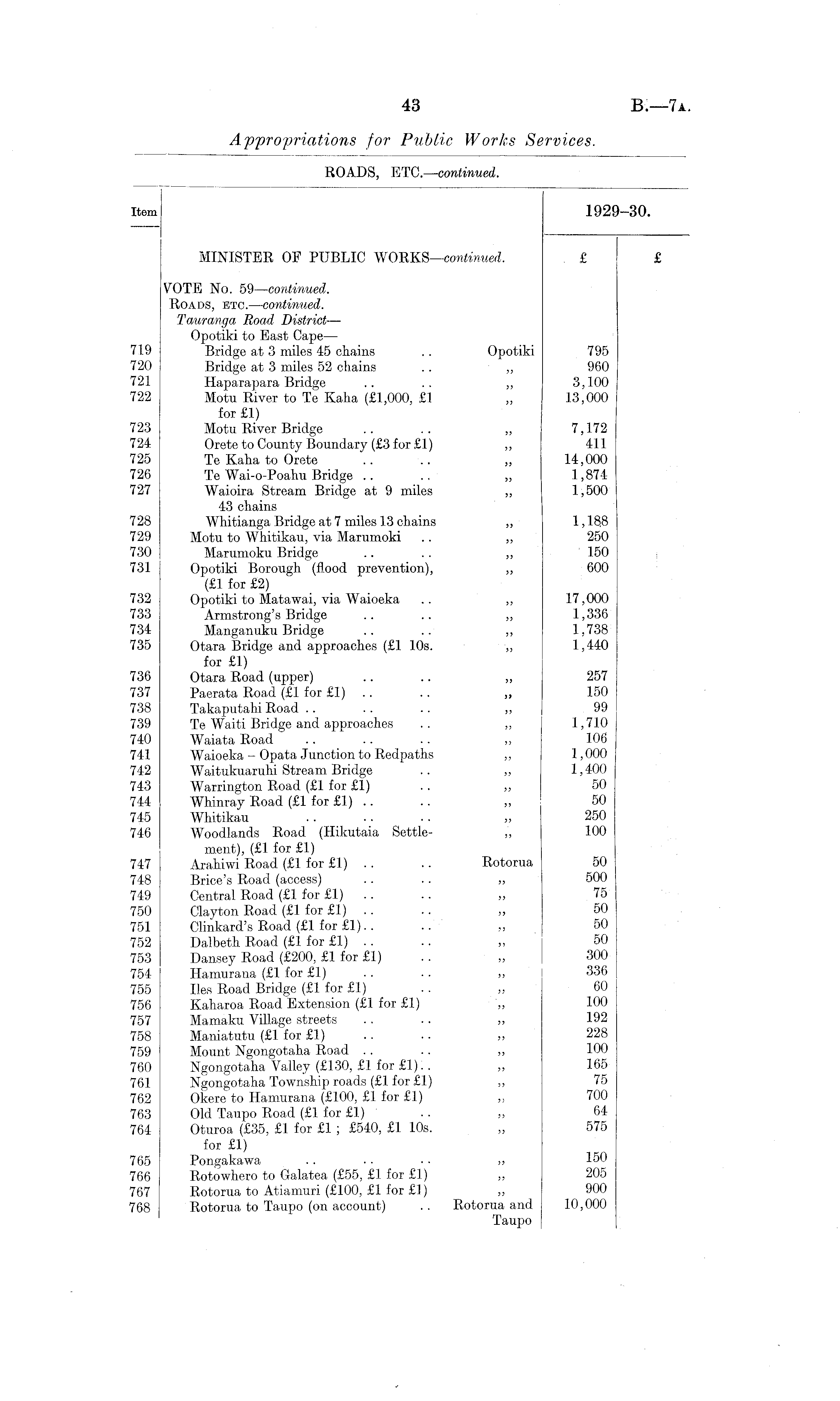 Item 1929—30. MINISTER OF PUBLIC WORKS —continued. £ £ VOTE No. 59—continued. Roads, etc. —continued. Tauranga Road District— Opotiki to Bast Cape — 719 Bridge at 3 miles 45 chains .. Opotiki 795 720 Bridge at 3 miles 52 chains .. ,, 960 721 Haparapara Bridge .. .. „ 3,100 722 Motu River to Te Kaha (£1,000, £1 „ 13,000 for £1) 723 Motu River Bridge .. .. „ 7,172 724 Orete to County Boundary (£3 for £1) ,, 411 725 Te Kaha to Orete .. .. ,, 14,000 726 Te Wai-o-Poahu Bridge .. .. „ 1,874 727 Waioira Stream Bridge at 9 miles ,, 1,500 43 chains 728 Whitianga Bridge at 7 miles 13 chains ,, 1,18.8 729 Motu to Whitikau, via Marumoki .. ,, 250 730 Marumoku Bridge .. . . ,, 150 731 Opotiki Borough (flood prevention), ,, 600 (£1 for £2) 732 Opotiki to Matawai, via Waioeka .. ,, 17,000 733 Armstrong's Bridge .. .. ,, 1,336 734 Manganuku Bridge .. .. „ 1,738 735 Otara Bridge and approaches (£1 10s. ,, 1,440 for £1) 736 Otara Road (upper) .. .. ,, 257 737 Paerata Road (£1 for £1) .. . . „ 150 738 Takaputahi Road .. .. .. ,, 99 739 Te Waiti Bridge and approaches .. ,, 1,710 740 Waiata Road .. .. .. ,, 106 741 Waioeka - Opata Junction to Redpaths ,, 1,000 742 Waitukuaruhi Stream Bridge .. ,, 1,400 743 Warrington Road (£1 for £1) . . ,, 50 744 Whinray Road (£1 for £1) .. .. „ 50 745 Whitikau . . .. . . „ 250 746 Woodlands Road (Hikutaia Settle- „ 100 ment), (£1 for £1) 747 Arahiwi Road (£1 for £1) . . .. Rotorua 50 748 Brice's Road (access) .. .. „ 500 749 Central Road (£1 for £1) .. .. ,, 75 750 Clayton Road (£1 for £1) .. .. ,, 50 751 Clinkard's Road (£1 for £1).. .. ,, 50 752 Dalbeth Road (£1 for £1) .. .. ,, 50 753 Dansey Road (£200, £1 for £1) . . ,, 300 754 Hamurana (£1 for £1) . . . . ,, 336 755 lies Road Bridge (£1 for £1) . . ,, 60 756 Kaharoa Road Extension (£1 for £1) „ 100 757 Mamaku Village streets .. .. „ 192 758 Maniatutu (£1 for £1) .. .. ,, 228 759 Mount Ngongotaha Road . . .. ,, 100 760 Ngongotaha Valley (£130, £1 for £1).. ,, 165 761 Ngongotaha Township roads (£1 for £1) „ 75 762 Okere to Hamurana (£100, £1 for £1) „ 700 763 Old Taupo Road (£1 for £1) . . ,, 64 764 Oturoa (£35, £1 for £1 ; £540, £1 10s. ,, 575 for £1) 765 Pongakawa . . . • • • ,, 150 766 Rotowhero to Galatea (£55, £1 for £1) „ 205 767 Rotorua to Atiamuri (£100, £1 for £]) „ 900 768 Rotorua to Taupo (on account) . . Rotorua and 10,000 Taupo