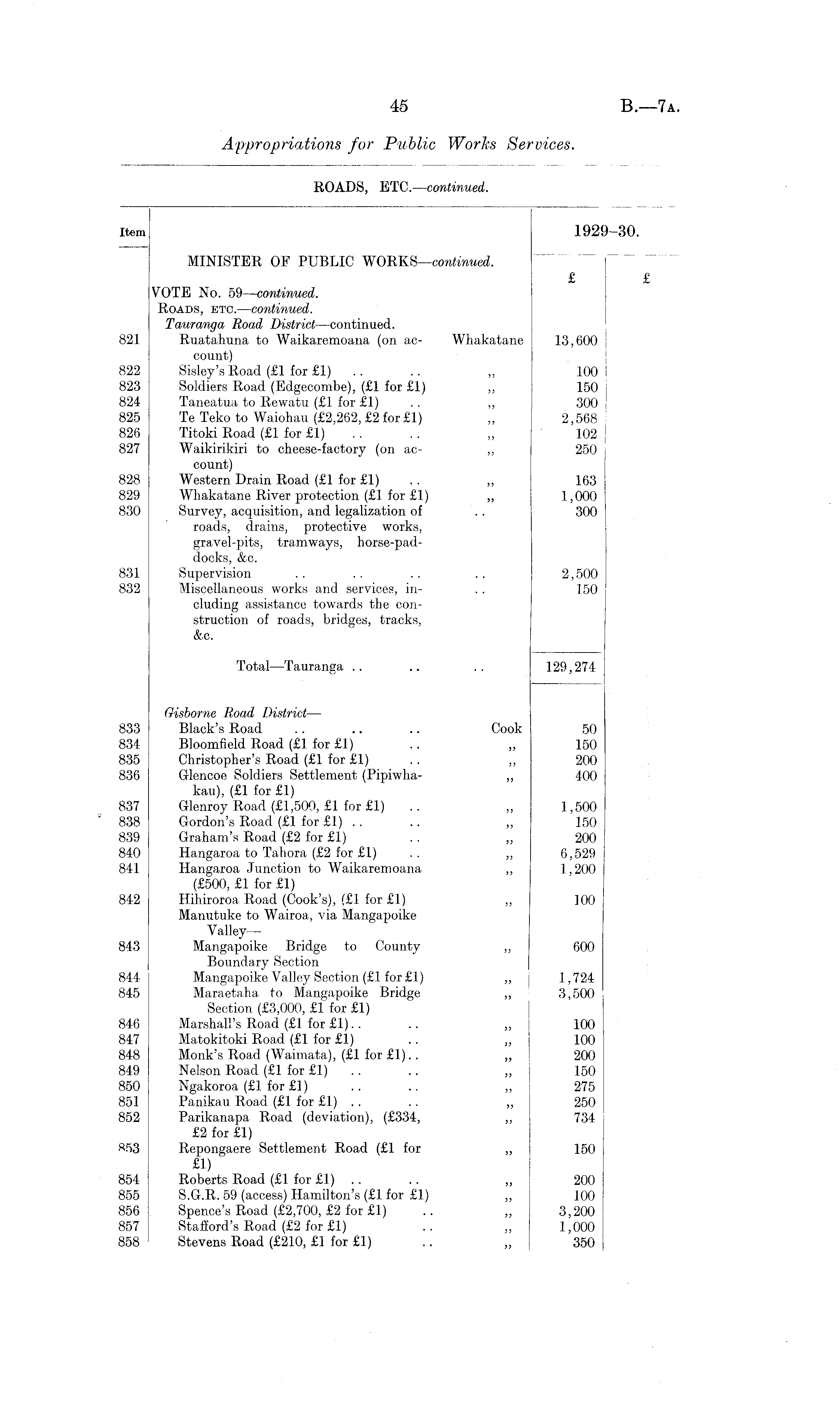 Item 1929—30. MINISTER OF PUBLIC WORKS —continued. £ £ VOTE No. 59—continued. Roads, etc. —continued. Tauranga Road District —continued. 821 Ruatahuna to Waikaremoana (on ac- Whakatane 13,600 count) 822 Sisley's Road (£1 for £1) . . .. ,, 100 823 Soldiers Road (Edgecombe), (£1 for £1) ,, 150 824 Taneatua to Rewatu (£1 for £1) .. ,, 300 825 Te Teko to Waiohau (£2,262, £2 for £1) ,, 2,568 826 Titoki Road (£1 for £1) . . . . ,, 102 827 Waikirikiri to cheese-factory (on ac- ,, 250 count) 828 Western Drain Road (£1 for £1) . . ,, 163 829 Whakatane River protection (£1 for £1) ,, 1,000 830 Survey, acquisition, and legalization of . . 300 roads, drains, protective works, gravel-pits, tramways, horse-pad-docks, &c. 831 Supervision . . . . . . . . 2,500 832 Miscellaneous works and services, in- . . 150 eluding assistance towards the construction of roads, bridges, tracks, &c. Total—Tauranga .. .. .. 129,274 Gisborne Road District — 833 Black's Road .. .. .. Cook 50 834 Bloomfield Road (£1 for £1) .. ,, 150 835 Christopher's Road (£1 for £1) .. ,, 200 836 Glencoe Soldiers Settlement (Pipiwlia- „ 400 kau), (£1 for £1) 837 Glenroy Road (£1,500, £1 for £1) .. ,, 1,500 838 Gordon's Road (£1 for £1) .. .. „ 150 839 Graham's Road (£2 for £1) .. ,, 200 840 Hangaroa to Tahora (£2 for £1) .. ,, 6,529 841 Hangaroa Junction to Waikaremoana „ 1,200 (£500, £1 for £1) 842 Hihiroroa Road (Cook's), (£1 for £1) „ ]00 Manutuke to Wairoa, via Mangapoike Valley— 843 Mangapoike Bridge to County ,, 600 Boundary Section 844 Mangapoike Valley Section (£1 for £1) ,, 1,724 845 Maraetaha to Mangapoike Bridge „ 3,500 Section (£3,000, £1 for £1) 846 Marshall's Road (£1 for £1). . .. ,, 100 847 Matokitoki Road (£1 for £1) .. ,, 100 848 Monk's Road (Waimata), (£1 for £1).. „ 200 849 Nelson Road (£1 for £1) . . .. ,, 150 850 Ngakoroa (£1 for £1) .. .. ,, 275 851 Panikau Road (£1 for £1) . . .. „ 250 852 Parikanapa Road (deviation), (£334, ,, 734 £2 for £1) 853 Repongaere Settlement Road (£1 for ,, 150 £1) 854 Roberts Road (£1 for £1) .. „ 200 855 S.G.R. 59 (access) Hamilton's (£1 for £1) ,, 100 856 Spence's Road (£2,700, £2 for £1) .. ,, 3,200 857 Stafford's Road (£2 for £1) .. „ 1,000 858 Stevens Road (£210, £1 for £1) .. ,, 350