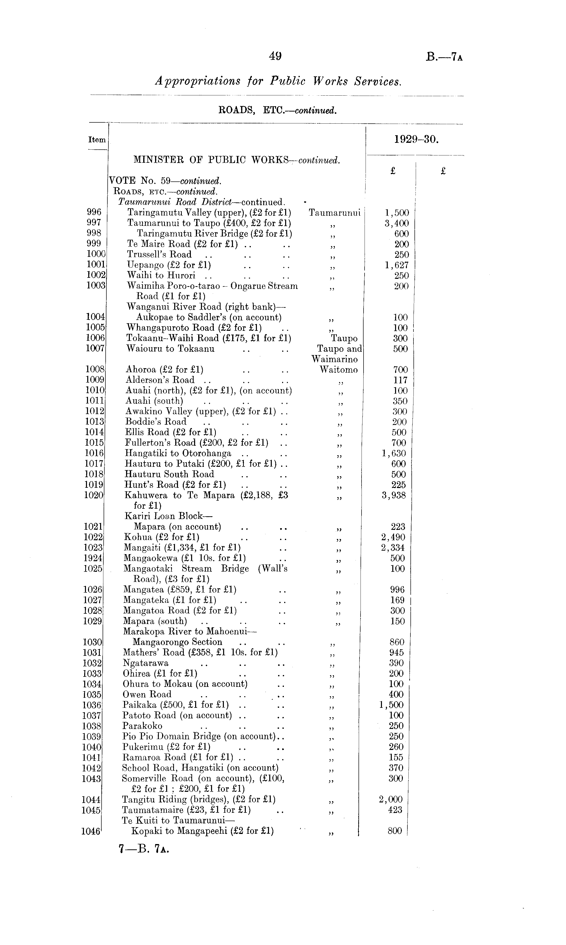 Item 1929—30. MINISTER OP PUBLIC WORKS—continued. £ £ VOTE No. 59 —continued. Roads, etc. —continued. Taumarunui Road District —continued. - | 996 Taringamutu Valley (upper), (£2 for £1) Taumarunui 1,500 997 Taumarunui to Taupo (£400, £2 for £1) ,, 3,400 998 Taringamutu River Bridge (£2 for £1) ,, 600 999 Te Maire Road (£2 for £1) .. .. ,, 200 1000 Trussell's Road .. .. .. ,, 250 1001 Uepango (£2 for £1) .. .. ,, 1,627 1002 Waihi to Hurori .. .. .. „ 250 1003 Waimiha Poro-o-tarao - Ongarue Stream ,, 200 Road (£1 for £1) Wanganui River Road (right bank) — 1004 Aukopae to Saddler's (on account) ,, 100 1005 Whangapuroto Road (£2 for £1) .. „ 100 1006 Tokaanu-Waihi Road (£175, £1 for £1) Taupo 300 1007 Waiouru to Tokaanu .. .. Taupo and 500 Waimarino 1008 Ahoroa (£2 for £1) .. .. Waitomo 700 1009 Alderson's Road .. .. .. ,, 117 1010 Auahi (north), (£2 for £1), (on account) ,, 100 1011 Auahi (south) .. .. .. „ 350 1012 Awakino Valley (upper), (£2 for £1) .. ,, 300 1013 Boddie's Road .. .. .. ,, 200 1014 Ellis Road (£2 for £1) .. .. ,, 500 1015 Fullerton's Road (£200, £2 for £1) .. ,, 700 1016 Hangatiki to Otorohanga .. .. ,, 1,630 1017 Hauturu to Putaki (£200, £1 for £1) .. ,, 600 1018 Hauturu South Road .. .. ,, 500 1019 Hunt's Road (£2 for £1) .. .. ,, 225 1020 Kahuwera to Te Mapara (£2,188, £3 „ 3,938 for £1) Kariri Loan Block — 1021 Mapara (on account) .. .. „ 223 1022 Kohua (£2 for £1) .. .. „ 2,490 1023 Mangaiti (£1,334, £1 for £1) .. „ 2,334 1924 Mangaokewa (£1 10s. for £1) .. „ 500 1025 Mangaotaki Stream Bridge (Wall's ,, 100 Road), (£3 for £1) 1026 Mangatea (£859, £1 for £1) .. „ 996 1027 Mangateka (£1 for £1) .. .. ,, 169 | 1028 Mangatoa Road (£2 for £1) .. ,, 300 1029 Mapara (south) .. .. .. ,, 150 Marakopa River to Mahoenui — 1030 Mangaorongo Section .. .. ,, 860 1031 Mathers' Road (£358, £1 10s. for £1) ,, 945 1032 Ngatarawa .. .. .. ,, 390 1033 Ohirea (£1 for £1) .. .. ,, 200 1034 Ohura to Mokau (on account) .. ,, 100 1035 Owen Road .. .. .. ,, 400 1036 Paikaka (£500, £1 for £1) .. .. ,, 1,500 1037 Patoto Road (on account) .. .. ,, 100 1038 Parakoko .. .. .. ,, 250 1039 Pio Pio Domain Bridge (on account).. ,, 250 1040 Pukerimu (£2 for £1) .. .. ,, 260 1041 Ramaroa Road (£1 for £1) .. .. ,, 155 1042 School Road, Hangatiki (on account) ,, 370 1043 Somerville Road (on account), (£100, ,, 300 £2 for £1 : £200, £1 for £1) 1044 Tangitu Riding (bridges), (£2 for £1) ,, 2,000 1045 Taumatamaire (£23, £1 for £1) .. ,, 423 Te Kuiti to Taumarunui— 1046 Kopaki to Mangapeehi (£2 for £1) ,, 800 7—B. 7a.