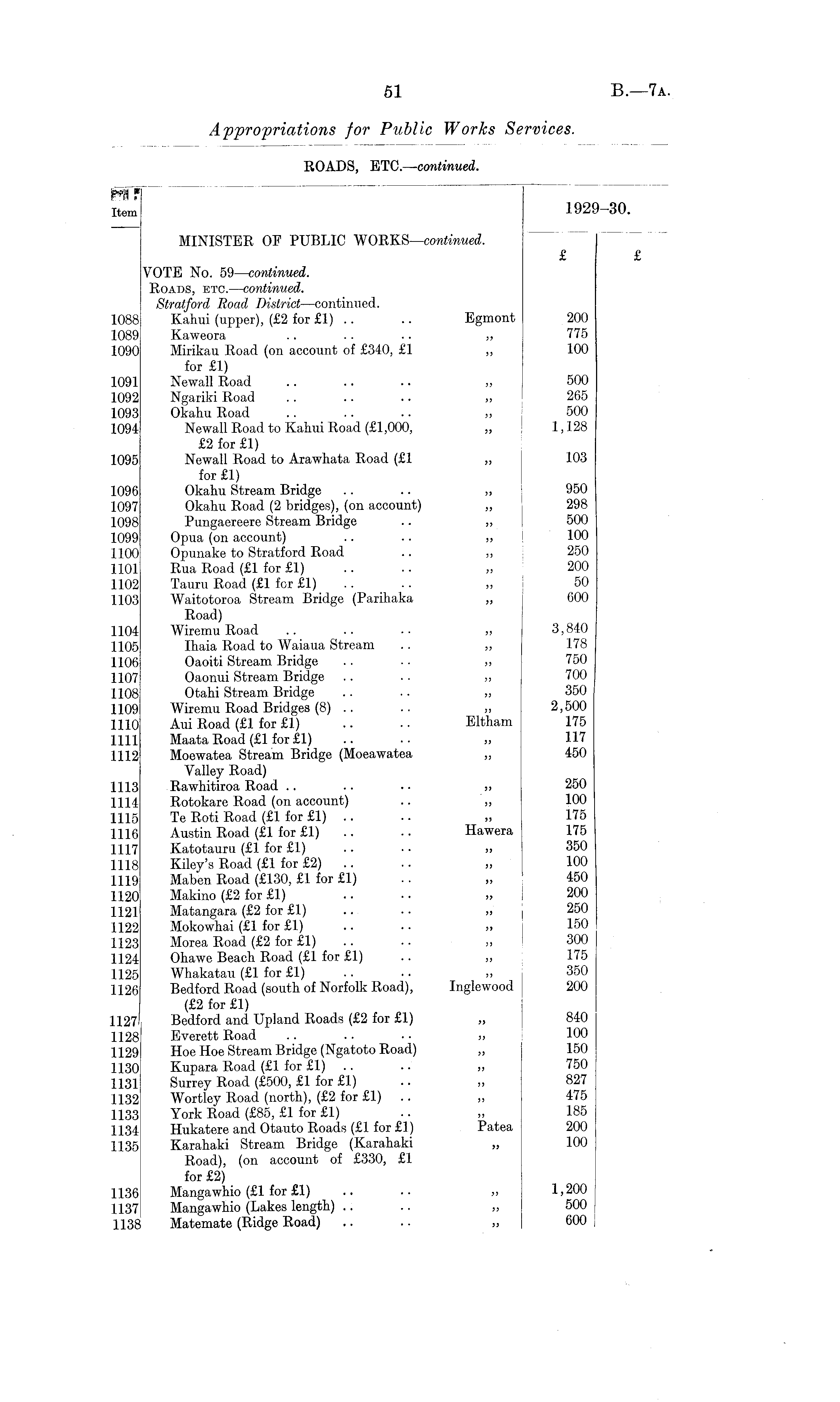NTF Item 1929-30. MINISTER OF PUBLIC WORKS —continued. £ £ VOTE No. 59 —continued. Roads, etc. —continued. Stratford Road District —continued. 1088 Kahui (upper), (£2 for £1) .. .. Egmont 200 1089 Kaweora .. .. .. „ 775 1090 Mirikau Road (on account of £340, £1 „ 100 for £1) 1091 Newall Road .. .. .. „ 500 1092 Ngariki Road .. .. .. ,, 265 1093 Okahu Road .. .. .. 500 1094 Newall Road to Kahui Road (£1,000, „ 1,128 £2 for £1) 1095 Newall Road to Arawhata Road (£1 „ 103 for £1) 1096 Okahu Stream Bridge .. .. ,, 950 1097 Okahu Road (2 bridges), (on account) „ 298 1098 Pungaereere Stream Bridge .. ,, 500 1099 Opua (on account) .. .. „ 100 1100 Opunake to Stratford Road .. „ 250 1101 Rua Road (£1 for £1) .. .. ,, 200 1102 Tauru Road (£1 for £1) .. .. „ 50 1103 Waitotoroa Stream Bridge (Parihaka „ 600 Road) 1104 Wiremu Road .. .. •• „ 3,840 1105 Ihaia Road to Waiaua Stream .. „ 178 1106 Oaoiti Stream Bridge .. ■ • „ 750 1107 Oaonui Stream Bridge .. . . ,, 700 1108 Otahi Stream Bridge .. .. ,, 350 1109 Wiremu Road Bridges (8) .. .. „ 2,500 1110 Aui Road (£1 for £1) .. .. Eltham 175 1111 Maata Road (£1 for £1) .. ,, 117 1112 Moewatea Stream Bridge (Moeawatea „ 450 Valley Road) 1113 Rawhitiroa Road .. .. . • ,, 250 1114 Rotokare Road (on account) .. ,, 100 1115 Te Roti Road (£1 for £1) .. .. „ 175 1116 Austin Road (£1 for £1) .. .. Hawera 175 1117 Katotauru (£1 for £1) .. ■ • „ 350 1118 Kiley's Road (£1 for £2) .. .. ,, 100 1119 Maben Road (£130, £1 for £1) .. „ 450 1120 Makino (£2 for £1) .. • • >, 200 1121 Matangara (£2 for £1) .. „ 250 1122 Mokowhai (£1 for £1) .. .. >, 150 1123 Morea Road (£2 for £1) .. • ■ >, 300 1124 Ohawe Beach Road (£1 for £1) .. „ 175 1125 Whakatau (£1 for £1) .. .. „ 350 1126 Bedford Road (south of Norfolk Road), Ingle wood 200 (£2 for £1) 1127 Bedford and Upland Roads (£2 for £1) „ 840 1128 Everett Road .. .. • • >, 100 1129 Hoe Hoe Stream Bridge (Ngatoto Road) „ 150 1130 Kupara Road (£1 for £1) .. .. „ 750 1131 Surrey Road (£500, £1 for £1) .. „ 827 1132 Wortley Road (north), (£2 for £1) .. „ 475 1133 York Road (£85, £1 for £1) .. „ 185 1134 Hukatere and Otauto Roads (£1 for £1) Patea 200 1135 Karahaki Stream Bridge (Karahaki „ 100 Road), (on account of £330, £1 for £2) 1136 Mangawhio (£1 for £1) .. .. „ 1,200 1137 Manga whio (Lakes length) .. .. „ 500 1138 Matemate (Ridge Road) .. .. „ 600