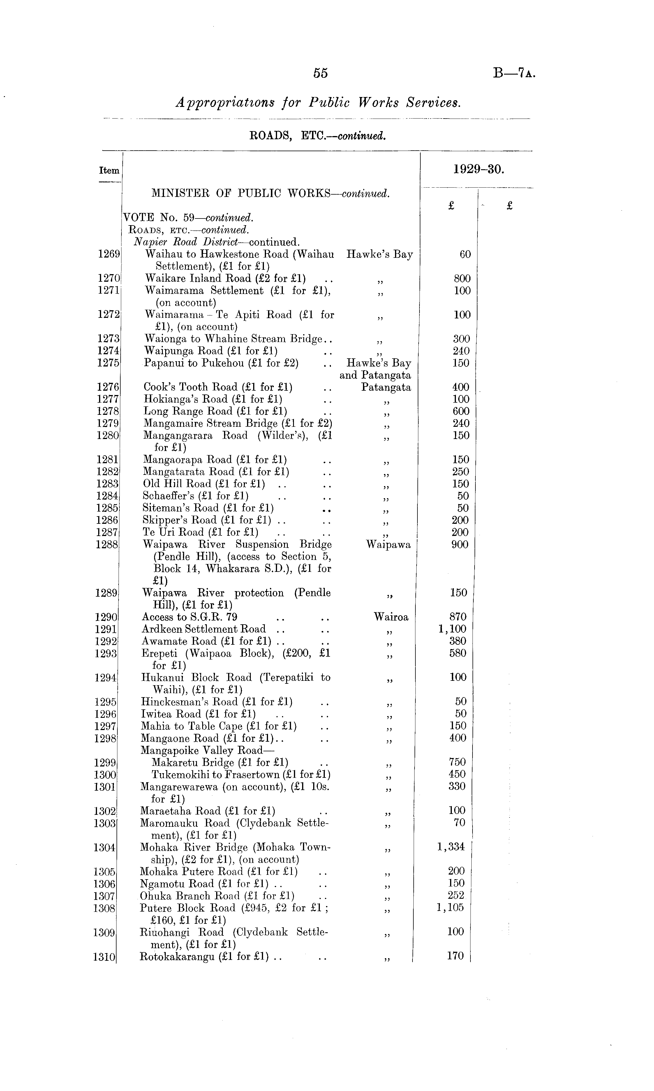 Item 1929—30. MINISTER OP PUBLIC WORKS—continued. £ £ VOTE No. 59 —continued. Roads, etc. —continued. Napier Road District —continued. 1269 Waihau to Hawkestone Road (Waihau Hawke's Bay 60 Settlement), (£1 for £1) 1270 Waikare Inland Road (£2 for £1) .. ,, 800 1271 Waimarama Settlement (£1 for £1), ,, 100 (on account) 1272 Waimarama - Te Apiti Road (£1 for ,, 100 £1), (on account) 1273 Waionga to Whahine Stream Bridge.. „ 300 1274 Waipunga Road (£1 for £1) .. ,, 240 1275 Papanui to Pukehou (£1 for £2) .. Hawke's Bay 150 and Patangata 1276 Cook's Tooth Road (£1 for £1) .. Patangata 400 1277 Hokianga's Road (£1 for £1) .. ,, 100 1278 Long Range Road (£1 for £1) .. „ 600 1279 Mangamaire Stream Bridge (£1 for £2) ,, 240 1280 Mangangarara Road (Wilder's), (£1 ,, 150 for £1) 1281 Mangaorapa Road (£1 for £1) .. ,, 150 1282 Mangatarata Road (£1 for £1) .. „ 250 1283 Old Hill Road (£1 for £1) .. .. „ 150 1284 Schaeffer's (£1 for £1) . . .. „ 50 1285 Siteman's Road (£1 for £1) .. ,, 50 1286 Skipper's Road (£1 for £1) .. .. ,, 200 1287 Te Uri Road (£1 for £1) .. .. „ 200 1288 Waipawa River Suspension Bridge Waipawa 900 (Pendle Hill), (access to Section 5, Block 14, Whakarara S.D.), (£1 for £1 > 1289 Waipawa River protection (Pendle ,, 150 Hill), (£1 for £1) 1290 Access to S.G-.R. 79 .. .. Wairoa 870 1291 Ardkeen Settlement Road .. .. „ 1,100 1292 Awamate Road (£1 for £1) .. .. ,, 380 1293 Erepeti (Waipaoa Block), (£200, £1 ,, 580 for £1) 1294 Hukanui Block Road (Terepatiki to „ 100 Waihi), (£1 for £1) 1295 Hinckesman's Road (£1 for £1) .. ,, 50 1296 Iwitea Road (£1 for £1) . . .. ,, 50 1297 Mahia to Table Cape (£1 for £1) .. „ 150 1298 Mangaone Road (£1 for £1).. .. „ 400 Mangapoike Valley Road— 1299 Makaretu Bridge (£1 for £1) .. ,, 750 1300 Tukemokihi to Frasertown (£1 for £1) „ 450 1301 Mangarewarewa (on account), (£1 10s. ,, 330 for £1) 1302 Maraetaha Road (£1 for £1) .. ,, 100 1303 Maromauku Road (Clydebank Settle- „ 70 ment), (£1 for £1) 1304 Mohaka River Bridge (Mohaka Town- „ 1,334 ship), (£2 for £1), (on account) 1305 Mohaka Putere Road (£1 for £1) .. ,, 200 1306 Ngamotu Road (£1 for £1) .. .. „ 150 1307 Ohuka Branch Road (£1 for £1) .. ,, 252 1308 Putere Block Road (£945, £2 for £1 ; „ 1,105 £160, £1 for £1) 1309 Riuohangi Road (Clydebank Settle- „ 100 ment), (£1 for £1) 1310 Rotokakarangu (£1 for £1) .. .. „ 170