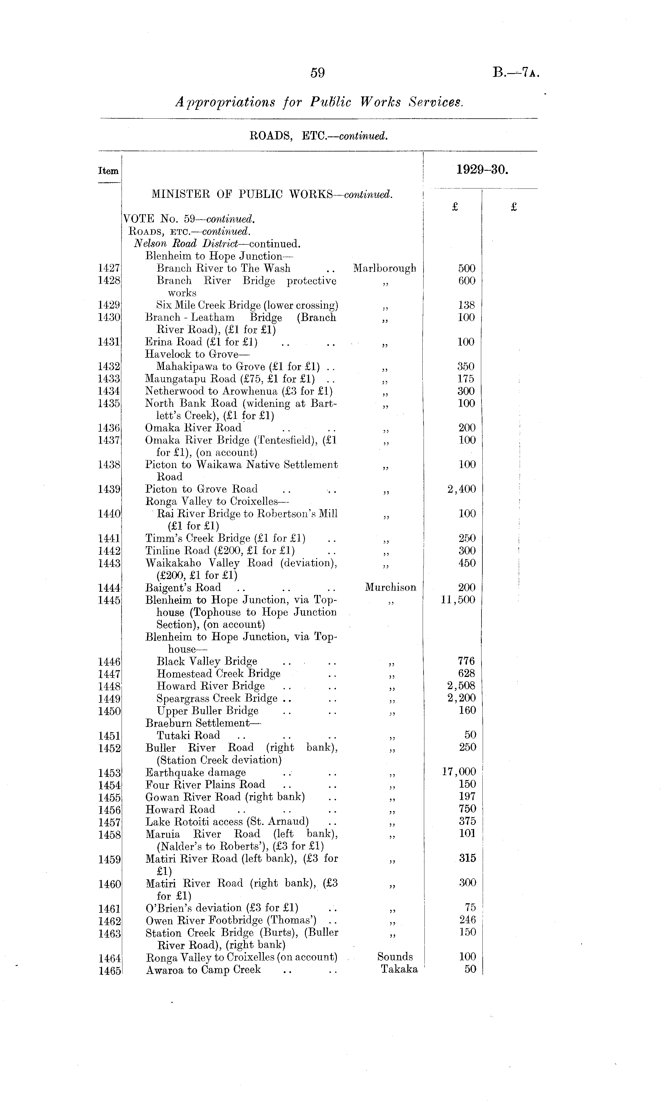i Item 1929—30. MINISTER OF PUBLIC WORKS—continued. £ £ VOTE No. 59 —continued. Roads, etc. —continued. Nelson Road District —continued. Blenheim to Hope Junction — 1427 Branch River to The Wash .. Marlborough 500 1428 Branch River Bridge protective ,, 600 works 1429 Six Mile Creek Bridge (lower crossing) ,, 138 1430 Branch - Leatham Bridge (Branch ,, 100 River Road), (£1 for £1) 1431 Erina Road (£1 for £1) .. .. „ 100 Havelock to Grove — 1432 Mahakipawa to Grove (£1 for £1) .. ,, 350 1433 Maungatapu Road (£75, £1 for £1) .. ,, 175 1434 Netherwood to Arowlienua (£3 for £1) ,, 300 1435 North Bank Road (widening at Bart- ,, 100 lett's Creek), (£1 for £]) 1436 Omaka River Road .. .. ,, 200 1437 Omaka River Bridge (Tentesfield), (£1 ,, 100 for £1), (on account) 1438 Picton to Waikawa Native Settlement ,, 100 Road 1439 Picton to Grove Road .. -.. ,, 2,400 Ronga Yalley to Croixelles— : 1440 Rai River Bridge to Robertson's Mill ,, 100 (£1 for £1) 1441 Timm's Creek Bridge (£1 for £1) .. „ 250 1442 Tinline Road (£200, £1 for £1) .. ,, 300 1443 Waikakaho Valley Road (deviation), ,, 450 (£200, £1 for £1) 1444 Baigent's Road .. .. .. Murchison 200 1445 Blenheim to Hope Junction, via Top- ,, 11,500 house (Tophouse to Hope Junction Section), (on account) Blenheim to Hope Junction, via Tophouse — 1446 Black Valley Bridge .. .. ,, 776 1447 Homestead Creek Bridge .. ,, 628 1448 Howard River Bridge .. .. ,, 2,508 1449 Speargrass Creek Bridge .. .. ,, 2,200 1450 Upper Buller Bridge .. .. „ 160 Braeburn Settlement — 1451 Tutaki Road .. .. .. ,, 50 1452 Buller River Road (right bank), ,, 250 (Station Creek deviation) 1453 Earthquake damage .. .. ,, 17,000 1454 Four River Plains Road .. .. ,, 150 1455 Gowan River Road (right bank) .. „ 197 1456 Howard Road .. .. .. ,, 750 \ 1457 Lake Rotoiti access (St. Arnaud) .. ,, 375 1458 Maruia River Road (left bank), „ 101 (Nalder's to Roberts'), (£3 for £1) 1459 Matiri River Road (left bank), (£3 for „ 315 £1) 1460 Matiri River Road (right bank), (£3 ,, 300 for £1) 1461 O'Brien's deviation (£3 for £1) . . „ 75 1462 Owen River Footbridge (Thomas') .. ,, 246 1463 Station Creek Bridge (Burts), (Buller „ 150 River Road), (right bank) 1464 Ronga Valley to Croixelles (on account) Sounds I 100 1465 Awaroa to Camp Creek .. .. Takaka : 50