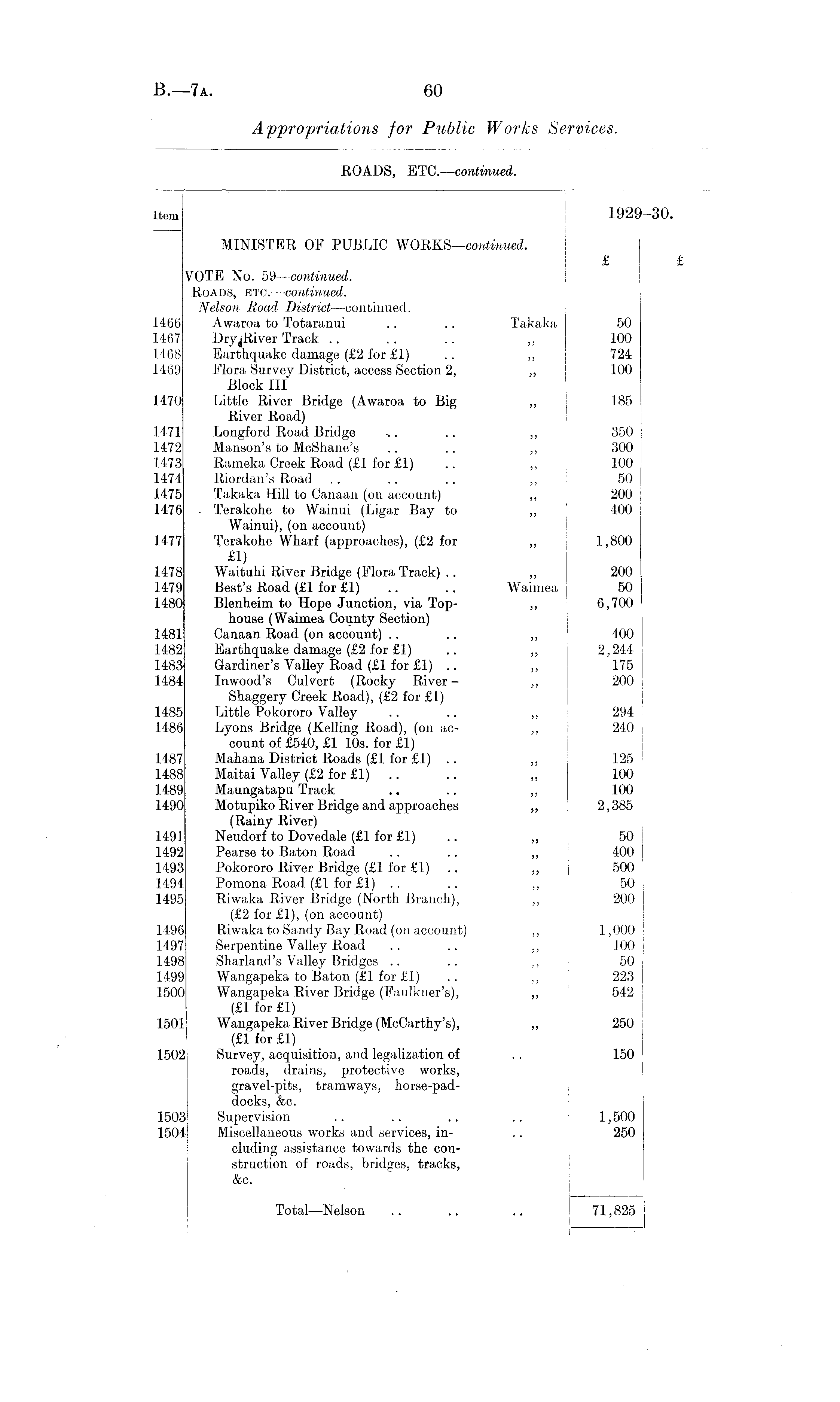 Item 1929—30. MINISTER OF PUBLIC WORKS—continued. £ £ VOTE No. 59 —continued. Roads, etc.—-continued. Nelson Road District —continued. 1466 Awaroa to Totaranui .. .. Takaka 50 1467 Track .. .. .. ,, 100 1468 Earthquake damage (£2 for £1) .. ,, 724 1469 Flora Survey District, access Section 2, „ 100 Block III 1470 Little River Bridge (Awaroa to Big ,, 185 River Road) 1471 Longford Road Bridge •>. .. „ 350 1472 Manson's to McSliane's .. .. ,, 300 1473 Rameka Creek Road (£1 for £1) .. ,, 100 1474 Riordan's Road .. .. .. ,, 50 1475 Takaka Hill to Canaan (on account) ,, 200 1476 • Terakohe to Wainui (Ligar Bay to ,, 400 Wainui), (on account) 1477 Terakohe Wharf (approaches), (£2 for ,, 1,800 £1) 1478 Waituhi River Bridge (Flora Track) .. ,, 200 1479 Best's Road (£1 for £1) .. .. Waimea j 50 1480 Blenheim to Hope Junction, via Top- „ 6,700 house (Waimea County Section) 1481 Canaan Road (on account) .. .. » ! 400 1482 Earthquake damage (£2 for £1) .. „ 2,244 1483 Gardiner's Valley Road (£1 for £1) .. ,, 175 1484 Inwood's Culvert (Rocky River - ,, 200 Shaggery Creek Road), (£2 for £1) 1485 Little Pokororo Valley .. .. ,, 294 1486 Lyons Bridge (Selling Road), (on ac- ,, 240 count of £540, £1 10s. for £1) 1487 Mahana District Roads (£1 for £1) .. ,, 125 1488 Maitai Valley (£2 for £1) .. .. ,, 100 1489 Maungatapu Track .. .. ,, 100 1490 Motupiko River Bridge and approaches „ 2,385 (Rainy River) 1491 Neudorf to Dovedale (£1 for £1) ,, 50 1492 Pearse to Baton Road .. .. ,, 400 1493 Pokororo River Bridge (£1 for £1) .. ,, 500 1494 Pomona Road (£1 for £1) .. .. ,, 50 1495 Riwaka River Bridge (North Branch), ,, 200 (£2 for £1), (on account) 1496 Riwaka to Sandy Bay Road (on account) ,, 1,000 1497 Serpentine Valley Road .. .. ,, 100 j 1498 Sharland's Valley Bridges .. .. ,, 50 j 1499 Wangapeka to Baton (£1 for £1) .. ,, 223 j 1500 Wangapeka River Bridge (Faulkner's), ,, 542 I (£1 for £1) 1501 Wangapeka River Bridge (McCarthv's), ,, 250 (£1 for £1) 1502 Survey, acquisition, and legalization of . . 150 ! roads, drains, protective works, gravel-pits, tramways, horse-pad-docks, &c. 1503 Supervision .. .. .. .. 1,500 1504 Miscellaneous works and services, in- .. 250 eluding assistance towards the construction of roads, bridges, tracks, &c. Total —Nelson .. .. .. 71,825