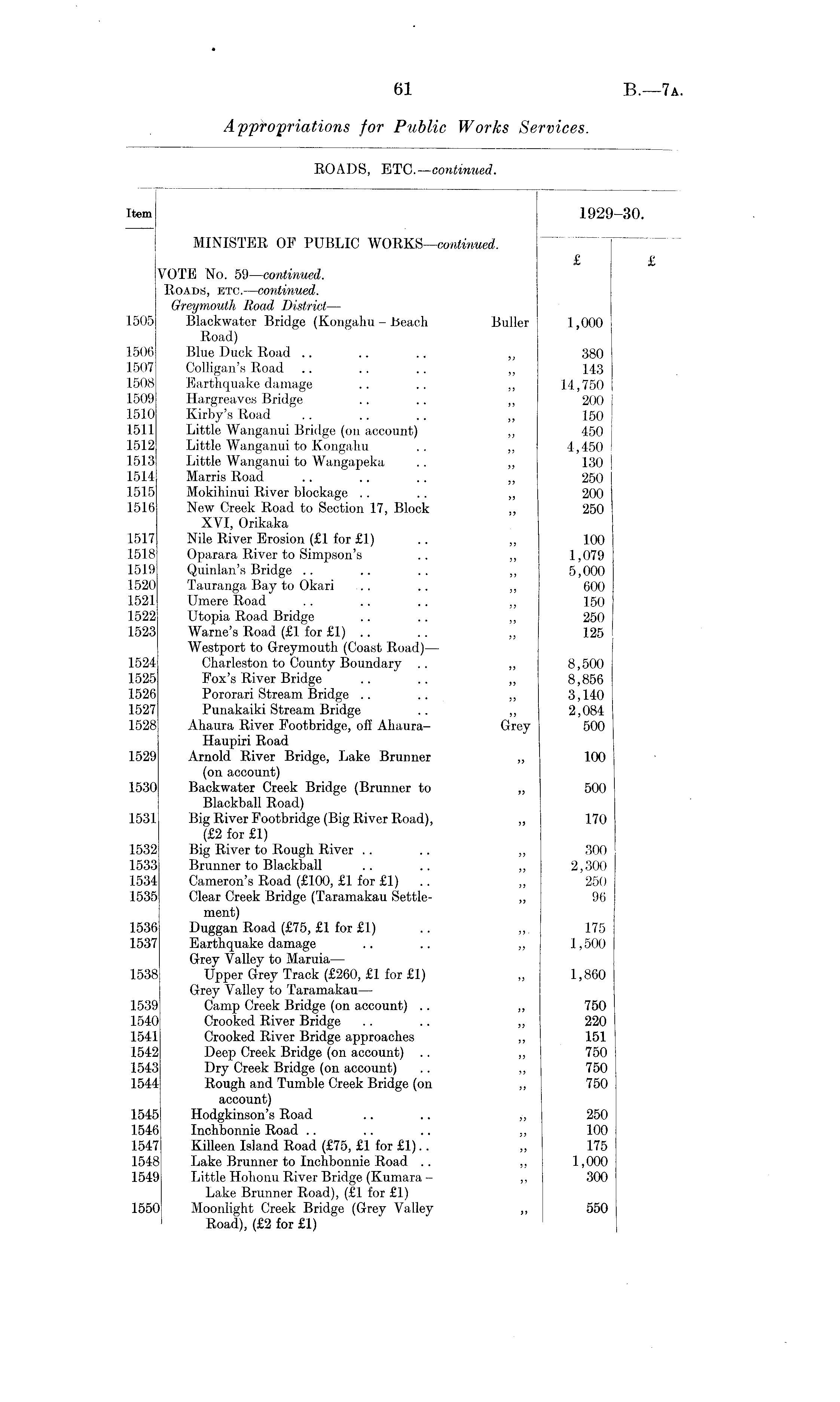 Item 1929-30. MINISTER OF PUBLIC WORKS —continued. £ £ VOTE No. 59 —continued. Roads, etc. —continued. Greymouth Road District — 1505 Blackwater Bridge (Kongahu - .beach Buller 1,000 Road) 1506 Blue Duck Road .. .. .. „ 380 1507 Colligan's Road .. .. .. ,, 14,3 1508 Earthquake damage .. .. „ 14,750 1509 Hargreaves Bridge .. .. „ 200 1510 Kirby's Road .. .. .. ,, 150 1511 Little Wanganui Bridge (on account) ,, 450 1512 Little Wanganui to Kongahu .. ,, 4,450 1513 Little Wanganui to Wangapeka .. ,, 130 1514 Marris Road .. .. .. ,, 250 1515 Mokihinui River blockage .. .. „ 200 1516 New Creek Road to Section 17, Block „ 250 XVI, Orikaka 1517 Nile River Erosion (£1 for £1) .. ,, 100 1518 Oparara River to Simpson's .. „ 1,079 1519 Quinlan's Bridge .. .. .. „ 5,000 1520 Tauranga Bay to Okari .. .. ,, 600 1521 Umere Road .. .. .. ,, 150 1522 Utopia Road Bridge .. .. „ 250 1523 Warne's Road (£1 for £1) .. .. ,, 125 Westport to Greymouth (Coast Road) — 1524 Charleston to County Boundary .. „ 8,500 1525 Fox's River Bridge .. .. ,, 8,856 1526 Pororari Stream Bridge .. .. ,, 3,140 1527 Punakaiki Stream Bridge .. ,, 2,084 1528 Ahaura River Footbridge, off Ahaura- Grey 500 Haupiri Road 1529 Arnold River Bridge, Lake Brunner „ 100 (on account) 1530 Backwater Creek Bridge (Brunner to „ 500 Blackball Road) 1531 Big River Footbridge (Big River Road), ,, 170 (£2 for £1) 1532 Big River to Rough River .. .. „ 300 1533 Brunner to Blackball .. .. ,, 2,300 1534 Cameron's Road (£100, £1 for £1) .. ,, 250 1535 Clear Creek Bridge (Taramakau Settle- „ 96 ment) 1536 Duggan Road (£75, £1 for £1) .. 175 1537 Earthquake damage .. .. ,, 1,500 Grey Valley to Maruia — 1538 Upper Grey Track (£260, £1 for £1) „ 1,860 Grey Valley to Taramakau — 1539 Camp Creek Bridge (on account) .. „ 750 1540 Crooked River Bridge .. .. ,, 220 1541 Crooked River Bridge approaches ,, 151 1542 Deep Creek Bridge (on account) .. ,, 750 1543 Dry Creek Bridge (on account) .. ,, 750 1544 Rough and Tumble Creek Bridge (on ,, 750 account) 1545 Hodgkinson's Road .. .. ,, 250 1546 Inchbonnie Road .. .. .. ,, 100 1547 Killeen Island Road (£75, £1 for £1).. ,, 175 1548 Lake Brunner to Inchbonnie Road .. ,, 1,000 1549 Little Hohonu River Bridge (Kumara - ,, 300 Lake Brunner Road), (£1 for £1) 1550 Moonlight Creek Bridge (Grey Valley ,, 550 Road), (£2 for £1)