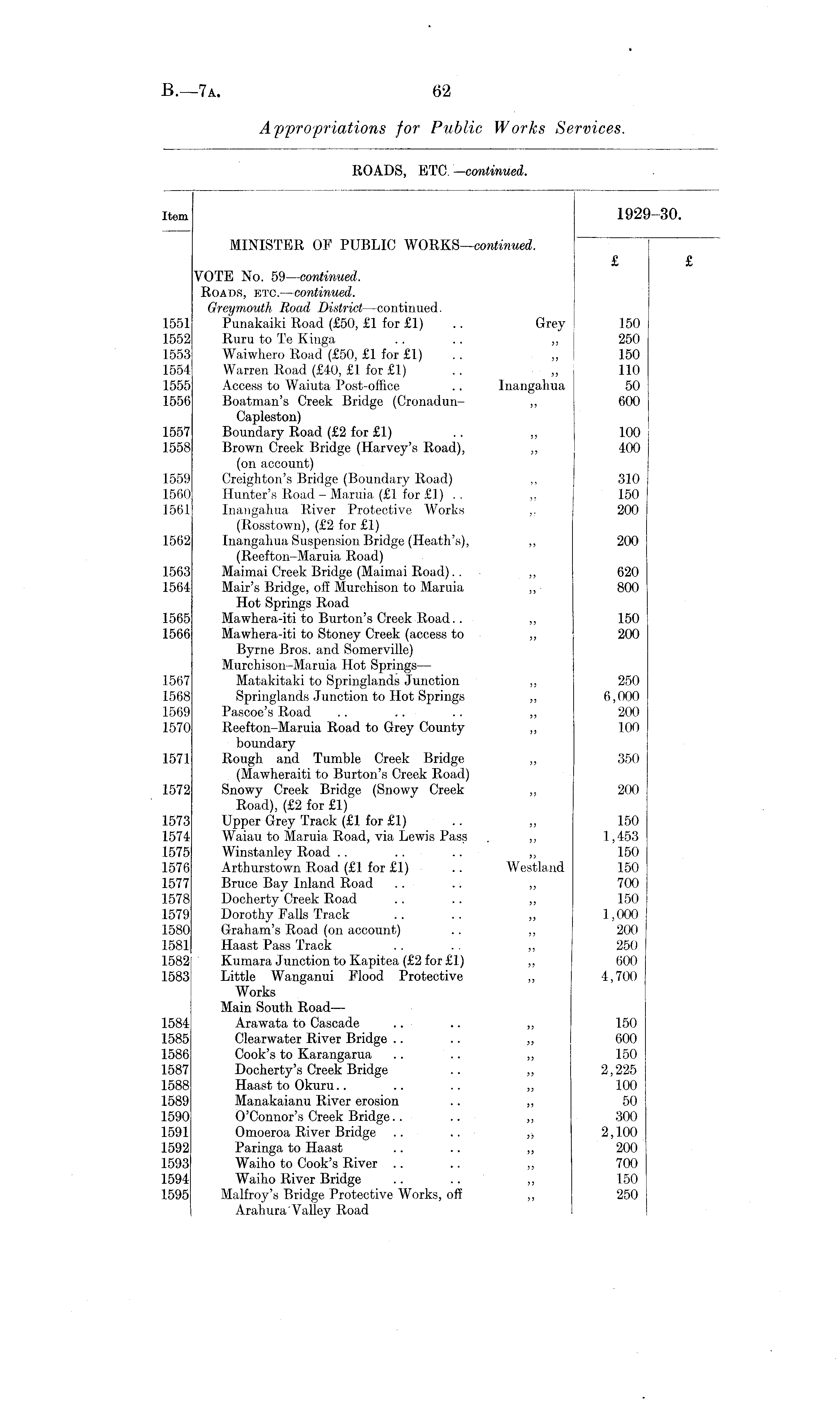 Item 1929—30. MINISTER OF PUBLIC WORKS—continued. £ £ VOTE No. 59 —continued. Roads, etc. —continued. Grey mouth Road District —continued. 1551 Punakaiki Road (£50, £1 for £1) .. Grey 150 1552 Ruru to Te Kinga .. .. ,, 250 1553 Waiwhero Road (£50, £1 for £1) „ 150 1554 Warren Road (£40, £1 for £1) .. ,, 110 1555 Access to Waiuta Post-office .. Inangahua 50 1556 Boatman's Creek Bridge (Cronadun- ,, 600 Capleston) 1557 Boundary Road (£2 for £1) . . ,, 100 1558 Brown Creek Bridge (Harvey's Road), ,, 400 (on account) 1559 Creighton's Bridge (Boundary Road) ,, 310 1560 Hunter's Road - Maruia (£1 for £1) .. ,, 150 1561 Inangahua River Protective Works ,, 200 (Rosstown), (£2 for £1) 1562 Inangahua Suspension Bridge (Heath's), ,, 200 (Reefton-Maruia Road) 1563 Maimai Creek Bridge (Maimai Road).. „ 620 1564 Mair's Bridge, off Murehison to Maruia ,, 800 Hot Springs Road 1565 Mawhera-iti to Burton's Creek Road.. ,, 150 1566 Mawhera-iti to Stoney Creek (access to ,, 200 Byrne Bros, and Somerville) Murchison-Maruia Hot Springs — 1567 Matakitaki to Springlands Junction ,, 250 1568 Springlands Junction to Hot Springs „ „ 6,000 1569 Pascoe's Road .. .. .. „ 200 1570 Reefton-Maruia Road to Grey County „ 100 boundary 1571 Rough and Tumble Creek Bridge ,, 350 (Mawheraiti to Burton's Creek Road) 1572 Snowy Creek Bridge (Snowy Creek ,, 200 Road), (£2 for £1) 1573 Upper Grey Track (£1 for £1) .. ,, 150 1574 Waiau to Maruia Road, via Lewis Pass . „ 1,453 1575 Winstanley Road .. .. .. „ 150 1576 Arthurstown Road (£1 for £1) .. Westland 150 1577 Bruce Bay Inland Road .. .. „ 700 1578 Docherty Creek Road .. .. ,, 150 1579 Dorothy Falls Track .. .. ,, 1,000 1580 Graham's Road (on account) .. „ 200 1581 Haast Pass Track .. .. „ 250 1582 Kumara Junction to Kapitea (£2 for £1) ,, 600 1583 Little Wanganui Flood Protective „ 4,700 Works Main South Road — 1584 Arawata to Cascade .. .. „ 150 1585 Clearwater River Bridge .. .. ,, 600 1586 Cook's to Karangarua .. .. ,, 150 1587 Docherty's Creek Bridge .. ,, 2,225 1588 Haast to Okuru.. .. .. ,, 100 1589 Manakaianu River erosion .. ,, 50 1590 O'Connor's Creek Bridge.. .. ,, 300 1591 Omoeroa River Bridge .. .. 2,100 1592 Paringa to Haast .. .. ,, 200 1593 Waiho to Cook's River .. .. ,, 700 1594 Waiho River Bridge .. .. ,, 150 1595 Malfroy's Bridge Protective Works, off ,, 250 Arahura'Valley Road