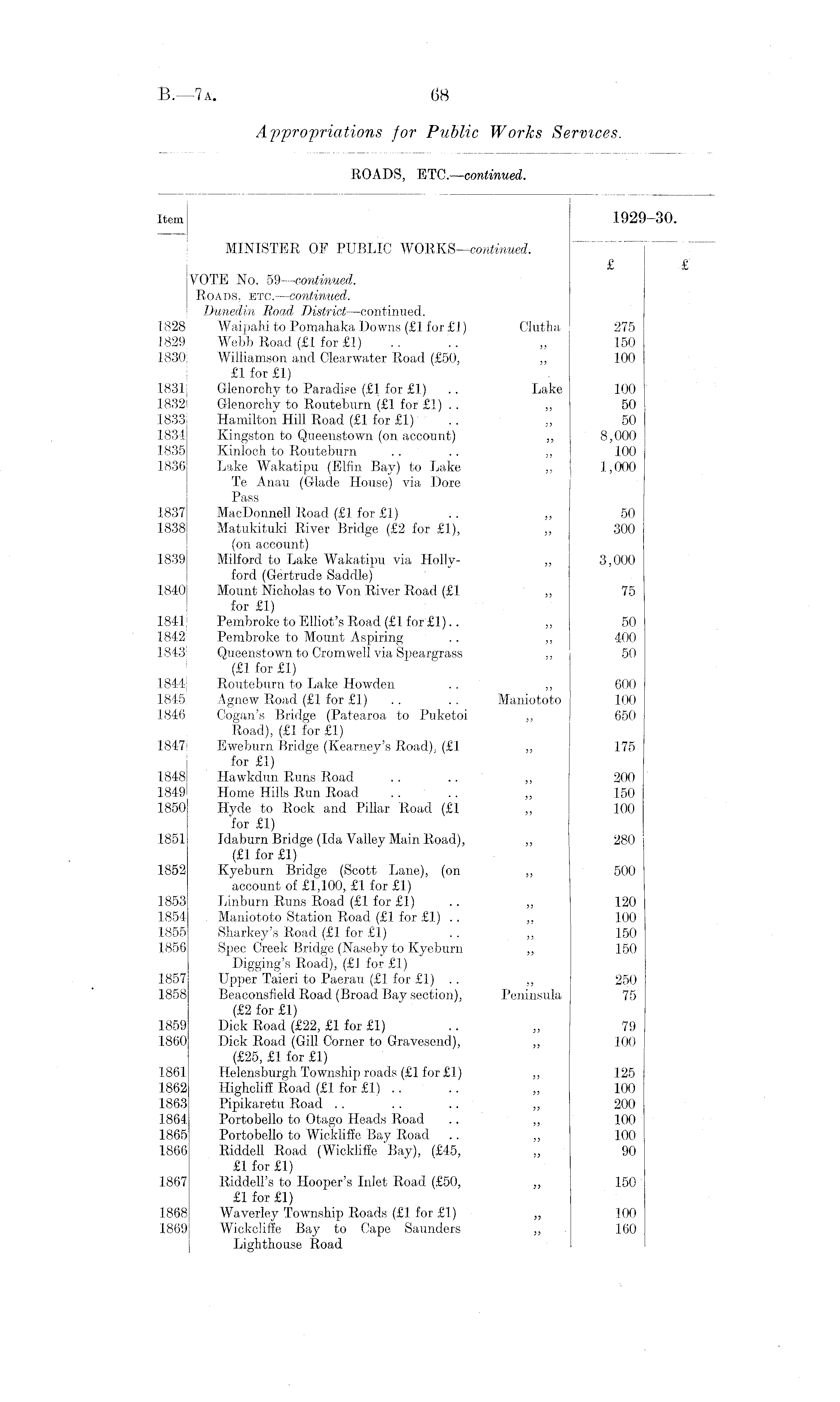Item 1929—30. MINISTER OF PUBLIC WORKS—continued. £ £ VOTE No. 59—continued. Roads, etc. —continued. Dunedin Road District —continued. 1828 Waipahi to Pomahaka Downs (£1 for £J) Clutha 275 1829 Webb Road (£1 for £1) .. .. ,, 150 1830 Williamson and Clearwater Road (£50, „ 100 £1 for £1) 1831 Glenorchy to Paradise (£1 for £1) .. Lake 100 1832 Glenorcliv to Routeburn (£1 for £1) . . „ 50 1833 Hamilton Hill Road (£1 for £1) .. ,, 50 1831 Kingston to Queenstown (on account) ,, 8,000 1835 Kinloch to Routeburn .... ,, 100 1836 Lake Wakatipu (Elfin Bay) to Lake „ I 1,000 Te Anau (Glade House) via Dore Pass 1837 MacDonnell Road (£1 for £1) .. ,, 50 1838 Matukituki River Bridge (£2 for £1), ,, 300 (on account) 1839 Milford to Lake Wakatipu via Holly- „ 3,000 ford (Gertrude Saddle) 1840 Mount Nicholas to Von River Road (£1 „ 75 for £1) 1841 Pembroke to Elliot's Road (£1 for £1).. ,, 50 1842 Pembroke to Mount Aspiring .. ,, 400 1843 Queenstown to Cromwell via Speargrass ., 50 (£1 for £1) 1844 Routeburn to Lake Howden . . ,, 600 1845 Agnew Road (£1 for £1) .. .. Maniototo 100 1846 Cogan's Bridge (Patearoa to Puketoi „ 650 Road), (£1 for £1) 1847 Eweburn Bridge (Kearney's Road), (£1 ,, 175 for £1) 1848 Hawkdun Runs Road .. .. ,, 200 1849 Home Hills Run Road . . .. ,, 150 1850 Hyde to Rock and Pillar Road (£1 ,, 100 for £1) 1851 Idaburn Bridge (Ida Valley Main Road), ,, 280 (£1 for £1) 1852 Kyeburn Bridge (Scott Lane), (on ,, 500 account of £1,100, £1 for £1) 1853 Linburn Runs Road (£1 for £1) .. ,, 120 1854 Maniototo Station Road (£1 for £1) .. „ 100 1855 Sharkey's Road (£1 for £1) . . ,, 150 1856 Spec Creek Bridge (Naseby to Kyeburn „ 150 Digging's Road), (£1 for £1) 1857 Upper Taieri to Paerau (£1 for £1) .. ,, 250 1858 Beaconsfield Road (Broad Bay section), Peninsula 75 (£2 for £1) 1859 Dick Road (£22, £1 for £1) .. ,, 79 1860 Dick Road (Gill Corner to Gravesend), ,, 100 (£25, £1 for £1) 1861 Helensburgh Township roads (£1 for £1) ,, 125 1862 Highcliff Road (£1 for £1) .. .. „ 100 1863 Pipikaretu Roacl . . . . .. ,, 200 1864 Portobello to Otago Heads Road .. ,, 100 1865 Portobello to Wickliffe Bay Road .. ,, 100 1866 Riddell Road (Wickliffe Bay), (£45, ,, 90 £1 for £1) 1867 Riddell's to Hooper's Inlet Road (£50, „ 150 £1 for £1) 1868 Waverley Township Roads (£1 for £1) „ 100 1869 Wickclifle Bay to Cape Saunders ,, 160 Lighthouse Road