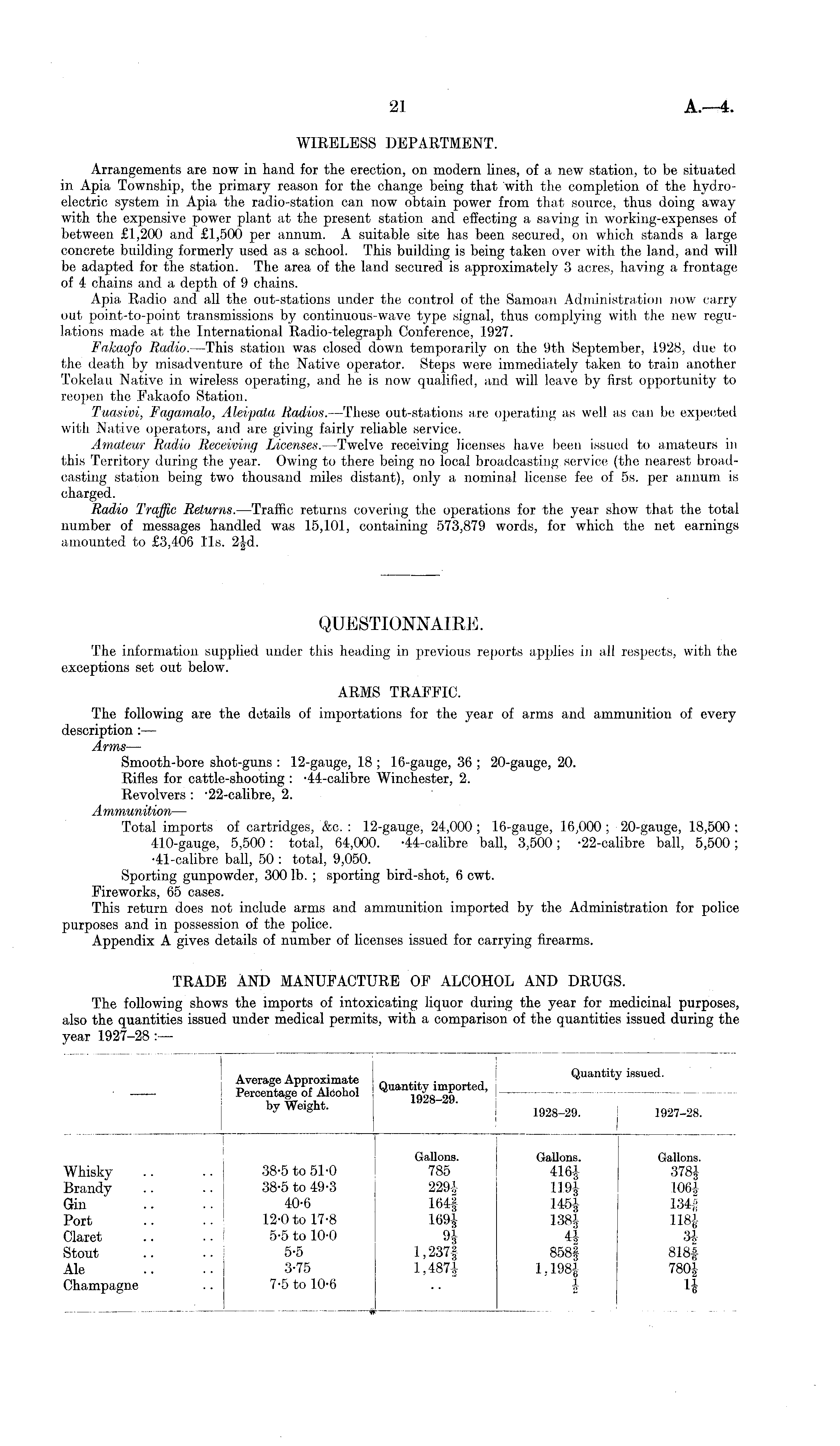 WIRELESS DEPARTMENT. Arrangements are now in hand for the erection, on modern lines, of a new station, to be situated in Apia Township, the primary reason for the change being that with the completion of the hydroelectric system in Apia the radio-station can now obtain power from that source, thus doing away with the expensive power plant at the present station and effecting a saving in working-expenses of between £1,200 and £1,500 per annum. A suitable site has been secured, on which stands a large concrete building formerly used as a school. This building is being taken over with the land, and will be adapted for the station. The area of the land secured is approximately 3 acres, having a frontage of 4 chains and a depth of 9 chains. Apia Radio and all the out-stations under the control of the Samoan Administration now carry out point-to-point transmissions by continuous-wave type signal, thus complying with the new regulations made at the International Radio-telegraph Conference, 1927. Fakaofo Radio.—This station was closed down temporarily on the 9th September, 1928, due to the death by misadventure of the Native operator. Steps were immediately taken to train another Tokelau Native in wireless operating, and he is now qualified, and will leave by first opportunity to reopen the Fakaofo Station. Tuasivi, Fagamalo, Aleipata Radios. —These out-stations are operating as well as can be expected with Native operators, and are giving fairly reliable service. Amateur Radio Receiving Licenses.—Twelve receiving licenses have been issued to amateurs in this Territory during the year. Owing to there being no local broadcasting service (the nearest broadcasting station being two thousand miles distant), only a nominal license fee of ss. per annum is charged. Radio Traffic Returns. —Traffic returns covering the operations for the year show that the total number of messages handled was 15,101, containing 573,879 words, for which the net earnings amounted to £3,406 l'ls. 2|d. QUESTIONNAIRE. The information supplied under this heading in previous reports applies in all respects, with the exceptions set out below. ARMS TRAFFIC. The following are the details of importations for the year of arms and ammunition of every description:— Arms — Smooth-bore shot-guns : 12-gauge, 18 ; 16-gauge, 36 ; 20-gauge, 20. Rifles for cattle-shooting : -44-calibre Winchester, 2. Revolvers : "22-calibre, 2. Ammunition — Total imports of cartridges, &c. : 12-gauge, 24,000 ; 16-gauge, 16,000 ; 20-gauge, 18,500 ; 410-gauge, 5,500: total, 64,000. -44-calibre ball, 3,500; -22-calibre ball, 5,500; •41-calibre ball, 50 : total, 9,050. Sporting gunpowder, 300 lb. ; sporting bird-shot, 6 cwt. Fireworks, 65 cases. This return does not include arms and ammunition imported by the Administration for police purposes and in possession of the police. Appendix A gives details of number of licenses issued for carrying firearms. TRADE AND MANUFACTURE OF ALCOHOL AND DRUGS. The following shows the imports of intoxicating liquor during the year for medicinal purposes, also the quantities issued under medical permits, with a comparison of the quantities issued during the year 1927-28 : —